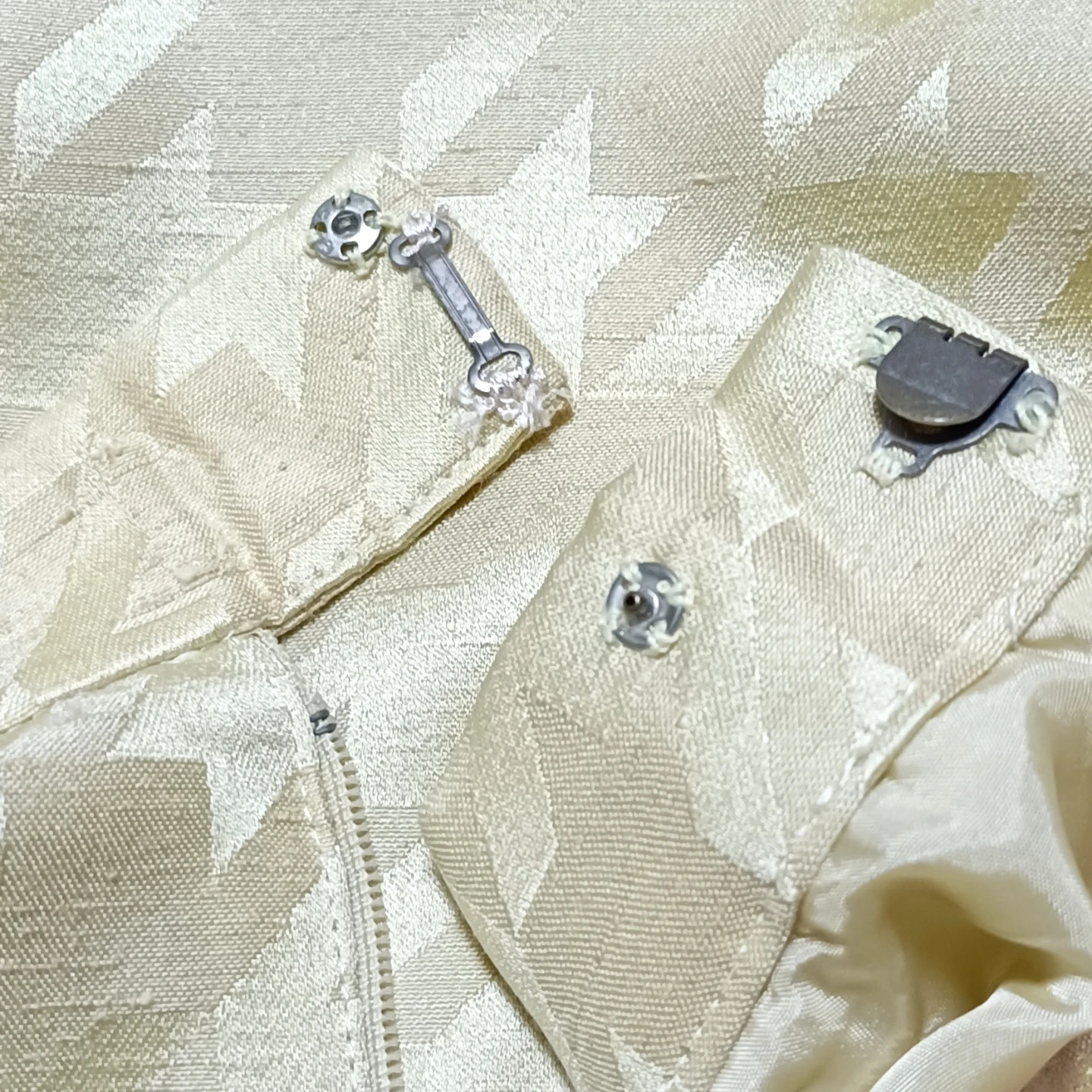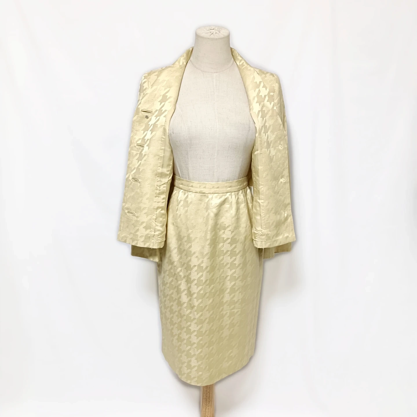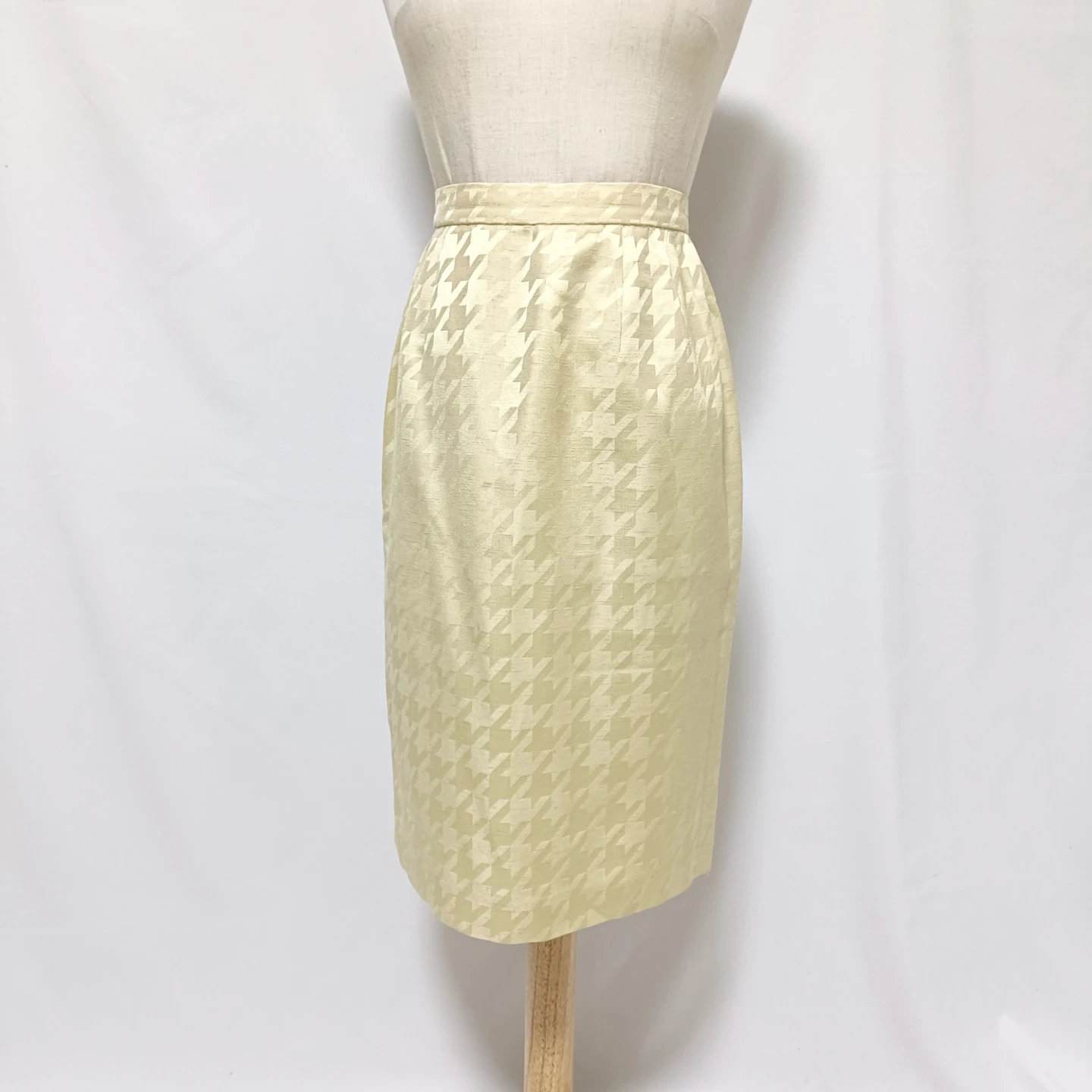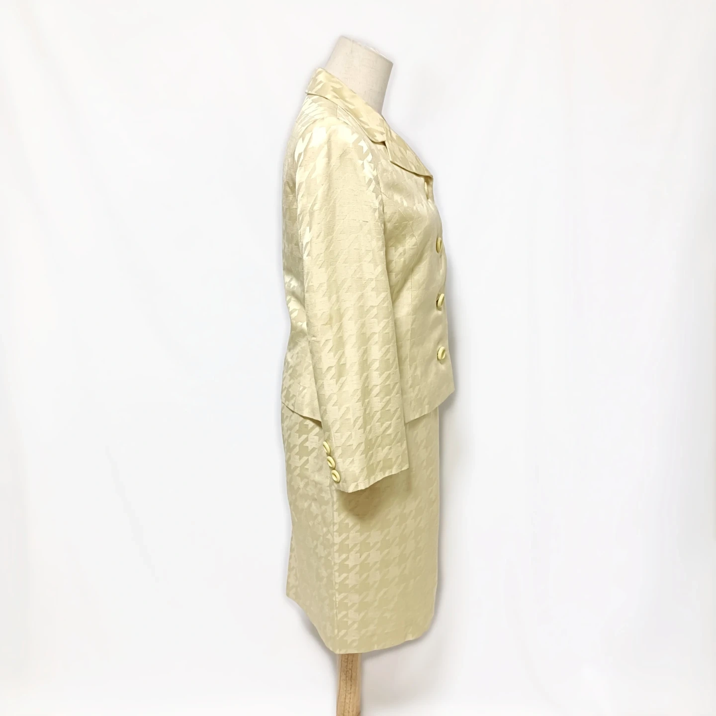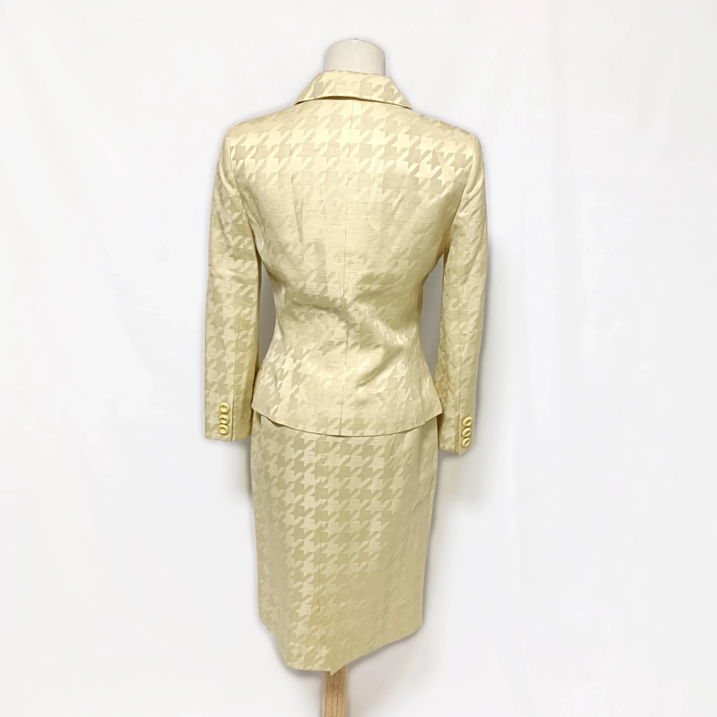 ご覧いただきありがとうございます! 日本を代表するメゾン「ユキトリイ」の、非常に上品で高級感あふれるスカートスーツです。 淡いイエロー(クリーム色)に、光の加減で浮かび上がる千鳥格子(ハウンドトゥース)のジャガード織りが、お顔周りをパッと明るく華やかに演出してくれます。 入学式・卒業式などのセレモニーから、結婚式、パーティー、お食事会まで、特別な一日にふさわしい一着です。 □商品名□ ユキトリイ シルク混 千鳥格子 セットアップ スーツ イエロー 9号 M □ブランド□ YUKI TORII ユキトリイ □表記サイズ□ 9号(M相当) □実寸サイズ(cm) □ 【床置きサイズ】 ジャケット 着丈:52 肩幅:38 身幅︰43 袖丈:54 スカート ウエスト︰32 着丈︰61 ※実寸につきまして多少の誤差はご了承ください。 ※表記サイズだけではなく実寸のサイズをご確認ください。 □カラー□ イエロー □素材□ 表地:アクリル 50% アセテート 45% 絹(シルク) 5% 裏地:キュプラ 100% □コンディション□ 目立った汚れやダメージなど特にございません。 ※汚れはできる限り写真にて掲載しております。まずは画像をご確認ください。 どうぞよろしくお願い致します。 □商品管理番号□ K3-W-5635