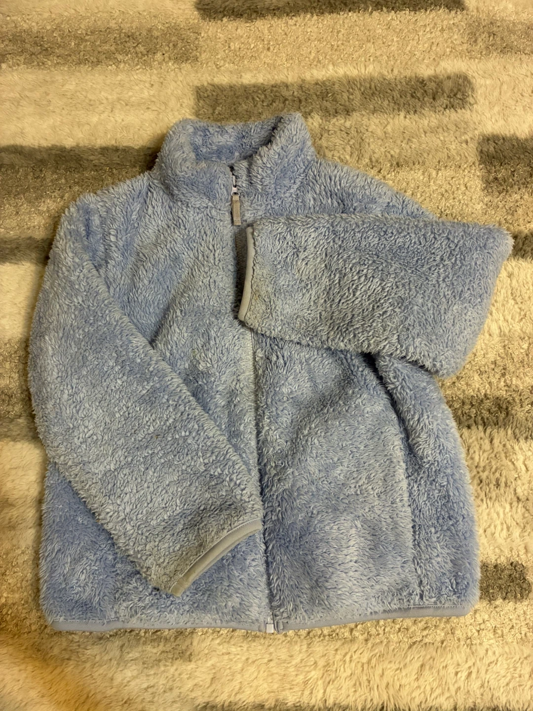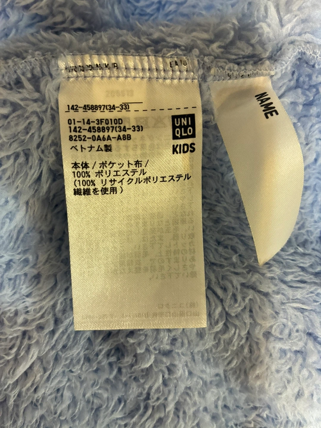 ユニクロのキッズフリースジャケットです。 ・ブランド:ユニクロ ・サイズ:キッズ ・色:水色 ・素材:100% ポリエステル ・使用感あり、袖口に汚れあり 中古品であることをご了承ください。 自宅まで取りに来て頂けると助かります! 場所は宮前平1丁目です