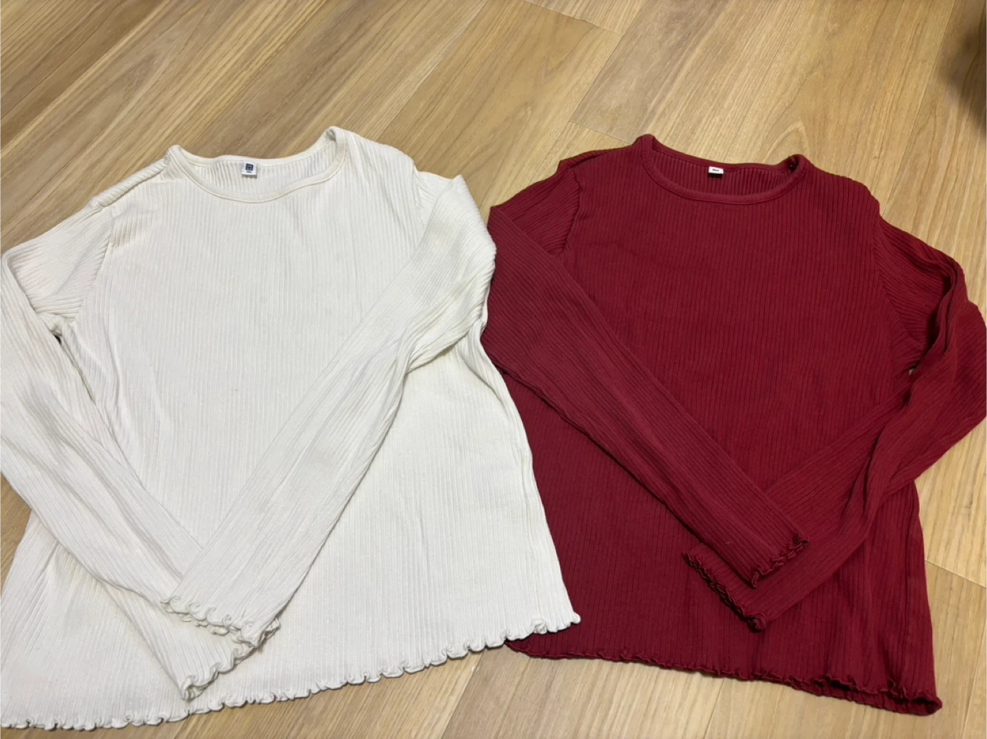ユニクロのキッズ長袖リブTシャツ 2枚セットです ・ブランド:ユニクロ ・色:白と赤 ・素材:96% 綿、4% ポリウレタン ・サイズ:キッズ 使用感はややありますが、 結構丈夫な生地なので普段使いにオススメです(^^) ※白がうっすら、いくつかシミありますので、お安くしました!気になる方はお控えください。 ワンピース下に着たりと重宝はしました。 姉妹でクリスマスなどにも😊