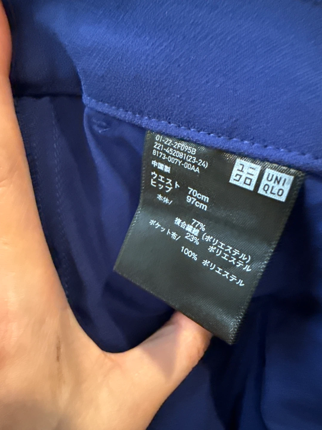 ユニクロのパンツです ・ブランド:ユニクロ ・サイズ:70cm ・色:ロイヤルブルー ・素材:ポリエステル テロつとして綺麗な落ち感のある本当にキレイなラインのパンツです。 本当は自分で履きた いのですが、サイズが合わなくなってしまいましたためお譲りしたいと思います💦 形が綺麗でイロチ買いして黒はヘビロテしていたのですがこちらのお色はほとんど実着用がないままサイズが合わなくなってしまいました…。 中古品であることご了承ください