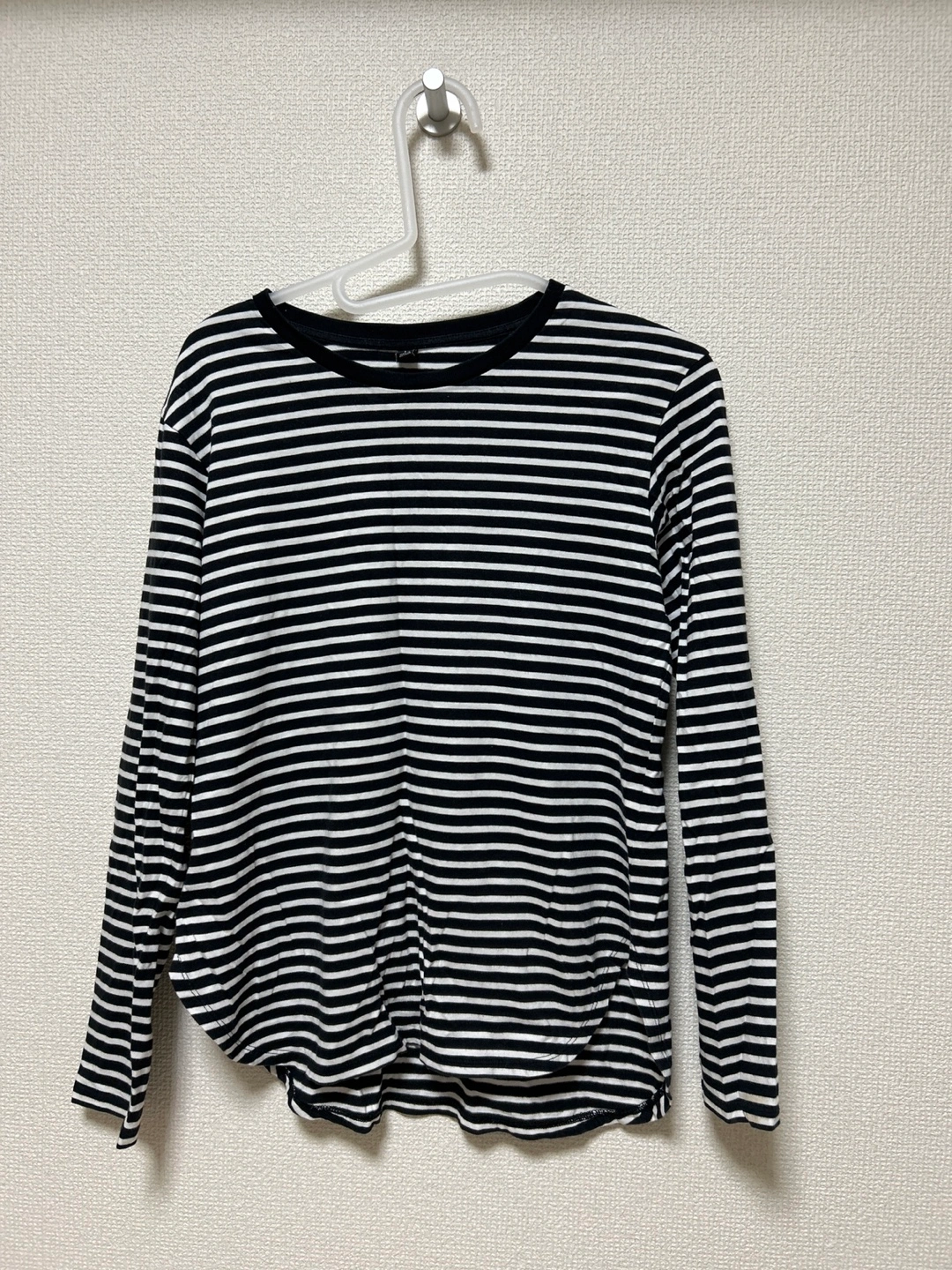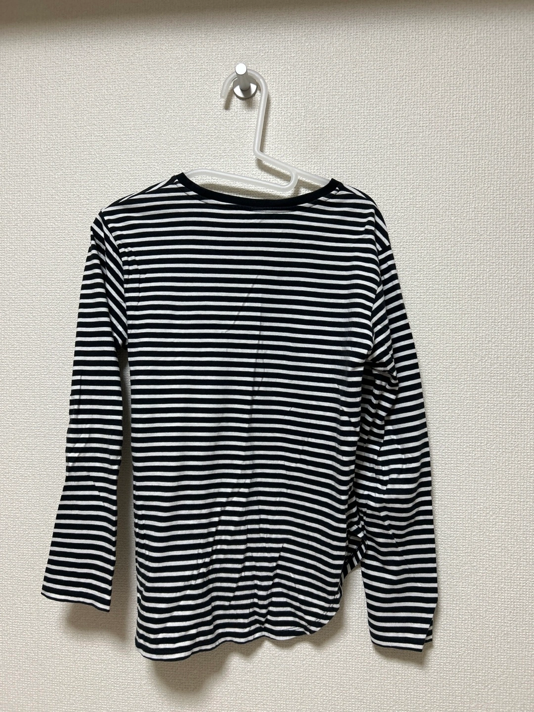 ・カラー:白、黒 ・長袖 ・ボーダー柄 ・使用感あり 【商品名】ボーダー長袖Tシャツ(ブラック×ホワイト) 【サイズ】S 【状態】やや使用感がありますが、目立ったシミや穴はありません。全体的にきれいな印象です。 【説明】 定番のボーダーデザインの長袖カットソーです。 程よくフィットするシルエットで、一枚で着ても、インナーとしても活躍します。 黒×白の組み合わせで、カジュアルにもシンプルコーデにも使いやすいです。 【素材】タグ記載不明(やわらかく、やや伸縮性のある素材です)
