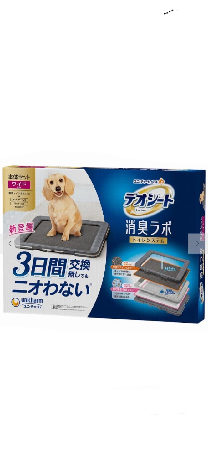 ユニチャームのデオシート、消臭ラボ(ワイド)です。 定価ですとかなりお高いのでお得かと思います。(画像2参考) 【情報】 ブランド:ユニ・チャーム 商品名:デオシート 消臭ラボ サイズ:ワイド 【内容】 本体 フィルター1枚 マット3枚の、出品です。 我が家のワンコは、足を上げておしっこするので、1回だけ使用し、我が家のワンコにはフラットタイプのトイレは合わないので出品しました。 消毒済み 中古品であることご了承ください