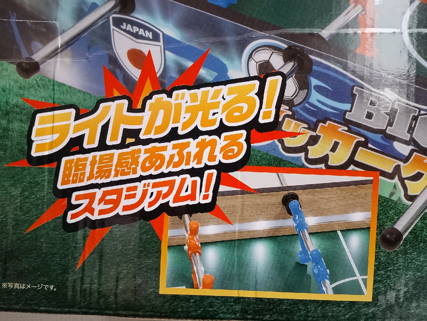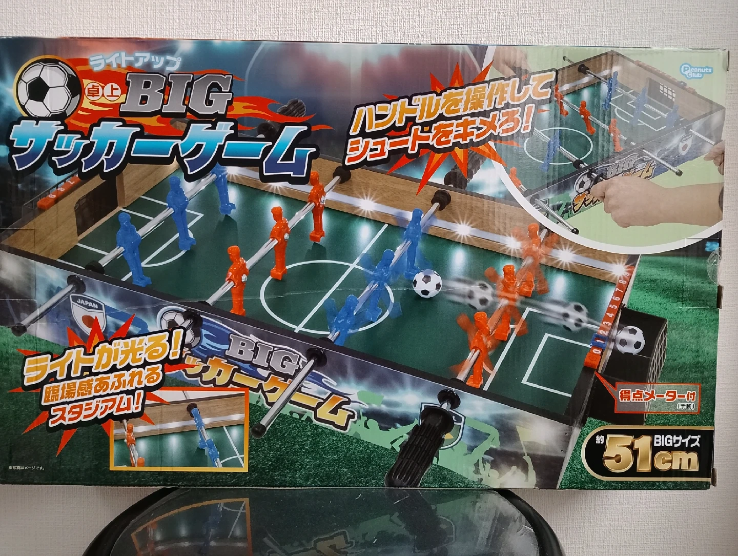 ハンドルを操作してシュートを決めろ! 約51cmのBIGサイズな卓上サッカーゲームです。 ライトが光り臨場感あふれるスタジアムを再現! 得点メーター付き(手動) バージョンはJAPAN VS BRAZILが入ってます。 新品未使用。