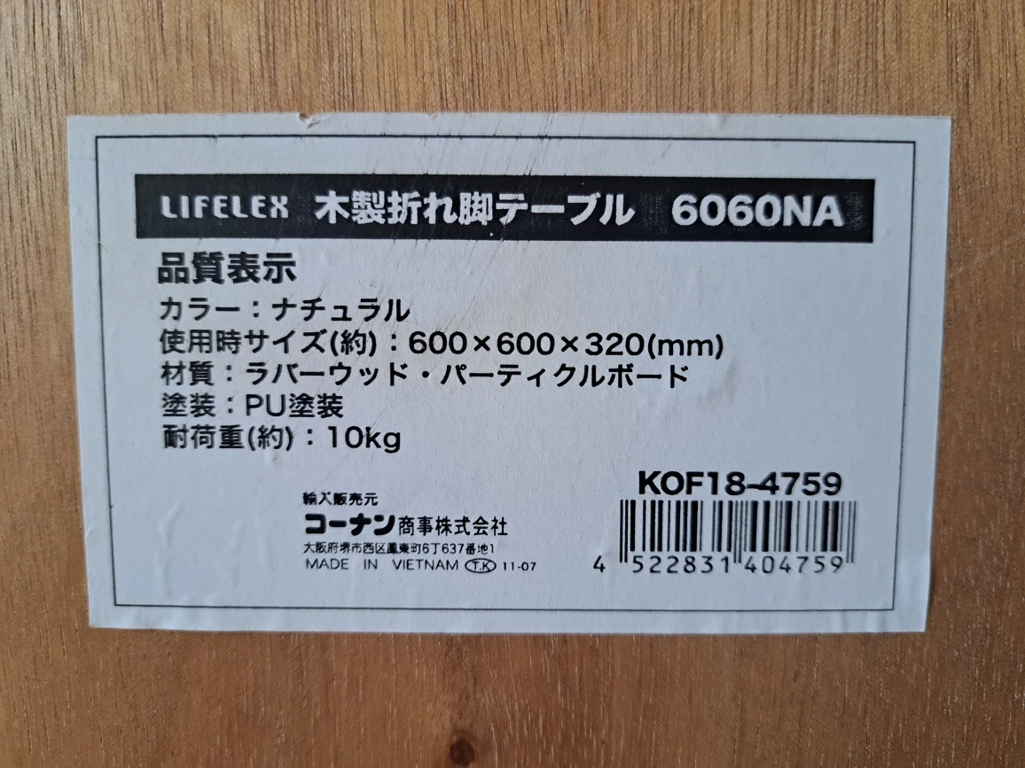 ライフレックスの木製折りたたみテーブルです。 帰国しますので良かったらお取りください。 【情報】 ブランド:ライフレックス 型番:6060NA サイズ:約600×600×320mm 素材:ラバーウッド、パーティクルボード 塗装:PU塗装 耐荷重:約10kg 【状態】 使用感はありますが、目立つ傷はありません。 ご不明点があればお気軽にご連絡ください。