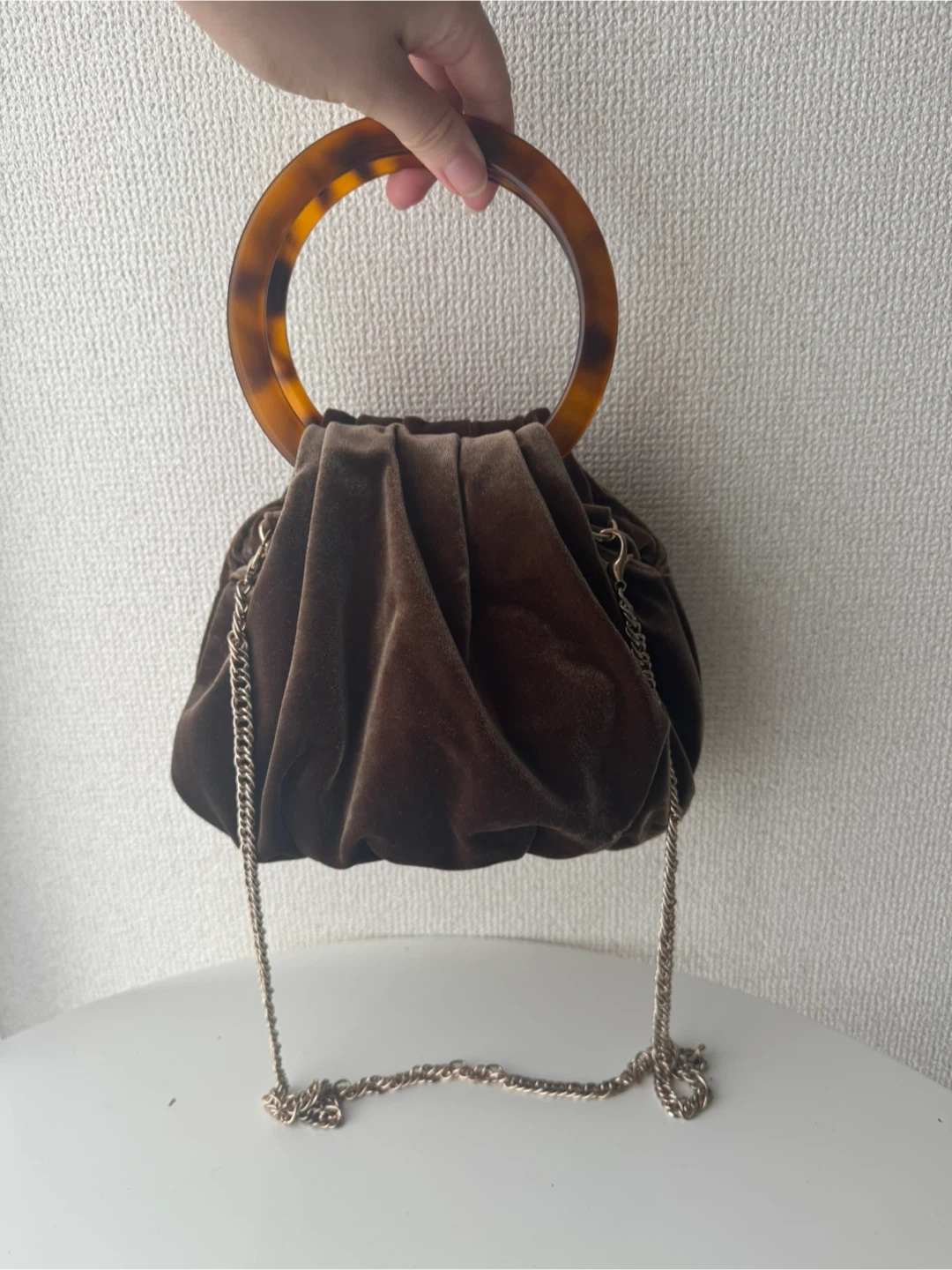 ラグナムーンのハンドバッグです ・カラー:ブラウン ・素材:ベロアのような生地 ・持ち手:べっ甲風の丸い持ち手 ・ショルダーチェーン付き ・内側にLAGUNA MOONのラベルあり 駅のホームまで持って行けます。
