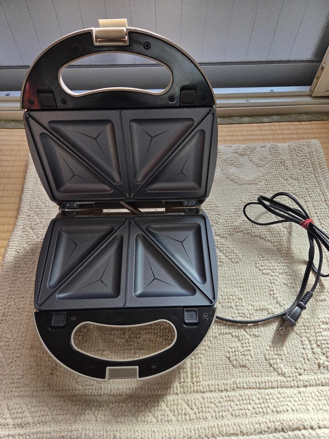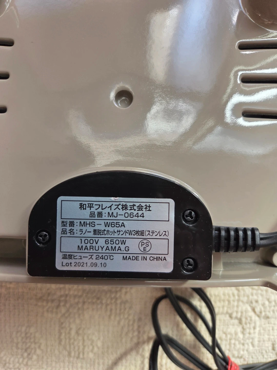 ホットサンドメーカーです。 【情報】 ブランド:ラノー 型番:MHS-W65A 定格:100V 650W 【状態】 数回使用してます。 ・ワッフルプレート ・焼きおにぎりプレート ・おにぎりの型 は未使用です 【付属品】 ホットサンドプレート、ワッフルプレート、焼きおにぎりプレート、おにぎりの型 箱はありますが箱にダメージ箇所があります。 保証書はありません。 ※※中古品である事をご了承ください。 ご覧いただきありがとうございます。 お渡しの日時等はご相談させて下さい。 よろしくお願いいたします。