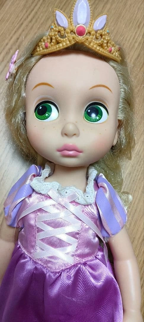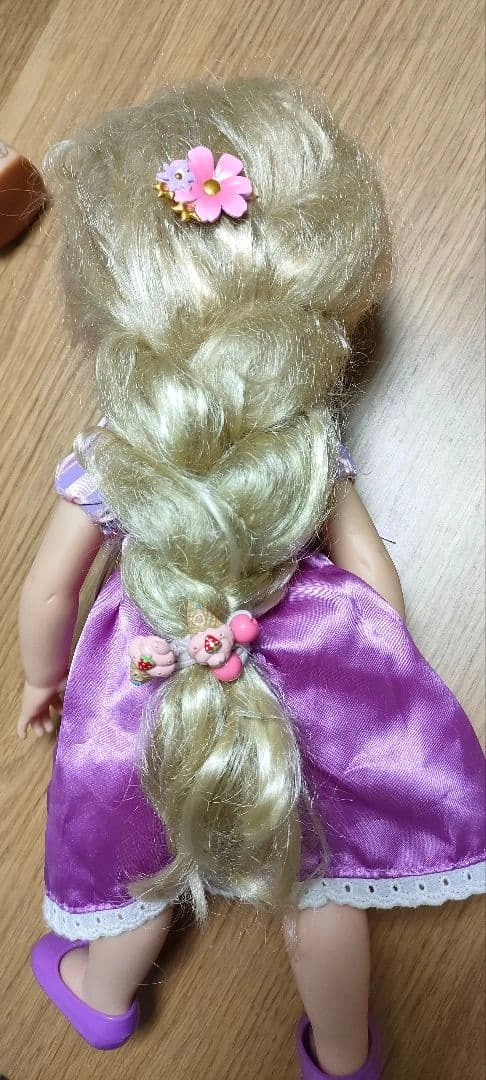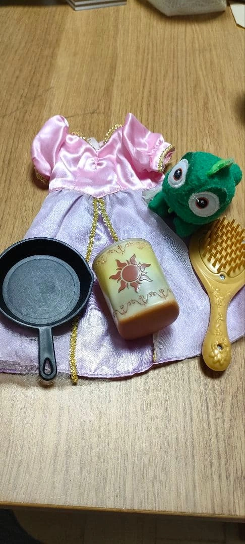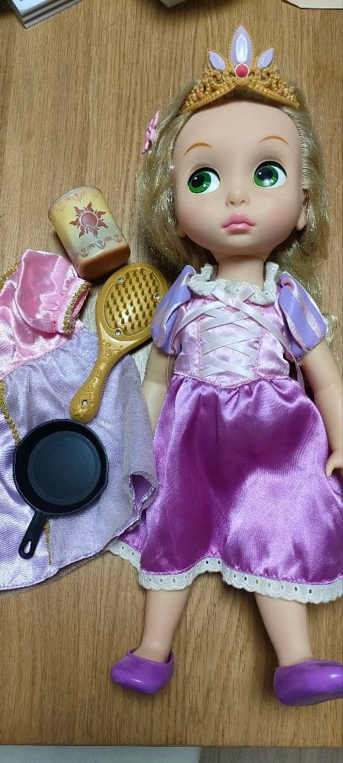 数年前に購入し、子供が使用していました。 使用感があり、髪の毛は絡んでしまい三つ編みにしています。(髪をとかすのは難しいと思います) 高さ35センチ、アルコールで消毒済み。 着替えのドレス、ティアラ、フライパン、ランタン、ブラシ、パスカルのセットです。 「ミッキーとミニーのラプンツェル」絵本のおまけ付きです! 自宅での長期保管であり中古です。使用感あり、細かい汚れ等気になさらない方にご検討頂けたらと思います。 ご希望の方はお気軽にご連絡ください。