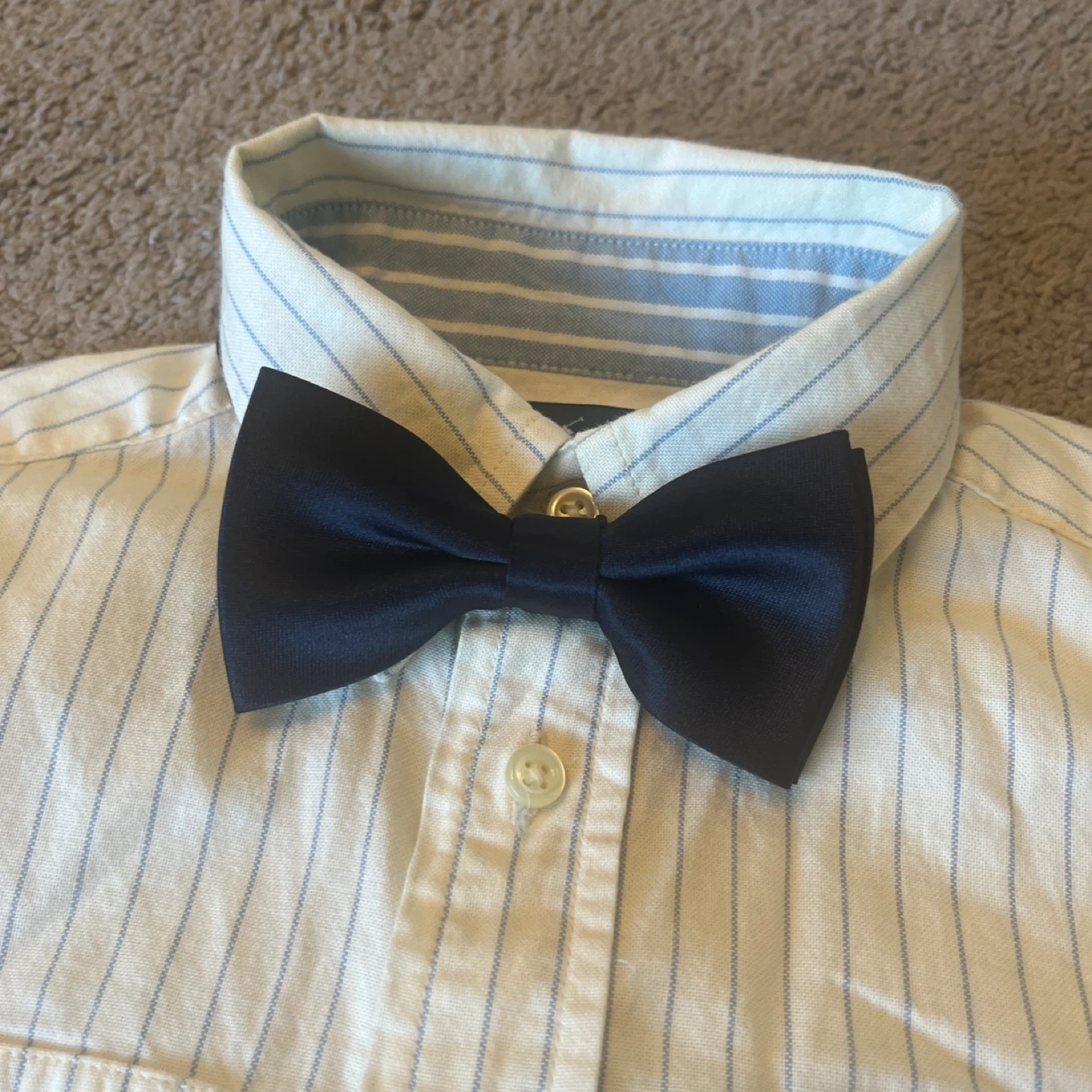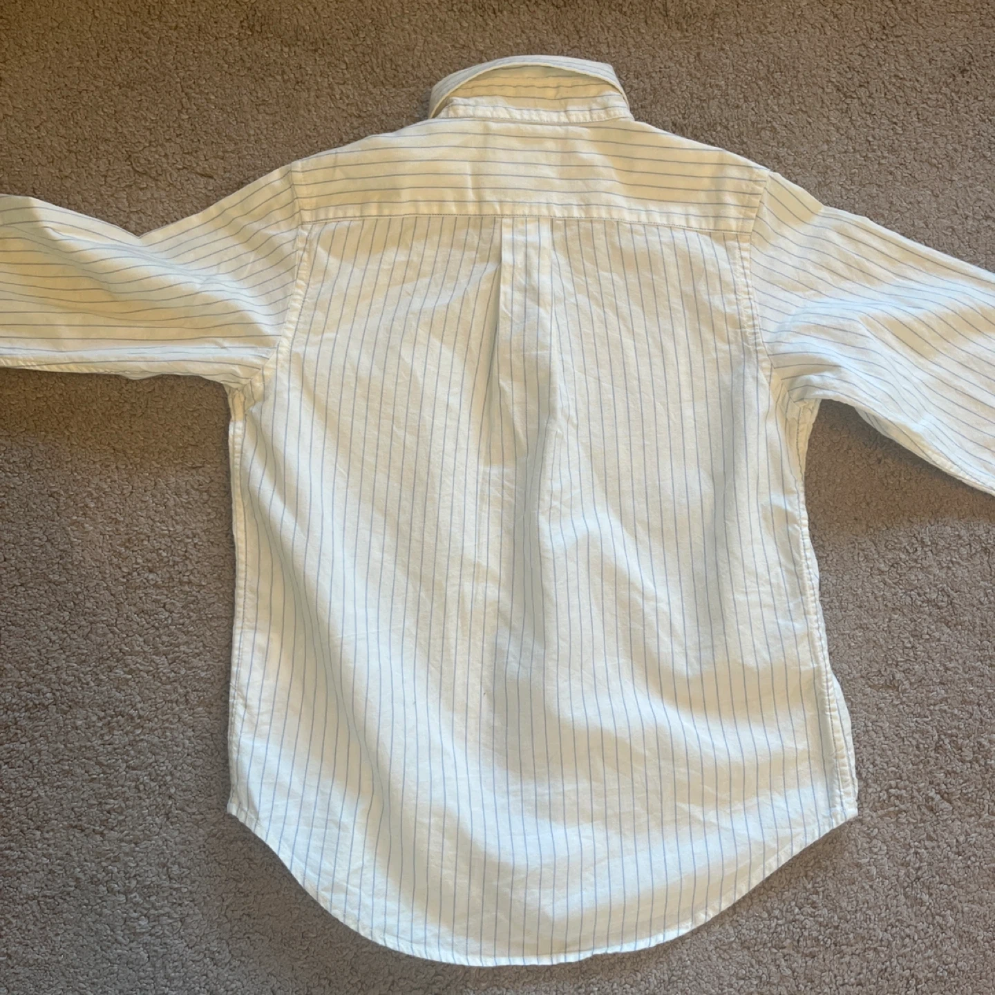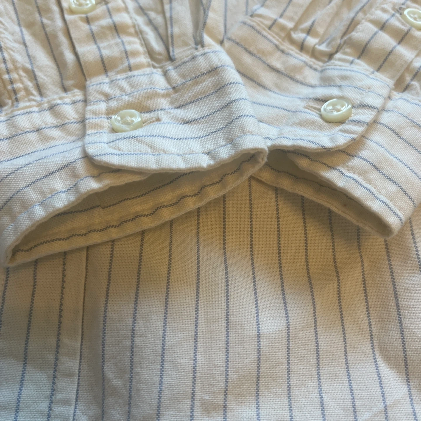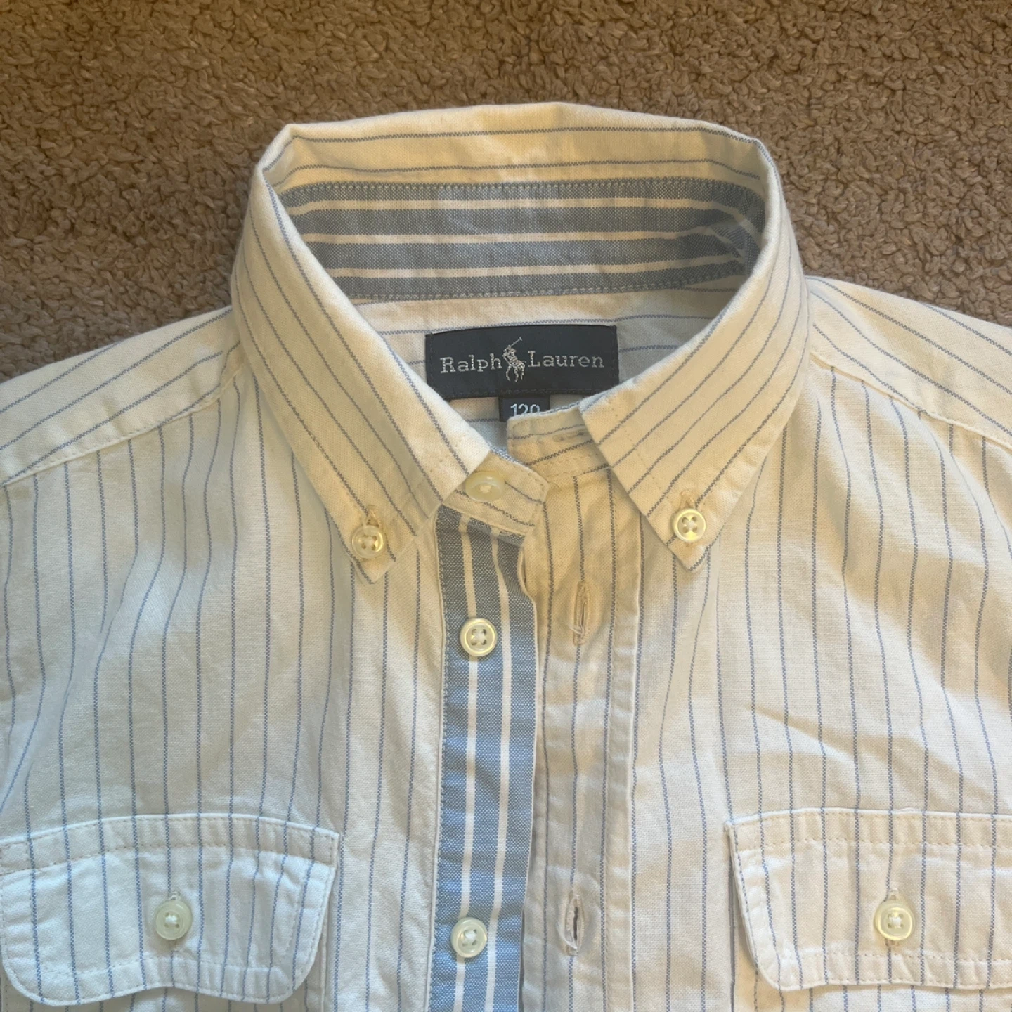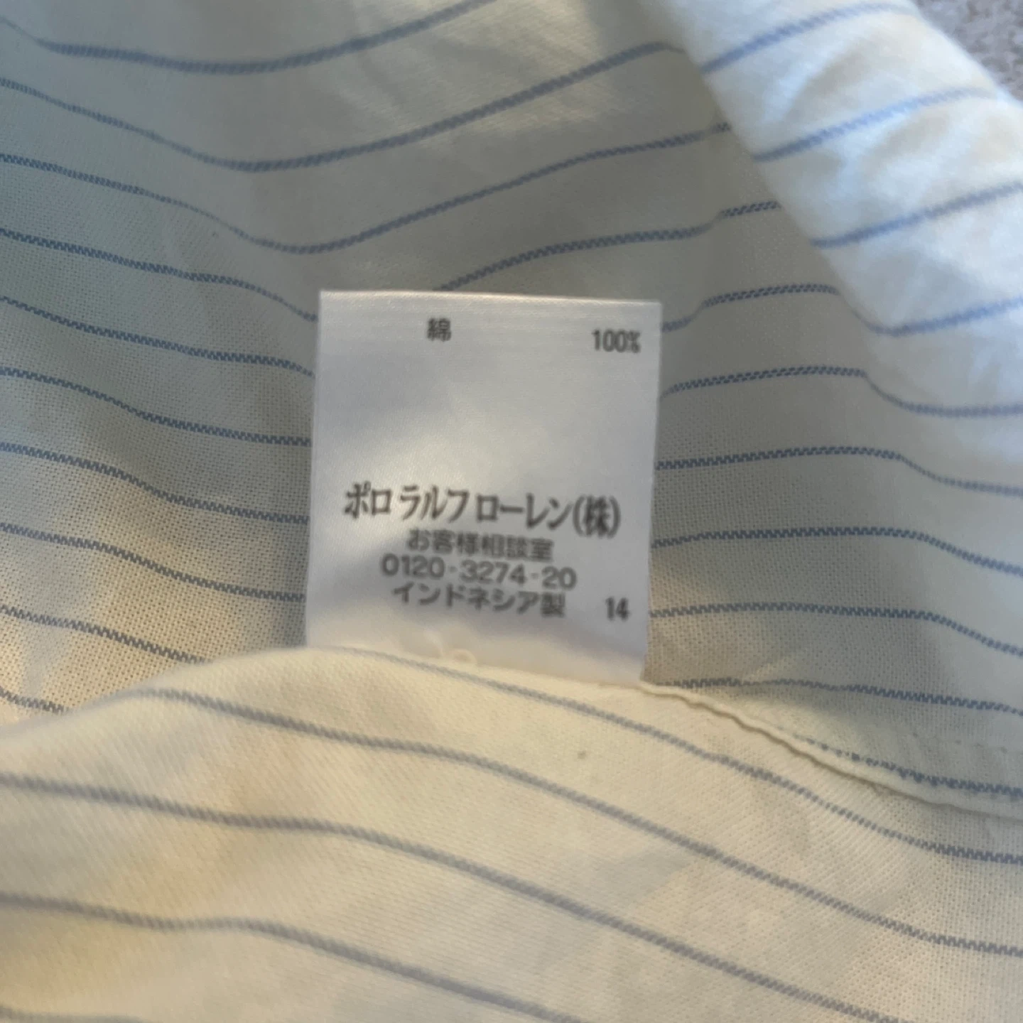 ラルフローレンのストライプシャツとネイビーの蝶ネクタイのセットです。 シャツはうすいクリーム色の生地にラルフローレンらしい水色のストライプです。 蝶ネクタイはサテンのような素材でアジャスターで簡単にサイズが変えられますので年齢関係なく使えます。 ・ブランド:ラルフローレン ・サイズ:120 ・色:白地に水色のストライプ ・素材:綿100% ・状態:使用感少なめ ・付属品:蝶ネクタイ 中古品であることをご了承ください。