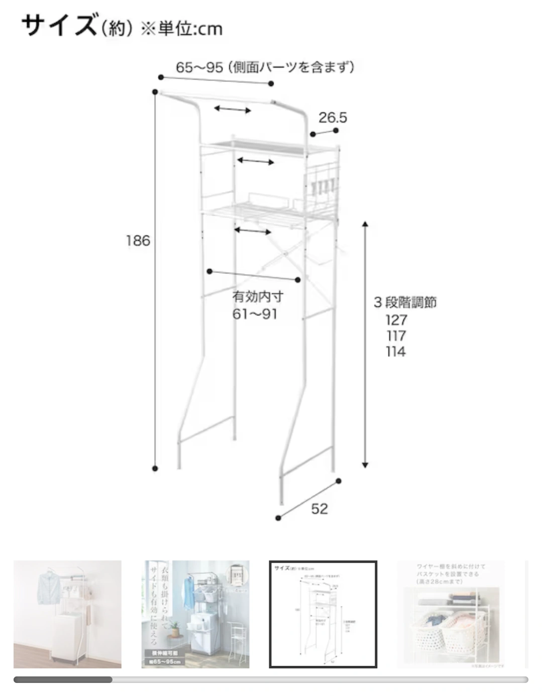ランドリーラックです ・カラー:ホワイト ・サイズ:(約)幅65〜95cm、高さ186cm、奥行52cm 半年しか使ってないです。10月くらいに引き渡し考えてます。相談可能です。 お気軽に連絡ください☆