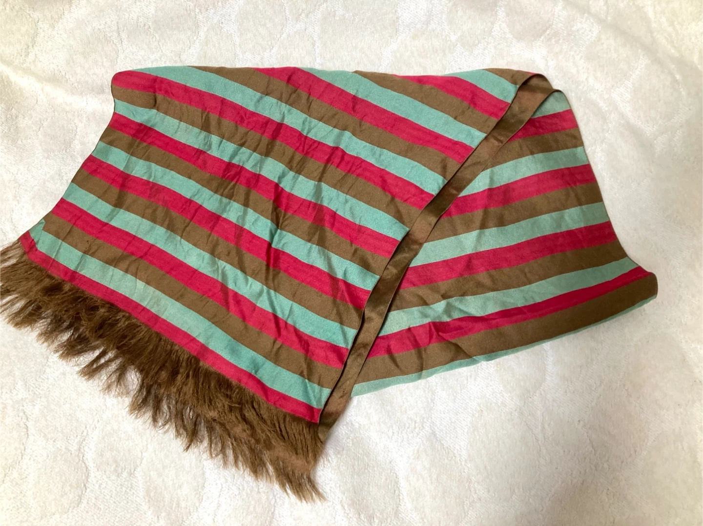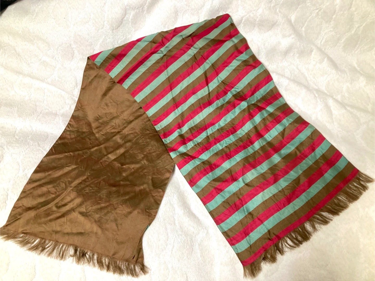 ☆最後までお読みください。 ☆自己紹介 欄の内容もご確認ください。 ☆サイズ 平置きの状態 横約106㎝ フリンジ込み 縦約27.5㎝ 素人採寸ですので誤差はご了承ください ☆シルクと記載しておりますが、タグなどはありません ご理解の方のみお願いします。 ☆シミや穴あきがあります ☆実物とお写真の色味が違う場合があります。ご了承下さい。 ☆USED品・新品・未使用と記載してある物を含め、自宅保管(長期自宅保管)・素人検品ですので、見落としがあるかもしれません。 神経質な方、完璧を求める方はご遠慮ください。 ☆迅速丁寧なお取引を心がけていますが、仕事が不規則ですので、ご質問への返答など連絡が遅くなる場合があるかもしれません。