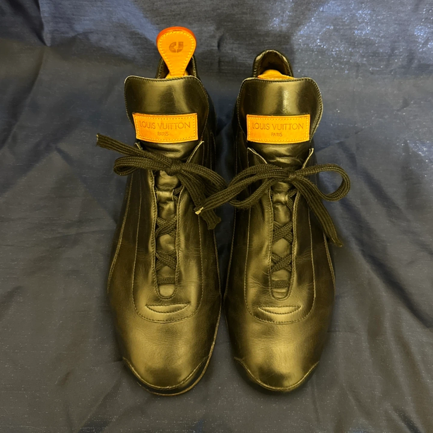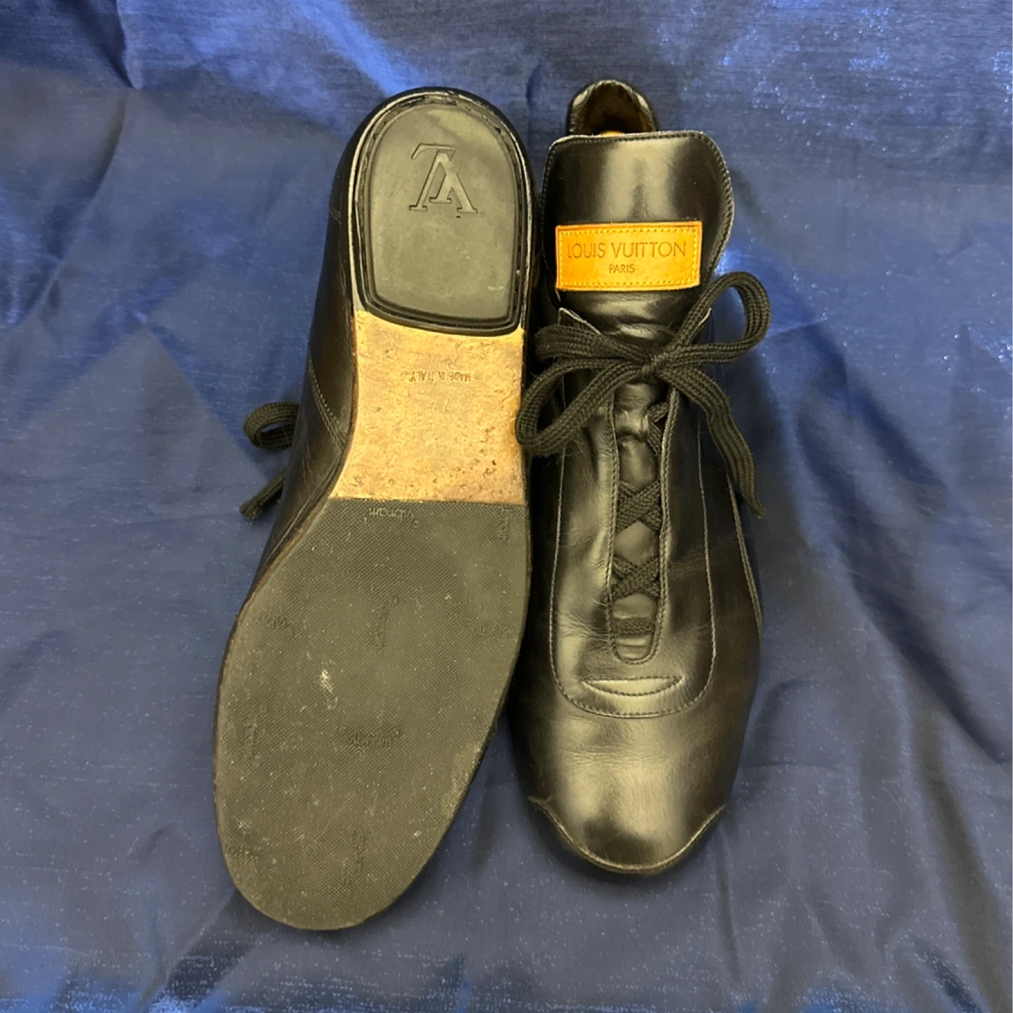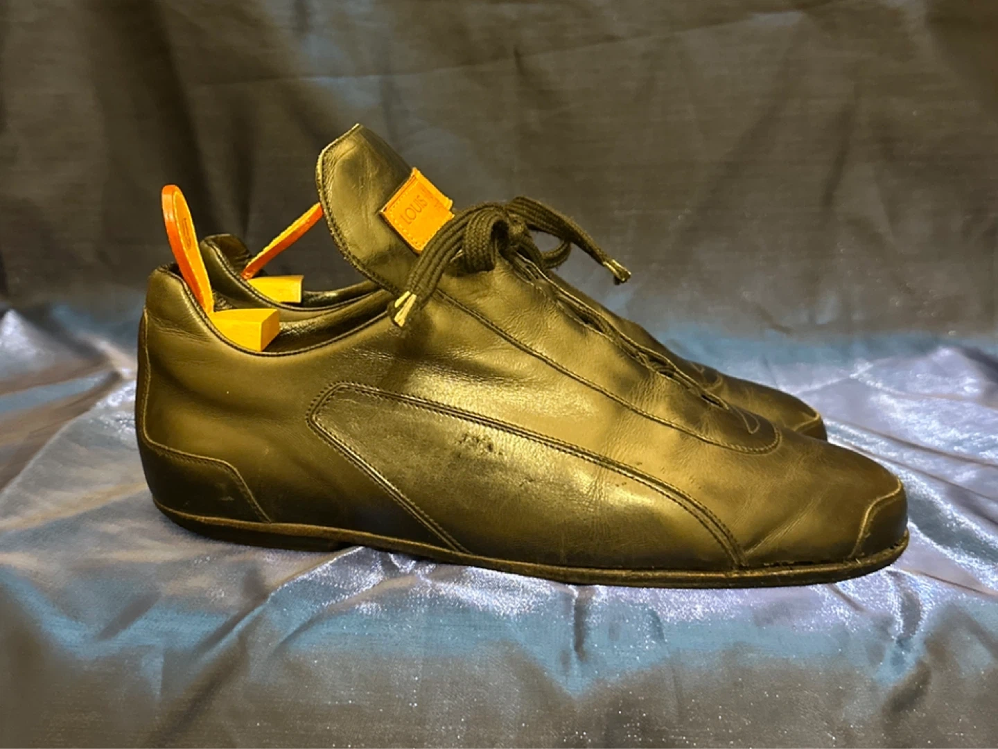黒の本革スニーカーです。アウトソール は張替え済みです。画像通り細かい傷や汚れあります。usedなので神経質な方や完品を求めている方はご遠慮ください。シューキーパーは付きません。 表記サイズ 7.1/2 アウトソール 全長28.5、全幅9.5 ※他サイトにも出品しているので売切れの場合はご了承ください。