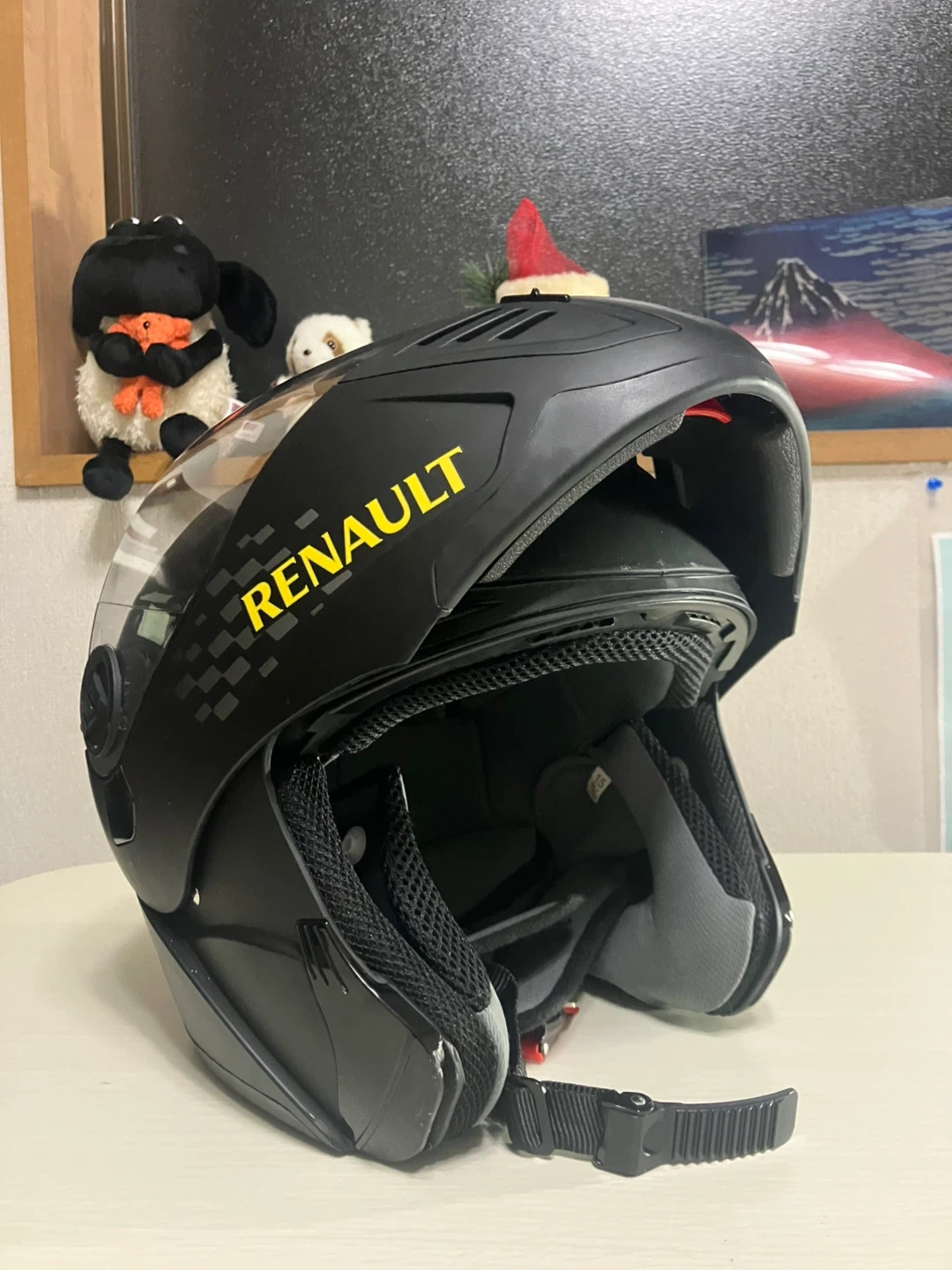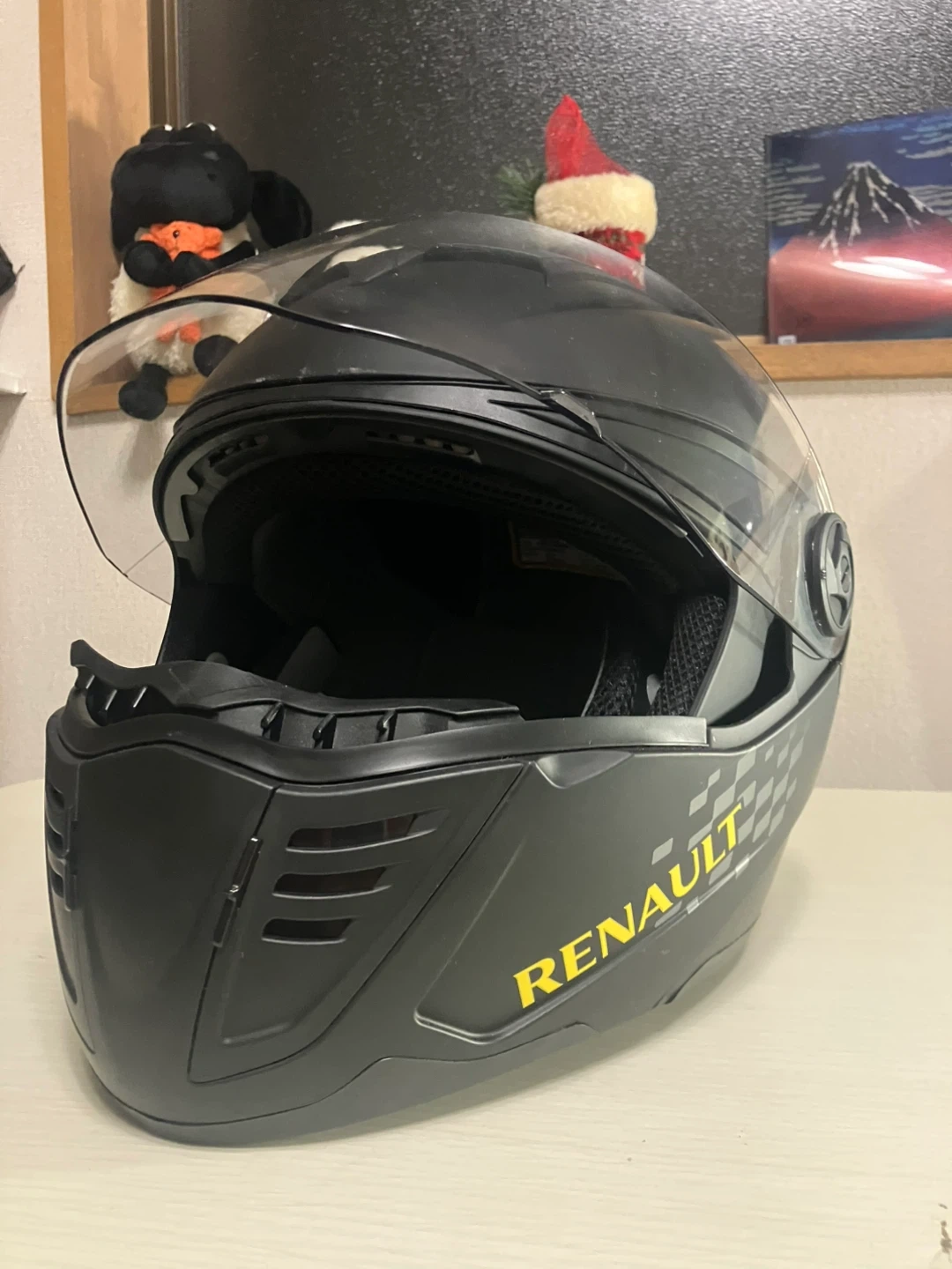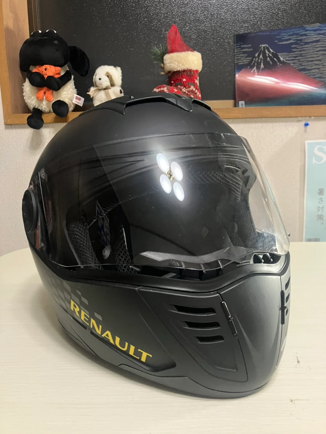 ルノーのシステムヘルメットです ・カラー:マットブラック ・ロゴ:RENAULT サイズ 57から60cm未満 安全規格はSGとPS Cを取得しています。 フルフェイスの安全性とジェットヘルの開放感を併せ持つ、理想のヘルメットです。 RENAULTのロゴとチェッカーフラッグが、走ることの楽しさを予感させてくれます。 自宅近辺まで取りに来てくださる方限定でお願いいたします。 事前にご連絡をいただければ、曜日問わず11時から18時の間お引き渡しができます。