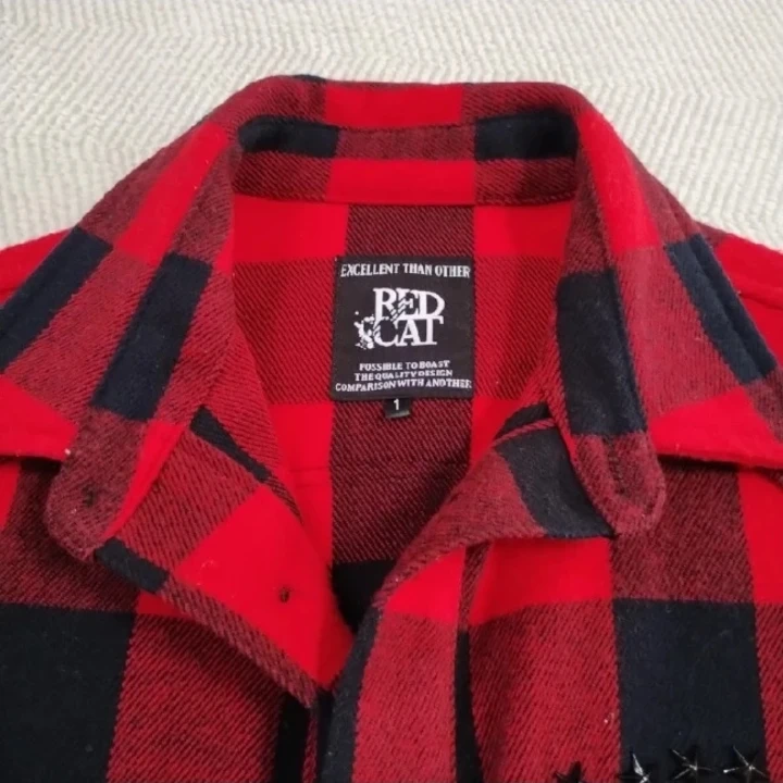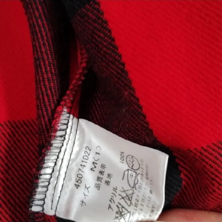 レッドキャットのチェックシャツです ・ブランド:レッドキャット ・カラー:赤、黒 ・サイズ:M(1) ・素材:アクリル100% ・状態:使用感少なめ 画像より明るい赤色です。 縦58横44センチ