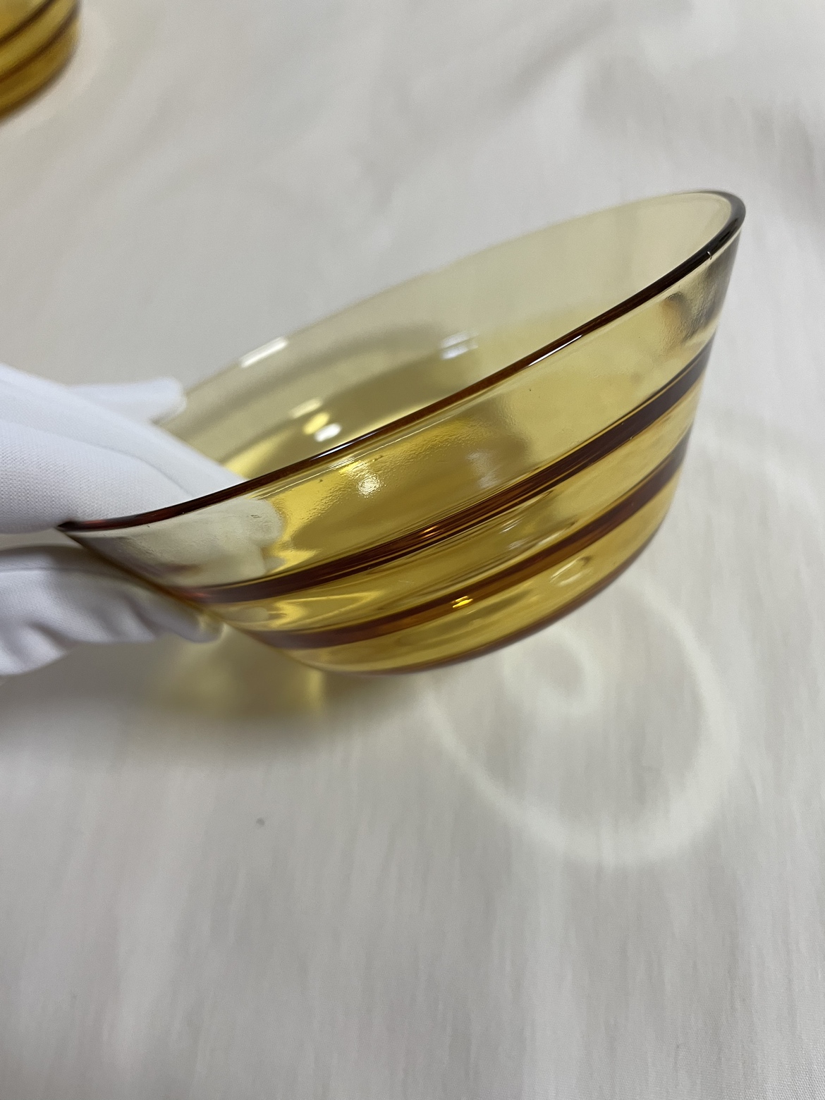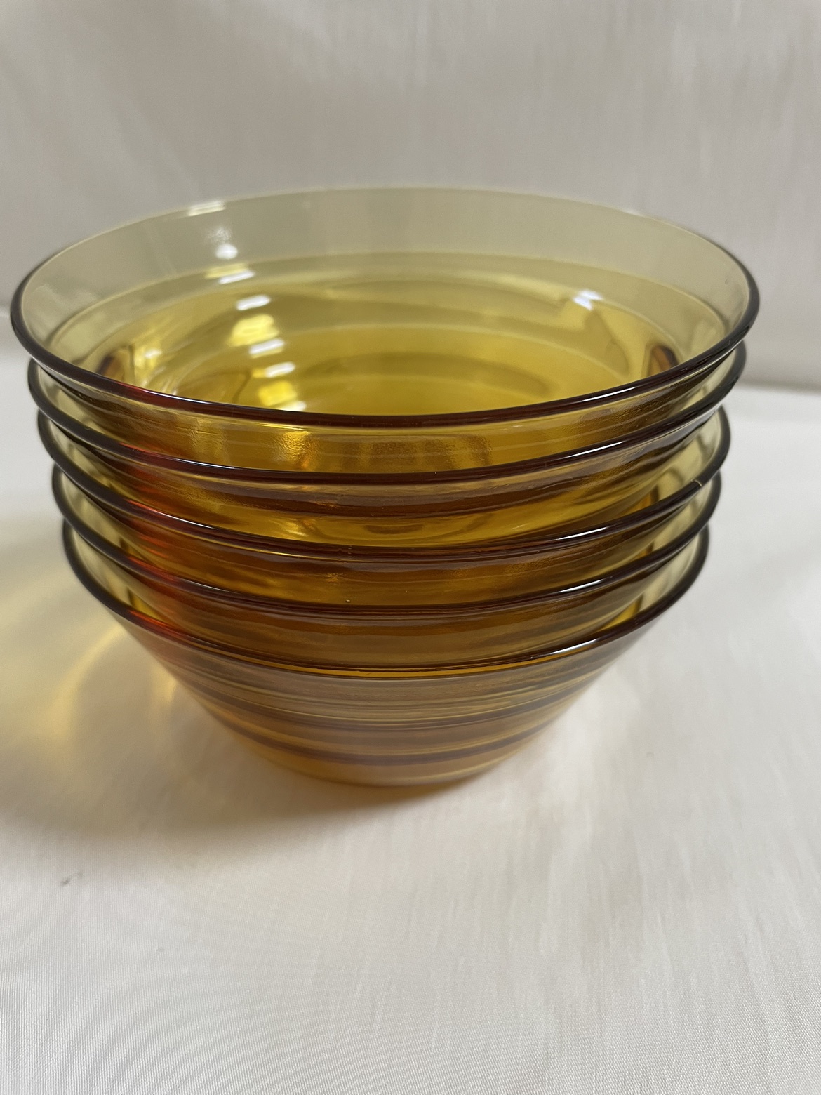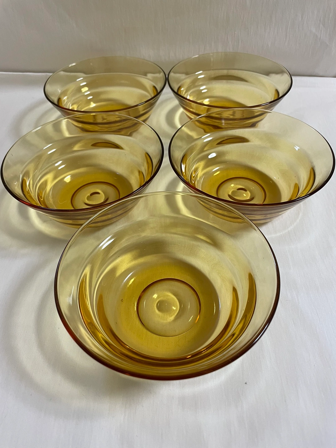 古いもの、証明するものがありませんが昭和から平成にかけて のものになるかと思います。 明るい茶のクリアガラス 上部の直径で、12センチほど 側面にナミがありますが、これは内側で手に触れます。 大きなキズはありませんがところどころに小さな" 気泡" があります、1〜2ミリ。 使用歴は分かりませんでした。 5個セットでどうぞ。 深さがあるので汁物やデザートにいかがでしょうか? ご足労ですが目黒線の武蔵小山か西小山駅あたりまで来てくださる方、状態をご了承いただき活用してくだされば嬉しいです。