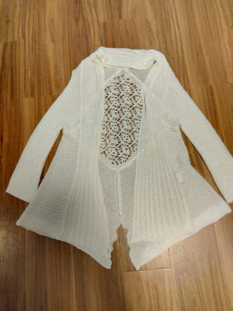 レースのバックパネルが特徴のオープンフロントカーディガンです。 - 色: ホワイト - デザイン: レースのバックパネル - スタイル: オープンフロントカーディガン - 素材: ポリエステル100% 品質は良くそれなりのお値段がしたものです 左袖とバック裾あたりに染みがあります。 クリーニング済です。 ご希望の方はお気軽にご連絡ください。