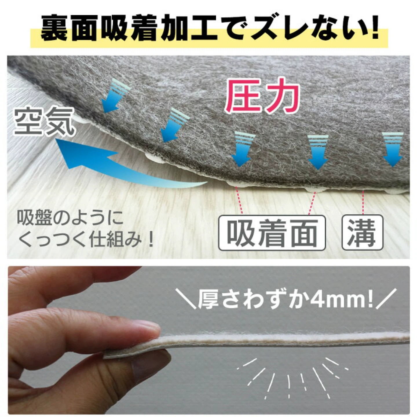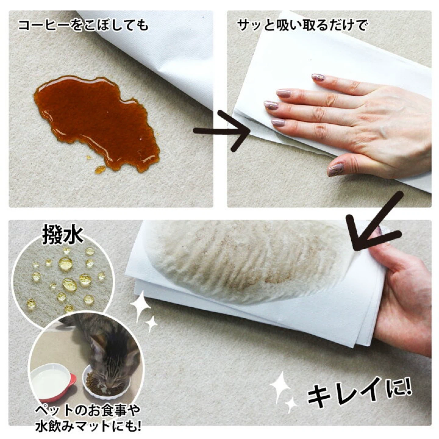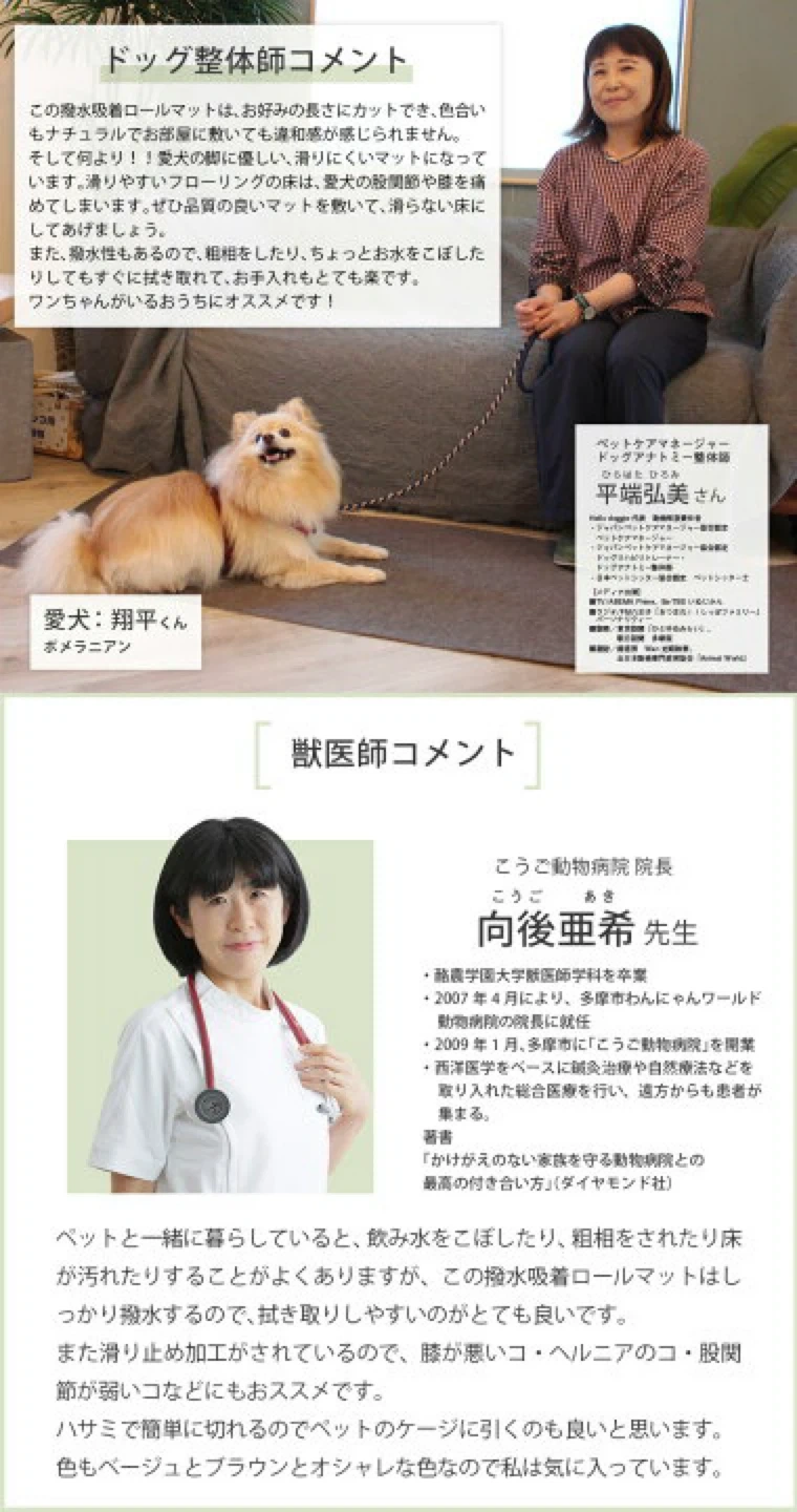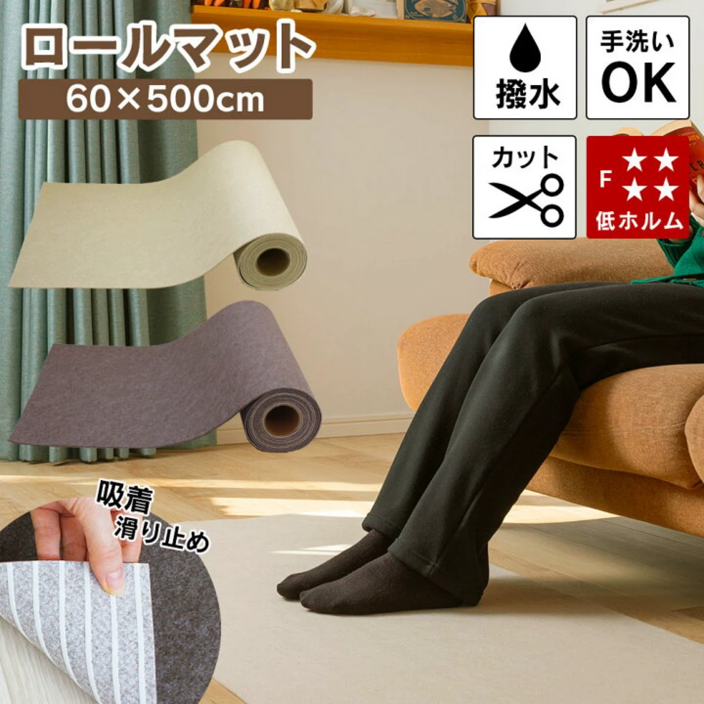ロールマットです。 ・カラー ブラウン ・サイズ:60×500cm ・撥水加工 ・カット可能 ・裏面吸着加工 ・厚さ約4mm ・ペットや子供がいる家庭におすすめ 撥水吸着ロールマット[60cm×5m] カラー ベージュ、ブラウン サイズ (約)幅60×長さ500cm 重量 (約)2.5kg 材質 表面:ポリエステル、裏面:アクリル樹脂※洗濯は手洗いのみ 生産国 日本 注意 ●使用前に裏面のフィルムをはがしてお使いください。 ●床面の汚れ、ワックス、水分を充分拭き取ってからご使用ください。 ●凹凸がある等、床面によっては吸着しない場合があります。 ●床面によっては変色、密着する恐れがあります。 特に床面が塩化ビニール製の場合、高温の場合は避けてください。 ●はがす際はゆっくりと取ってください。万が一、吸着部が床面に付着した場合はお湯を浸した布で拭き取ってください。 ●塗装面にご使用の場合、塗装の剥離に注意して取り外してください。 ●長時間敷き詰めたままにしておくと、床面が密着する恐れがあります。 1ヶ月に一度程度、めくって風通しをしてください。 ■撥水加工をしておりますので、汚れたら乾いた布等でサッと拭っていただくだけで汚れが落ちます。 ■撥水加工を施しておりますので、洗濯機のご使用はおやめください。 洗濯機が壊れる恐れがあります。 ■洗う場合は手洗いで、家庭用中性洗剤を使用してください。 漂白剤、ソフト加工(柔軟剤)は使用しないでください。 ■手洗い後はねじり絞りは避け、バスタオル等で水分を取った上で必ず粘着面を上にして日陰干しにしてください。 ■粘着面がくっついた状態で干さないでください。粘着部分が密着してはがれなくなる恐れがあります。