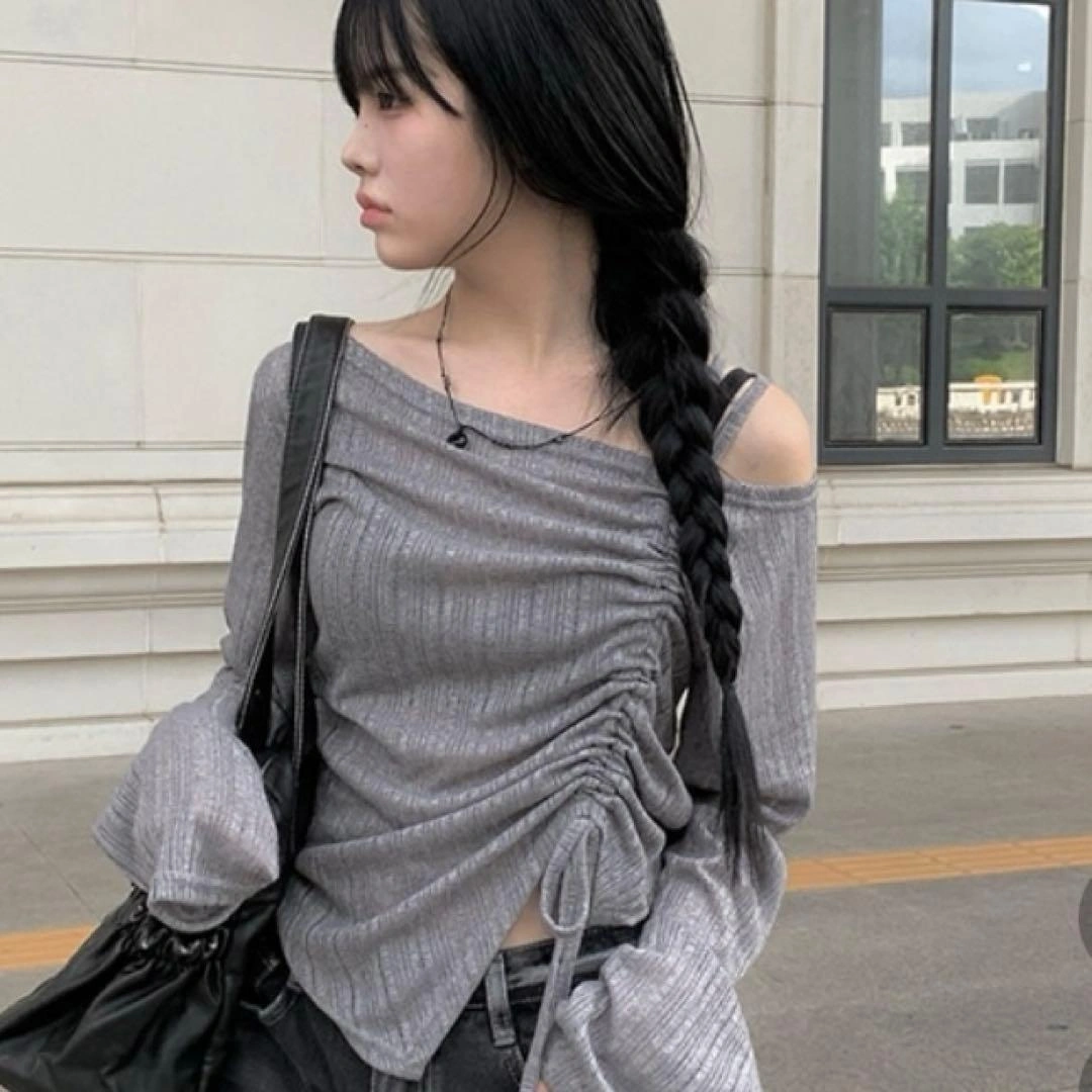 ワンオフショルダー ギャザーリボン長袖Tシャツ