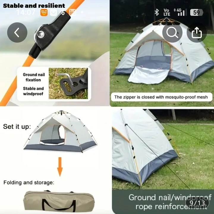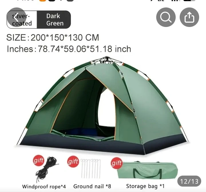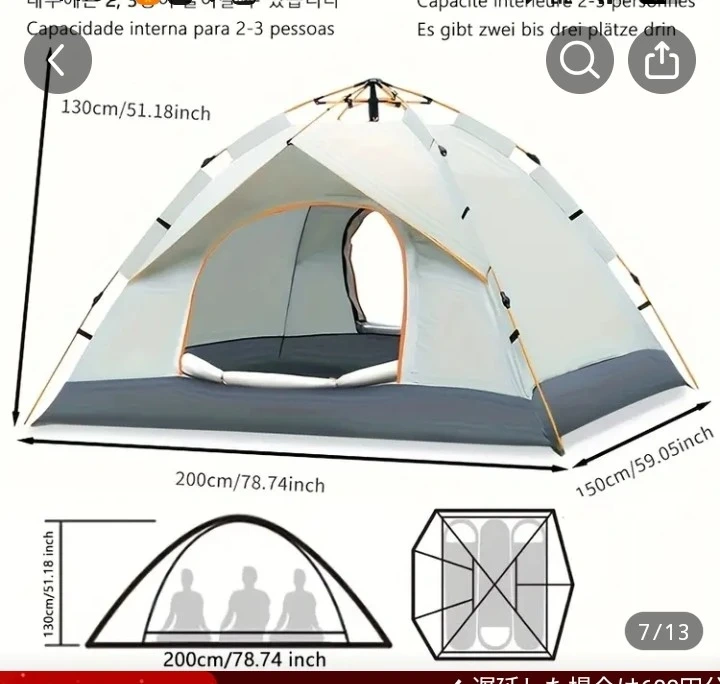ワンタッチテント 2-3人用 ・サイズ:200×150×130cm / 78.74×59.06×51.18 inch ・色:ダークグリーン ・付属品:防風ロープ×4、グラウンド釘×8、収納バッグ×1 収納サイズ 63cm 1.8kg 慣れると数分で展開、撤収できます。 YouTubeでワンタッチテントやり方と 検索下さい。沢山動画でています。 あくまで海外製品です。細かな点 気にされる方は、ご遠慮下さい。 受渡しは横浜市緑区中山駅北口徒歩3分の セブンイレブン中山北口店前で お願いします。駐車場はありませんが、 全面道路広く、停められます。 日にちにもよりますが、am8-pm8 対応できます。