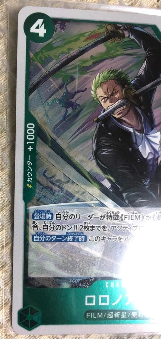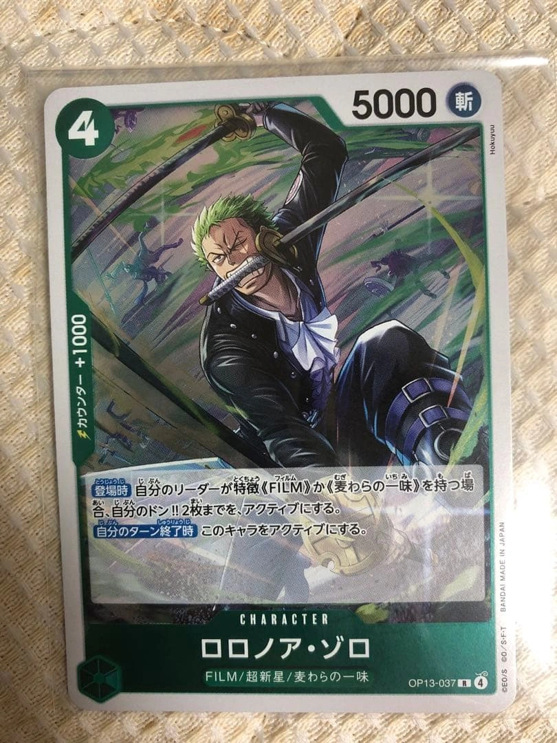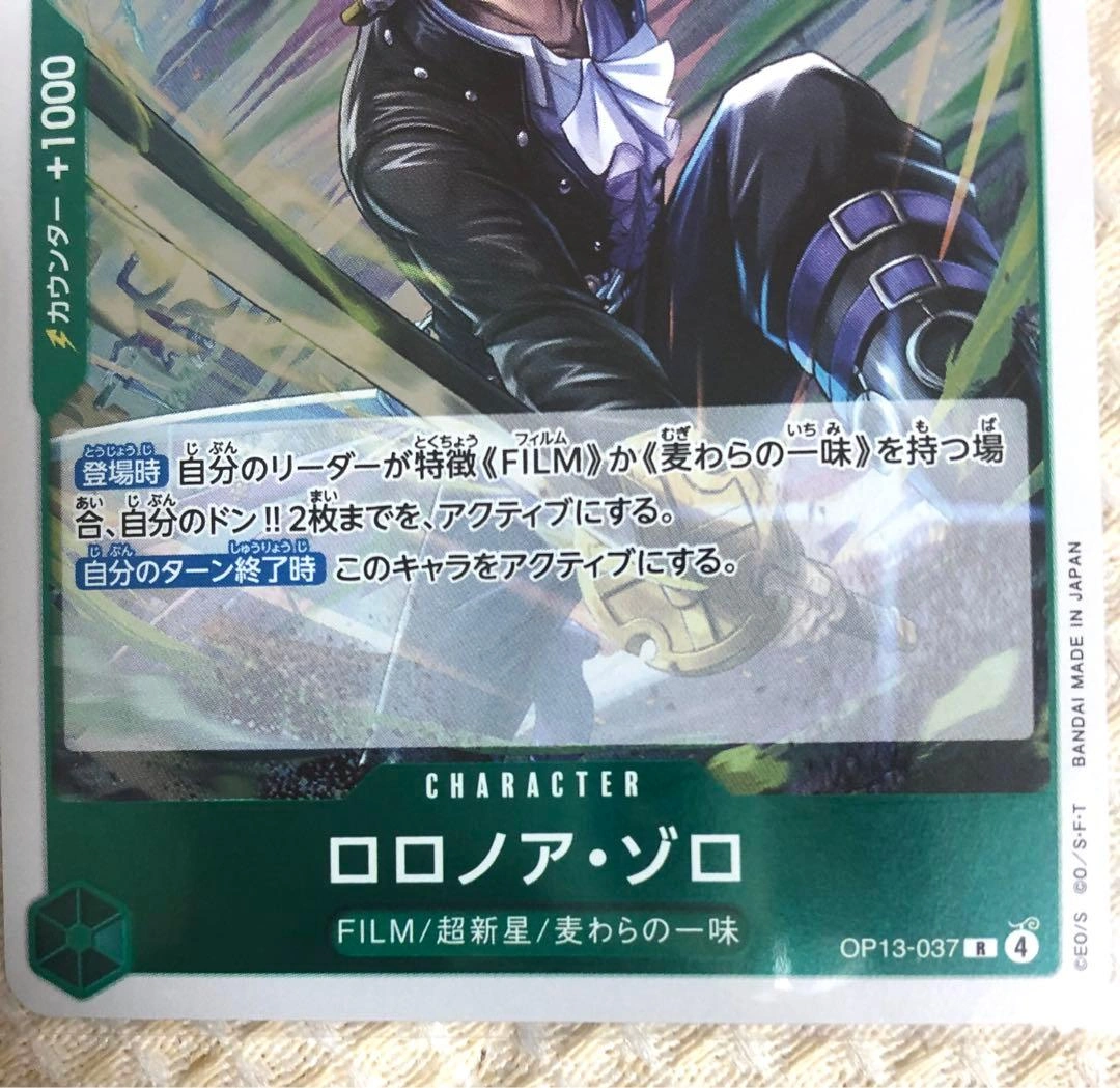 特性FILMを持つリーダーと組み合わせて使用することで、自分のドンを2枚アクティブにできるキャラクターカードです。 - キャラクター名: ロロノア・ゾロ - カードタイプ: キャラクター - コスト: 4 - パワー: 5000 - 特性: FILM - セット番号: OP13-037 - レアリティ: 新 - 効果: 自分のリーダーが特性(FILM)を持つ場合、自分のドン2枚まで、アクティブにする。 ご覧いただきありがとうございます。 パック開封後、すぐにスリーブに入れて保管しています。 白かけ・傷なしの美品ですが、念のためプレイ用でお願いします。 すり替え防止のため、購入後のキャンセル・返品はご遠慮ください。 ご希望の方はお気軽にご連絡ください。