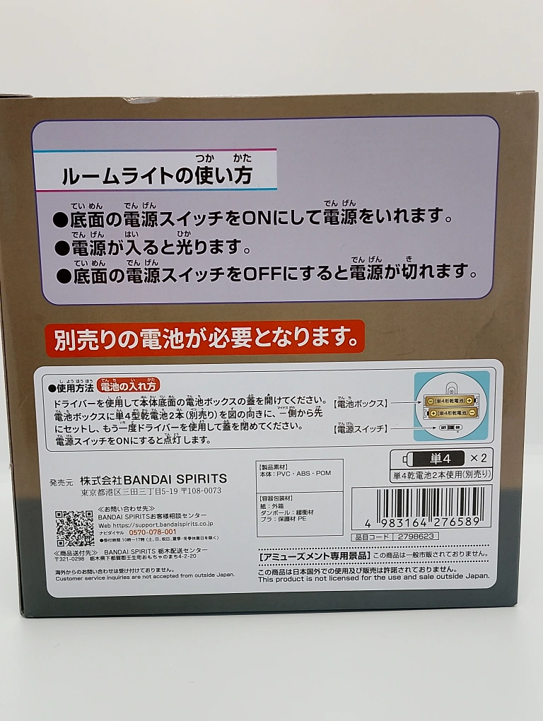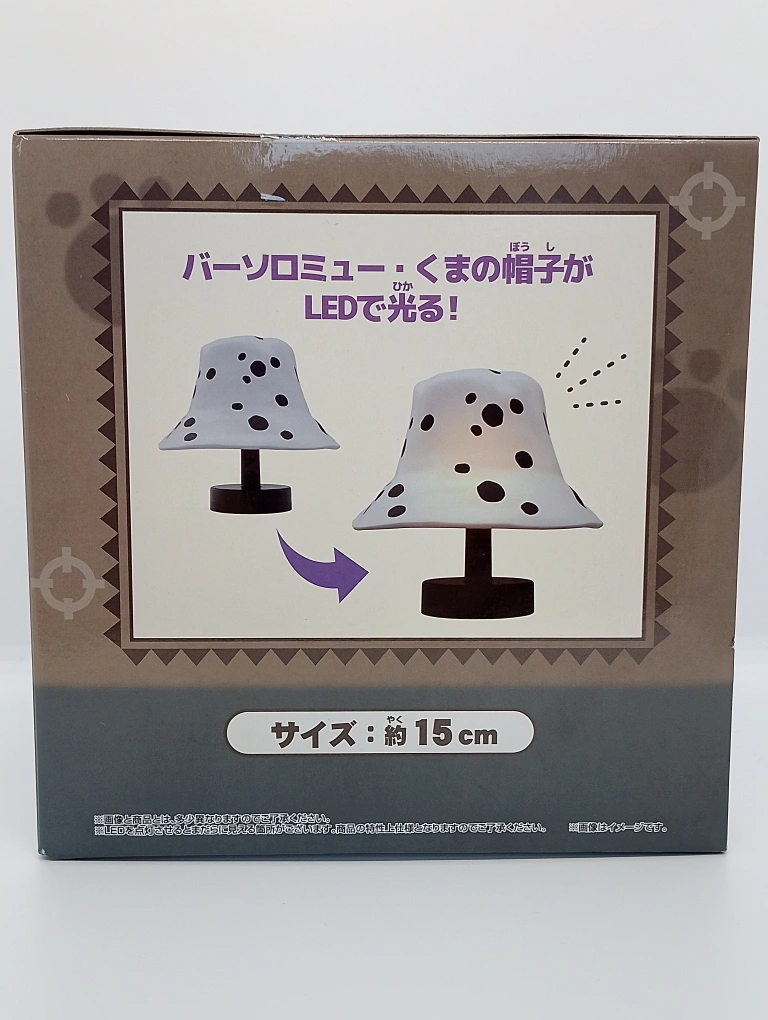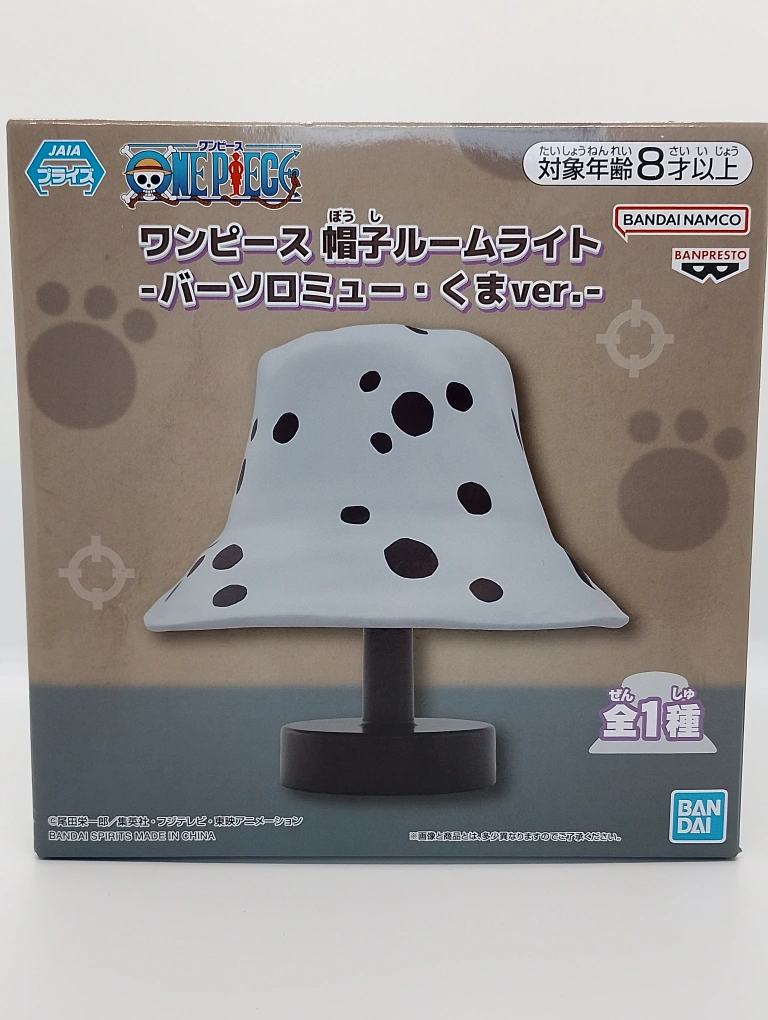 バンダイ製のワンピース帽子ルームライト、バーソロミュー・くまバージョン。 - ブランド: バンダイ - 商品名: ワンピース 帽子ルームライト - バーソロミュー・くまver. - 電池: 別売りの電池が必要 - スイッチ: 底面の電源スイッチで操作