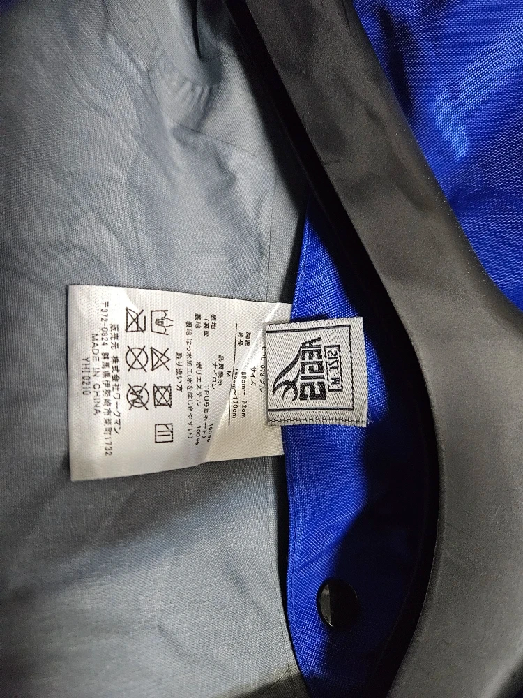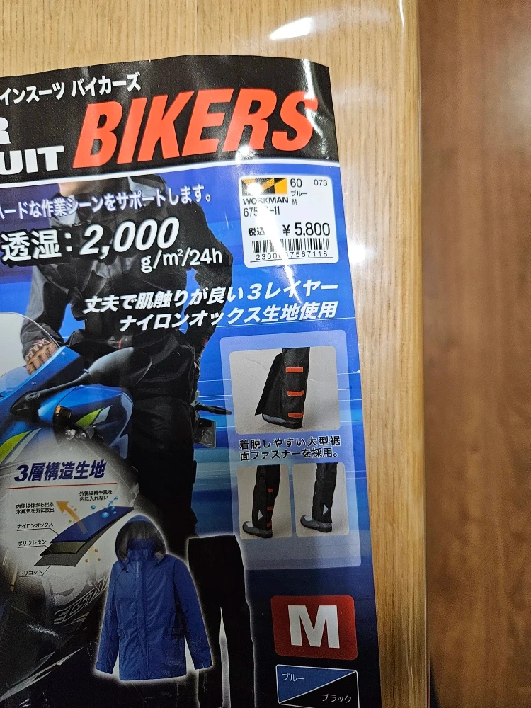 ワークマンのレインウェアセットアップです。 【情報】 ブランド:ワークマン 商品名:3レイヤースーツバイカーズ カラー:ブルー、ブラック サイズ:M 素材:ナイロン100% 【状態】 使用感はありません。1度だけ着用しました。 中古品であることをご了承ください。