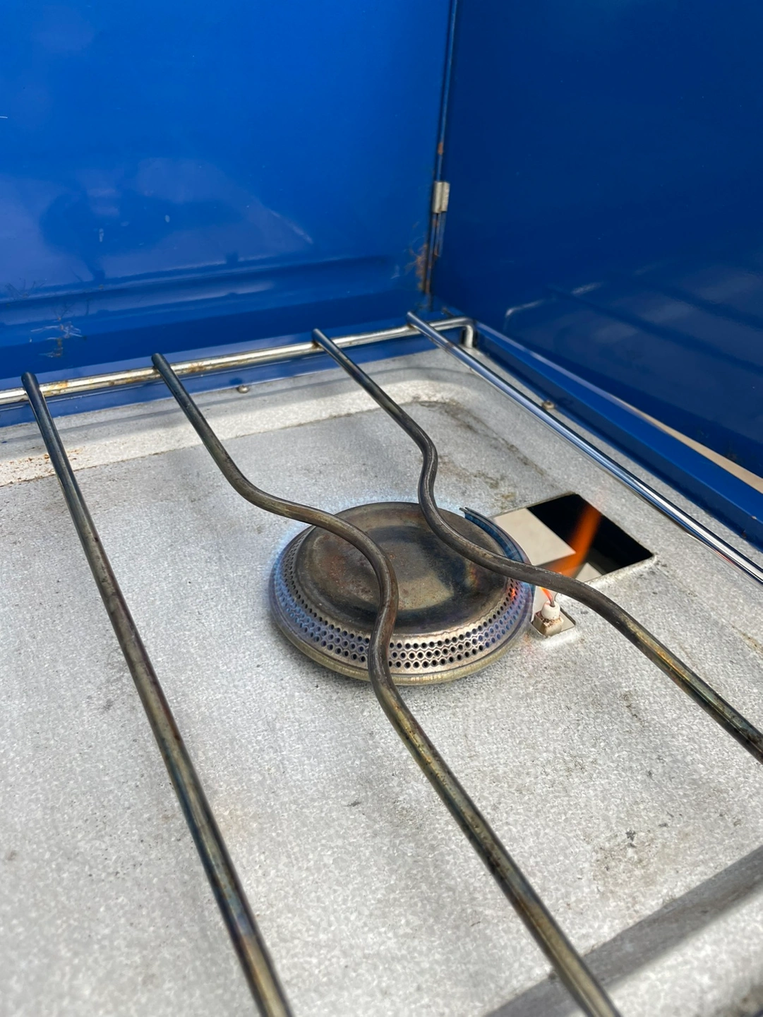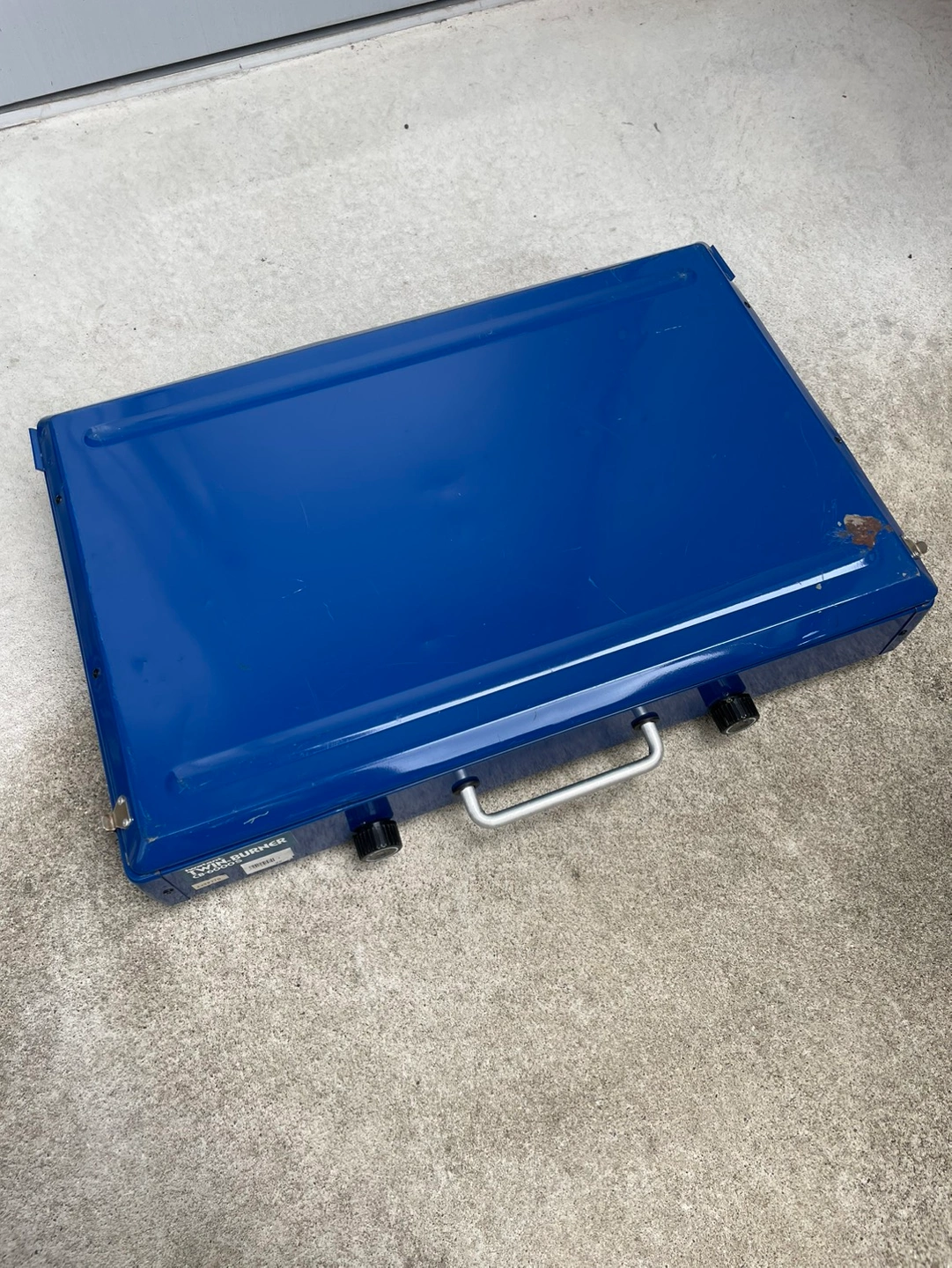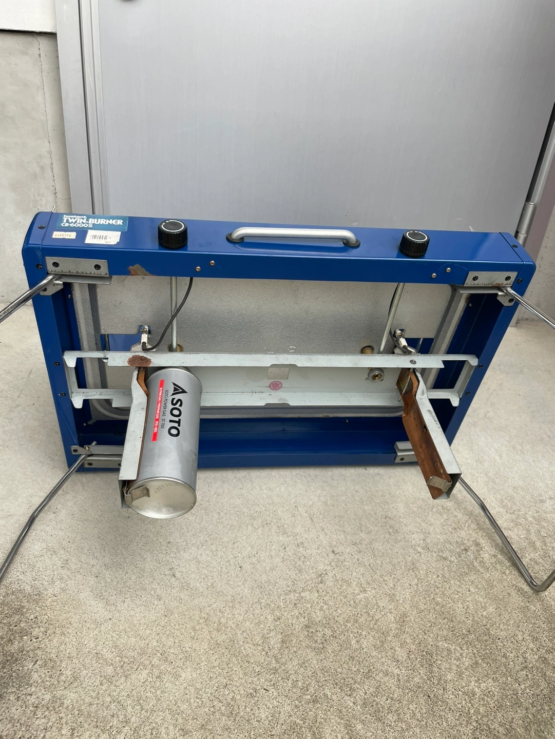10年以上前に購入したイワタニのツインバーナーです。長年キャンプで使用していたので、サビや汚れなどあります。時々着火しづらい時がありますが、何度かカチカチやったり、ガスボンベを上に押し当てると火がつきます。古いものですのでメンテナンスできる方、その旨ご理解いただける方のみご購入お願いします。ヴィンテージ感がありキャンプ場で目立ちます。ウェットティッシュで簡単に清掃済み。 商品状態:傷や汚れあり カラー:ブルー サイズ:縦36㎝×横56㎝×厚さ11㎝ (たたんだ状態で) あくまでも中古品であるということをご了承の上、ご購入ください。