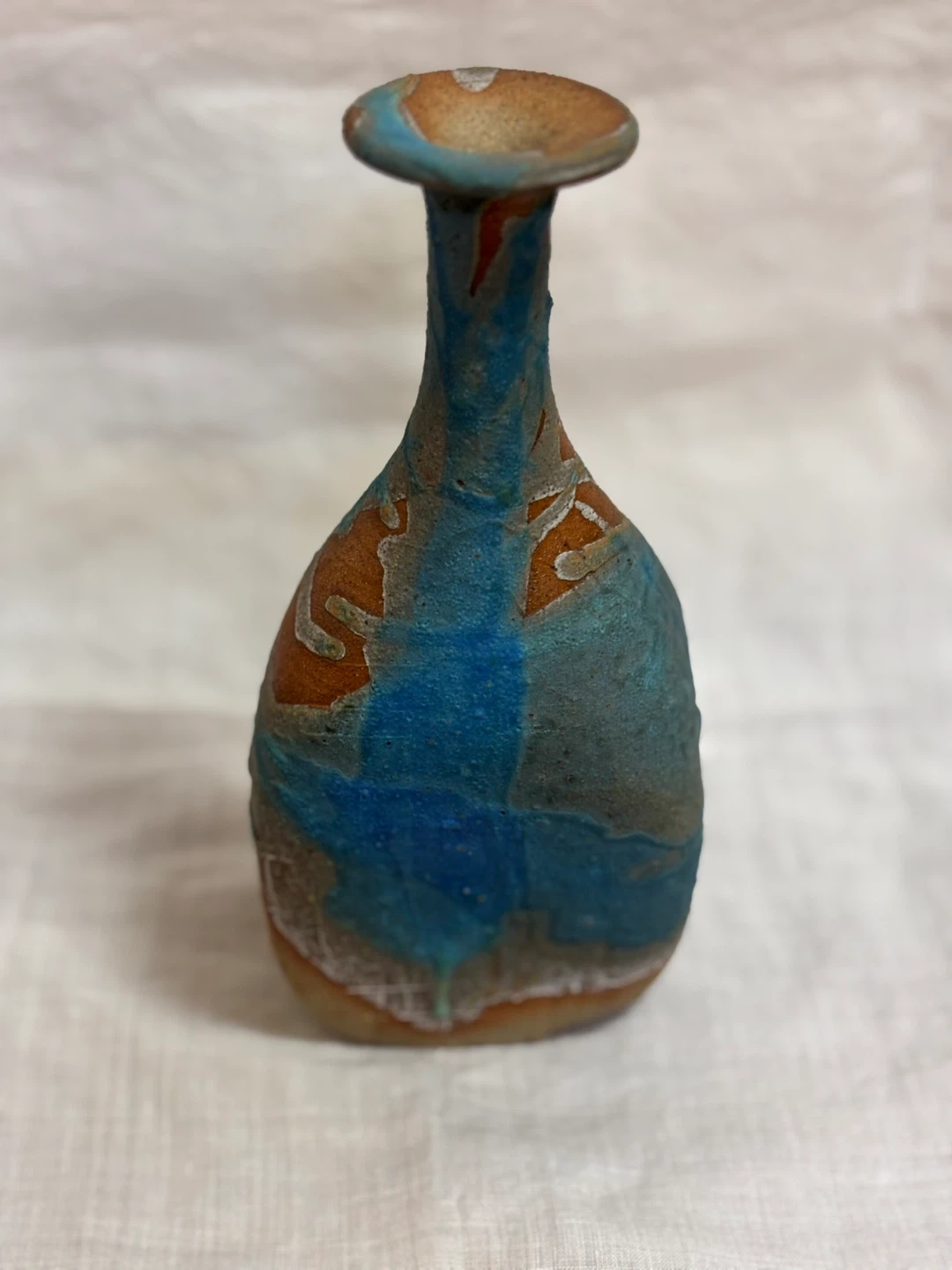 ご覧頂きましてありがとうございます! サインと刻印のある一点ものの陶芸作品です。 青釉が流れるように掛けられており、光の加減で色の表情が変わります。 土の質感と釉薬のコントラストがとても綺麗な作品で、手仕事ならではの温かみを感じます。 一輪挿しとしてもお使いいただけますが、オブジェとしてそのまま飾っても映えるデザインです。 長期自宅保管のものです。 目立つ傷や汚れは見当たりませんが、ハンドメイド・ヴィンテージ作品にご理解のある方のみお願いいたします。 ✴︎サイズ 口径 約4.3㎝ 高さ 約17㎝ 幅 約8㎝ キャンセル、返品、商品お受け取り後のクレームなどはお受け出来ませんので、ご了承頂けるようお願い致します。 #ミニ フラワーベース #アンティーク花瓶 #一輪挿し #インテリア #オブジェ #陶芸作品 #Art Pottery #作家もの #青釉 #花器 #陶器のある暮らし #ヴィンテージ花瓶 #工芸品 #手仕事のうつわ