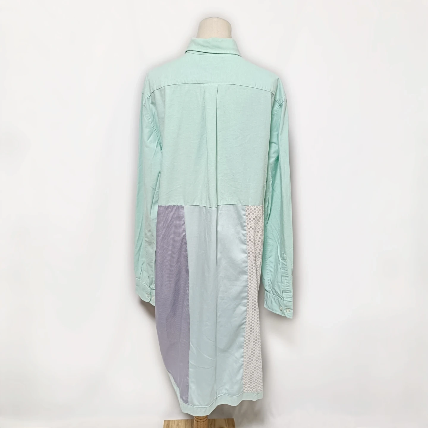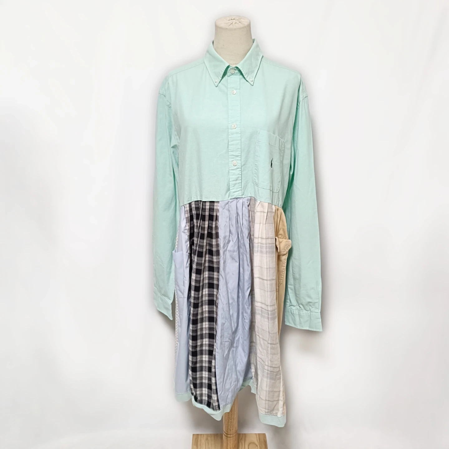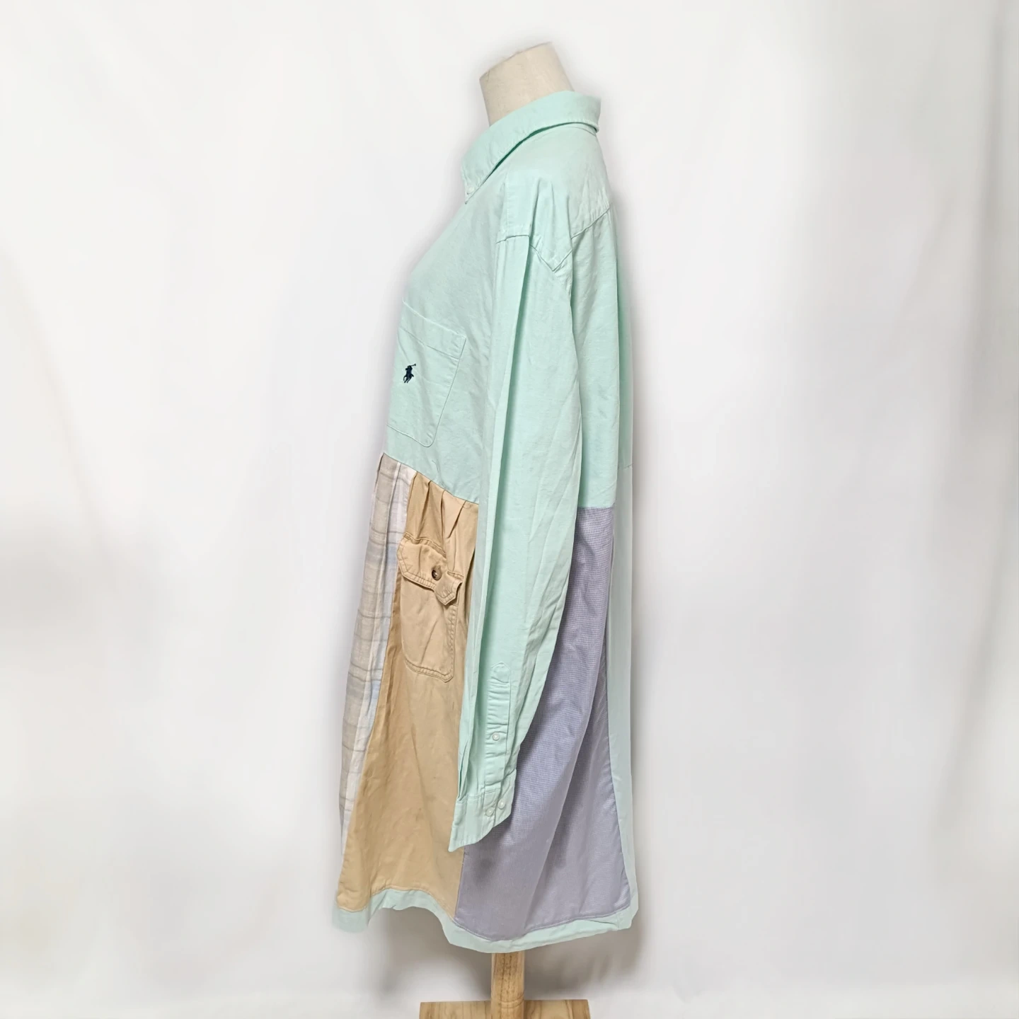 ご覧 いただきありがとうございます! 古着のRalph Lauren(ラルフローレン)シャツを贅沢に使用し、大胆に再構築したハンドメイドの一点物シャツワンピースです。 上部は爽やかなミントグリーンカラーのラルフローレンシャツ(クラシックフィット・Lサイズ)をベースに。 下部はチェック柄やストライプ、無地、カーゴパンツのポケットなど、多種多様な異素材を組み合わせたパッチワークデザインになっています。 ゆったりとしたオーバーサイズで、体型を選ばずリラックス感のある着こなしを楽しめます。チュニックやマキシ丈としても着用可能です。 □商品名□ 一点物 ラルフローレン リメイク パッチワークシャツワンピース □ブランド□ ラルフローレン(ベース) □表記サイズ□ タグ表記 L(レディースのL~XL、またはフリーサイズ相当) □実寸サイズ(cm) □ 着丈:105 肩幅:52 身幅:60 袖丈:70 ※実寸につきまして多少の誤差はご了承ください。 ※表記サイズだけではなく実寸のサイズをご確認ください。 □カラー□ マルチカラー □素材□ コットン100%(ベースシャツ) □コンディション□ 目立った汚れやダメージなど特にございません。 ※汚れはできる限り写真にて掲載しております。まずは画像をご確認ください。 どうぞよろしくお願い致します。 □商品管理番号□ Q4-W-5549