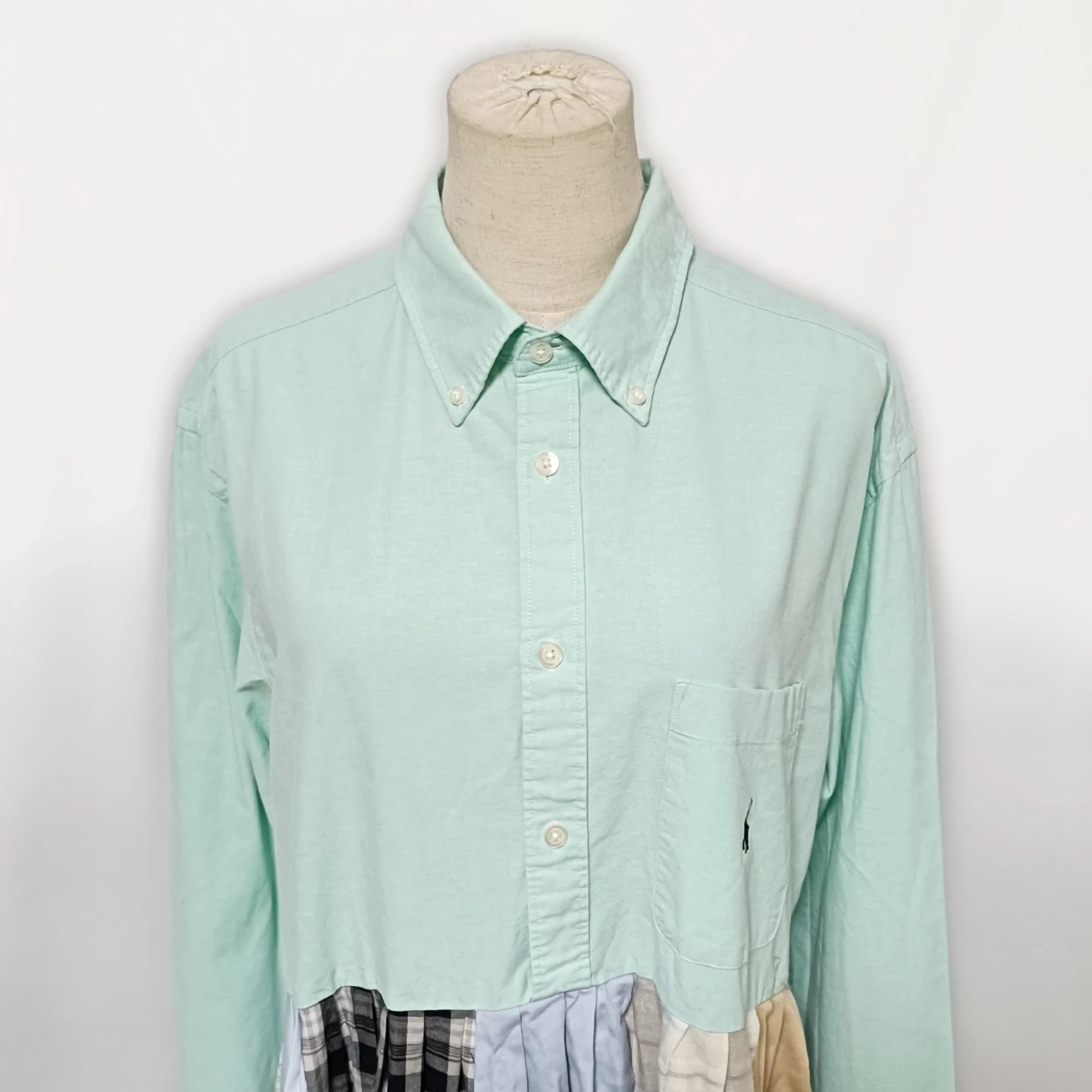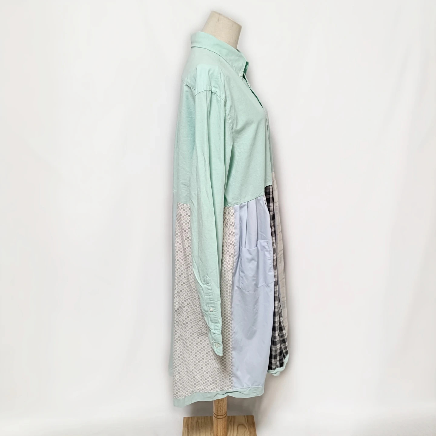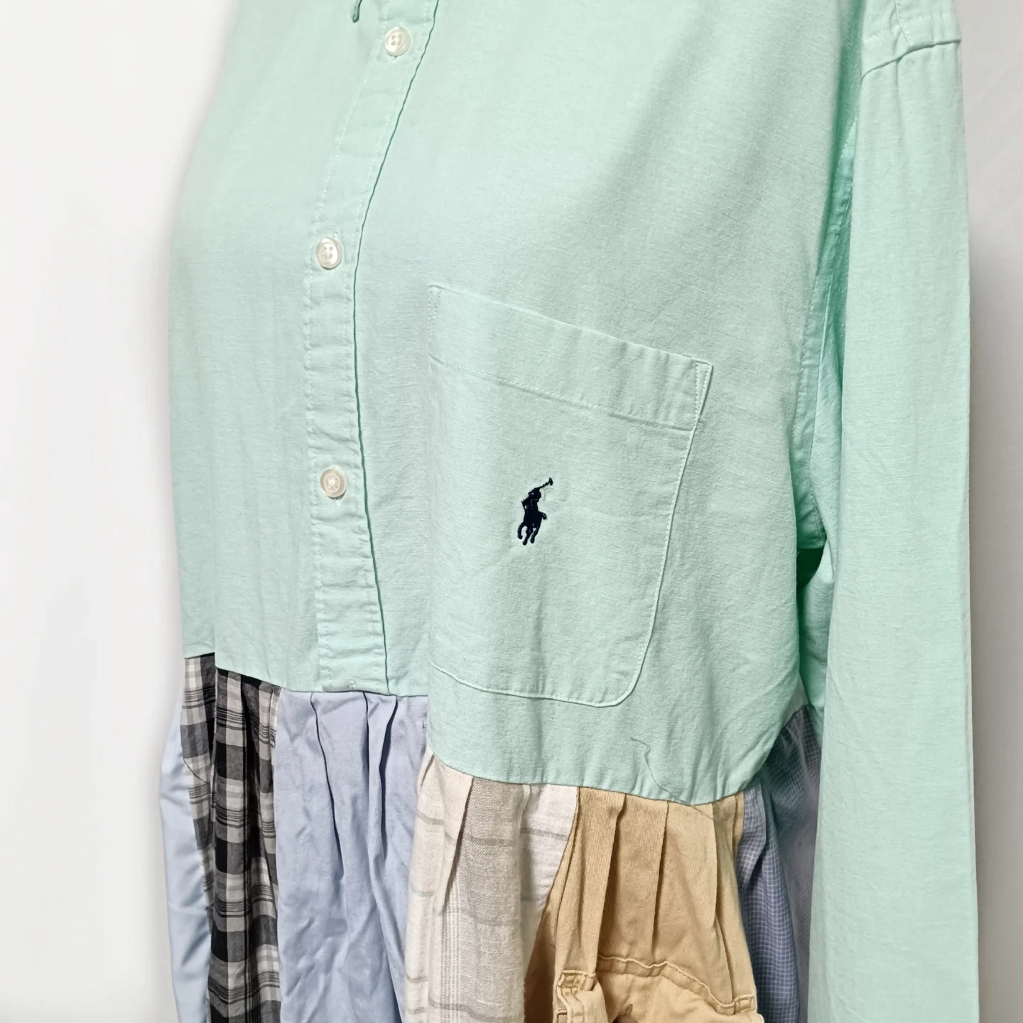 ご覧 いただきありがとうございます! 古着のRalph Lauren(ラルフローレン)シャツを贅沢に使用し、大胆に再構築したハンドメイドの一点物シャツワンピースです。 上部は爽やかなミントグリーンカラーのラルフローレンシャツ(クラシックフィット・Lサイズ)をベースに。 下部はチェック柄やストライプ、無地、カーゴパンツのポケットなど、多種多様な異素材を組み合わせたパッチワークデザインになっています。 ゆったりとしたオーバーサイズで、体型を選ばずリラックス感のある着こなしを楽しめます。チュニックやマキシ丈としても着用可能です。 □商品名□ 一点物 ラルフローレン リメイク パッチワークシャツワンピース □ブランド□ ラルフローレン(ベース) □表記サイズ□ タグ表記 L(レディースのL~XL、またはフリーサイズ相当) □実寸サイズ(cm) □ 着丈:105 肩幅:52 身幅:60 袖丈:70 ※実寸につきまして多少の誤差はご了承ください。 ※表記サイズだけではなく実寸のサイズをご確認ください。 □カラー□ マルチカラー □素材□ コットン100%(ベースシャツ) □コンディション□ 目立った汚れやダメージなど特にございません。 ※汚れはできる限り写真にて掲載しております。まずは画像をご確認ください。 どうぞよろしくお願い致します。 □商品管理番号□ Q4-W-5549