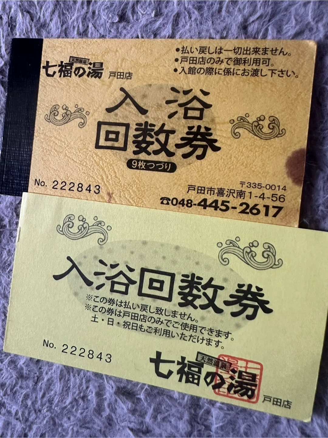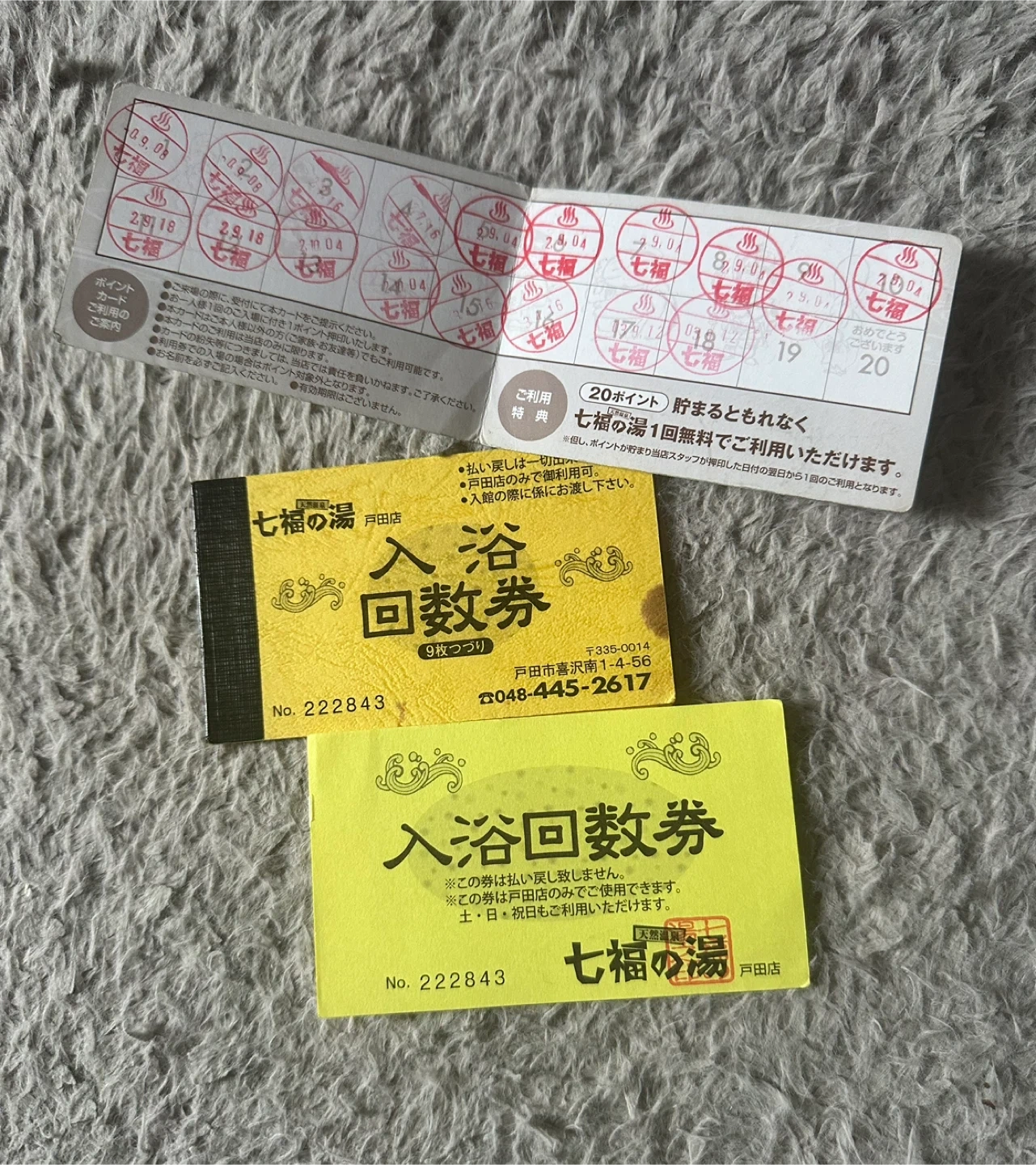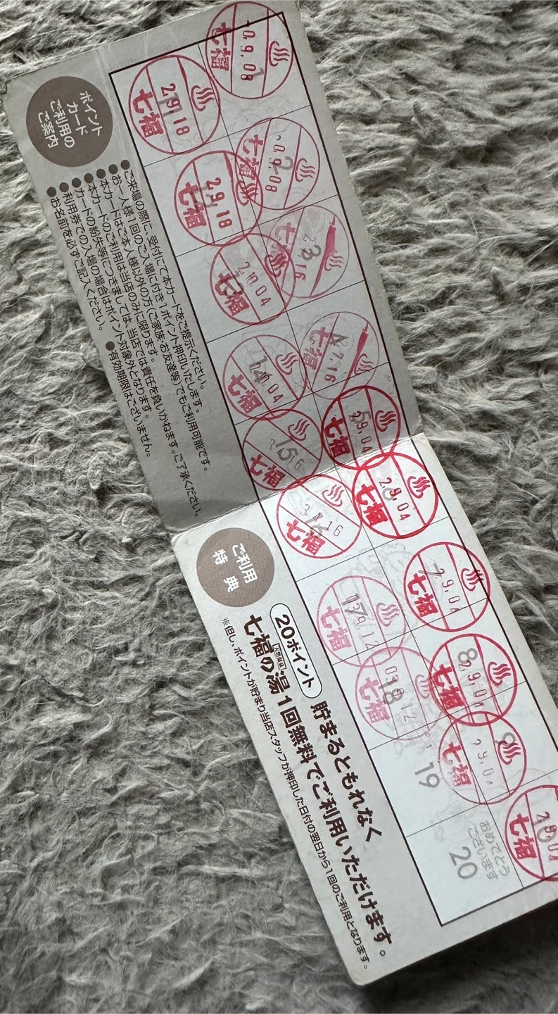 七福の湯 戸田店のみ 回数券1枚+ポイントカード ポイントカードは18個貯まってます。 20個貯まると1回無料でご利用頂けるとのことです。 ※早く取りに来ていただける方優先のため、時間メッセージ記載の上宜しくお願い致します。 本日中のお取引できる方優先しております。 マメにやり取りできる方でお願い致します。 受け渡しはマンションの下まで来てくださる方でお願い致します。 住所は川口市並木3-8-18になります。 取引開始しましたらマンション名もお伝え致します。