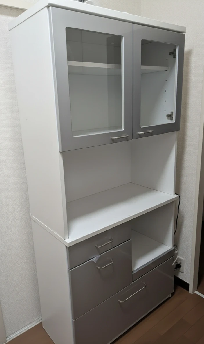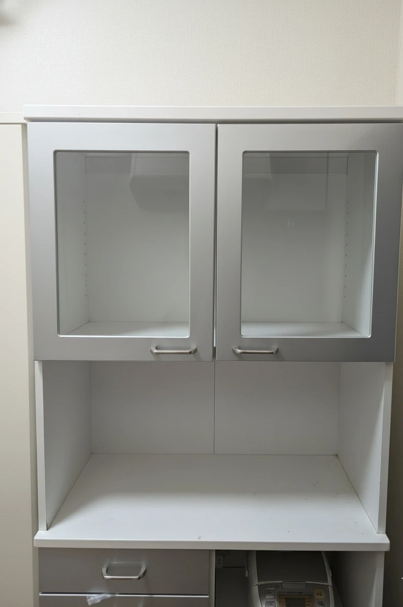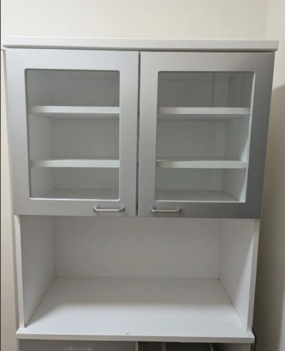 食器棚です ・色:白、シルバー ・状態:使用感少なめ ・2つの部分に分けられます 炊飯器の設置スペース寸法:42×34×40 中央スペースの寸法:85×42×40 全体の寸法:180×85×42 ご不明点があればお気軽にご連絡ください