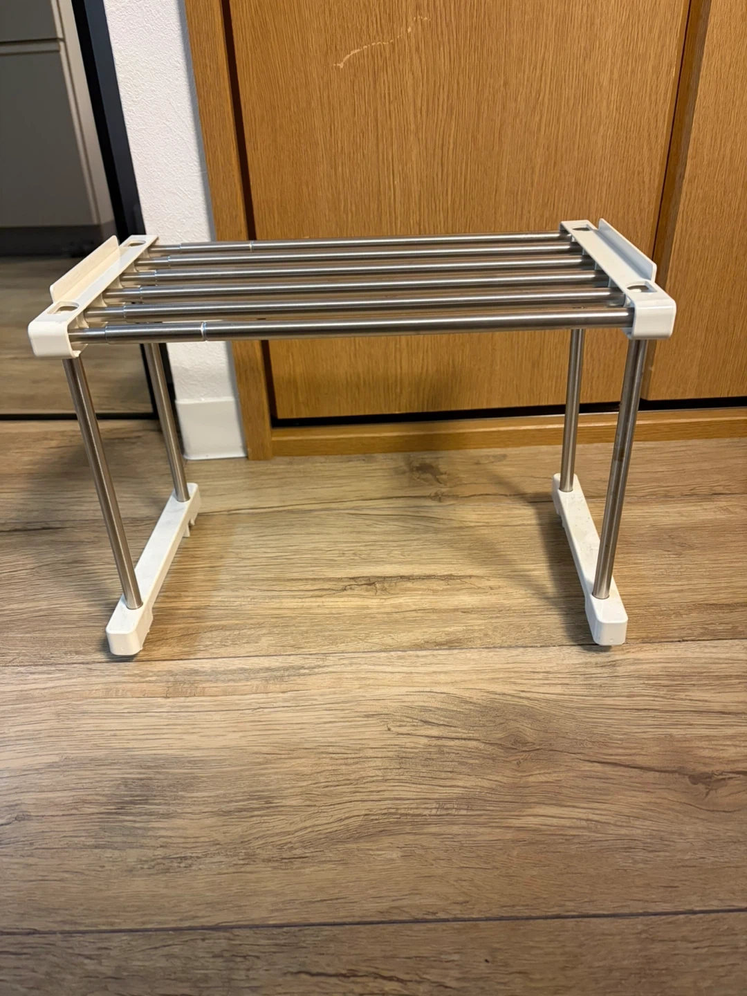 収納ラック ・シルバーと白の組み合わせ ・キッチンや洗面所などで使用可能 ・サイズ:高さ23/幅30〜52.5/奥行き19(cm) 中古品であることご了承ください 年内中、お早めの時期でご都合が合う方、マイバックご持参で来ていただける方、指定場所に取りに来ていただける方限定。複数のお申し込み大歓迎です。 先着順です。お返事遅い方、こちらの質問にご回答いただけない方は、次の方にお譲りする場合もございますのでご了承ください。 ご不明点があればお気軽にご連絡ください。