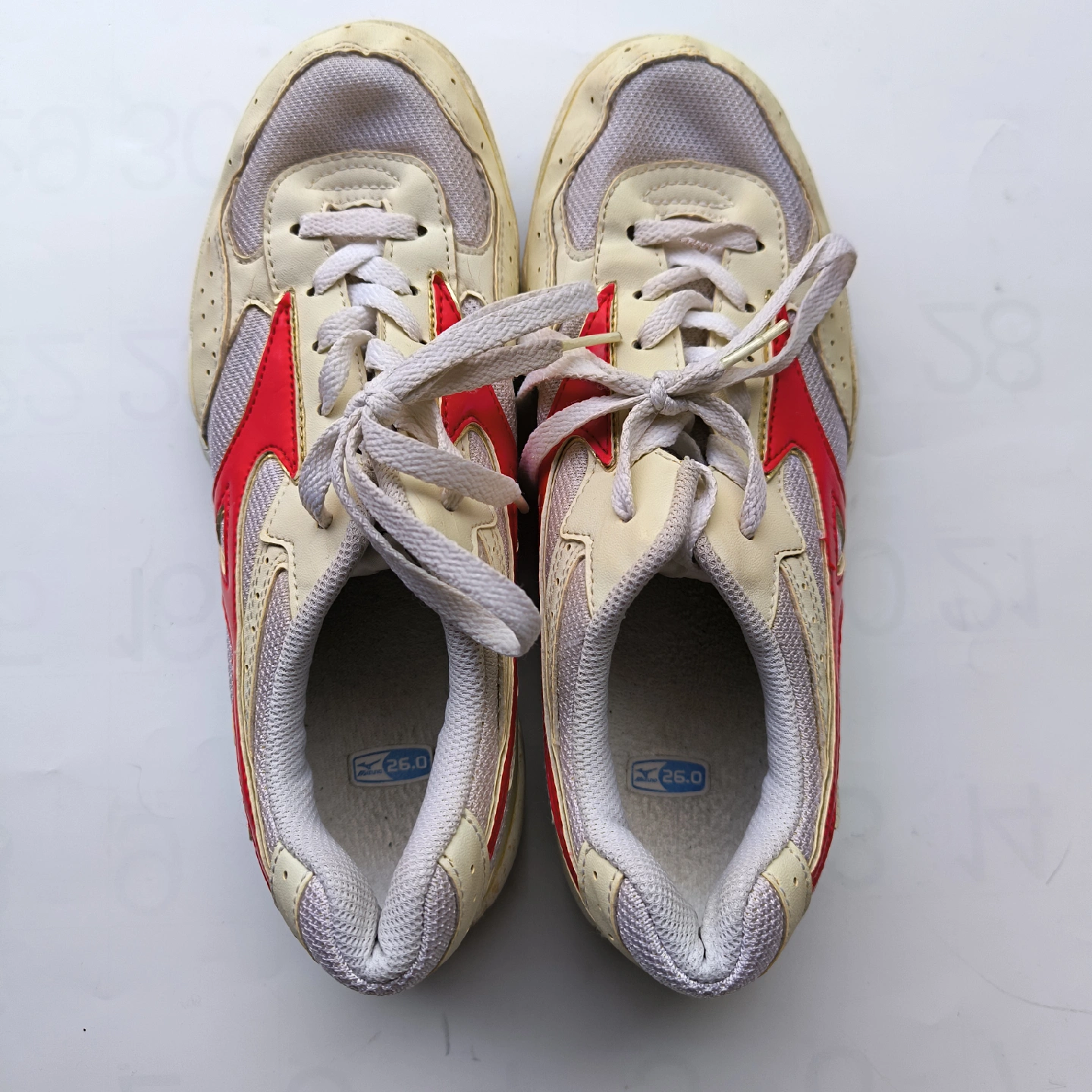 ミズノのスニーカーです。 ・サイズ:26.0cm ・色:白、赤 ・使用感、汚れあり ・付属品:シューズ袋 体育館履きとして使用していました。 実用的には問題ないと思います。 中古品であることご了承ください