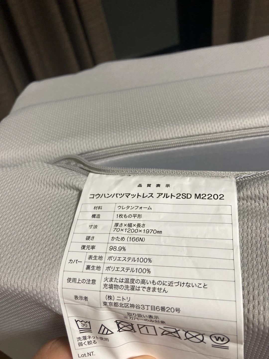 ニトリのコウハンパツマットレス アルト2SD M2202です 【情報】 ブランド:ニトリ 商品名:コウハンパツマットレス アルト2SD 型番:M2202 サイズ:70×1200×1970mm 【状態】 新品購入。 知人の旅行期間中のみの使用で、使用期間が3週間と短いため状態は非常に良いです。 中古品であることご了承ください