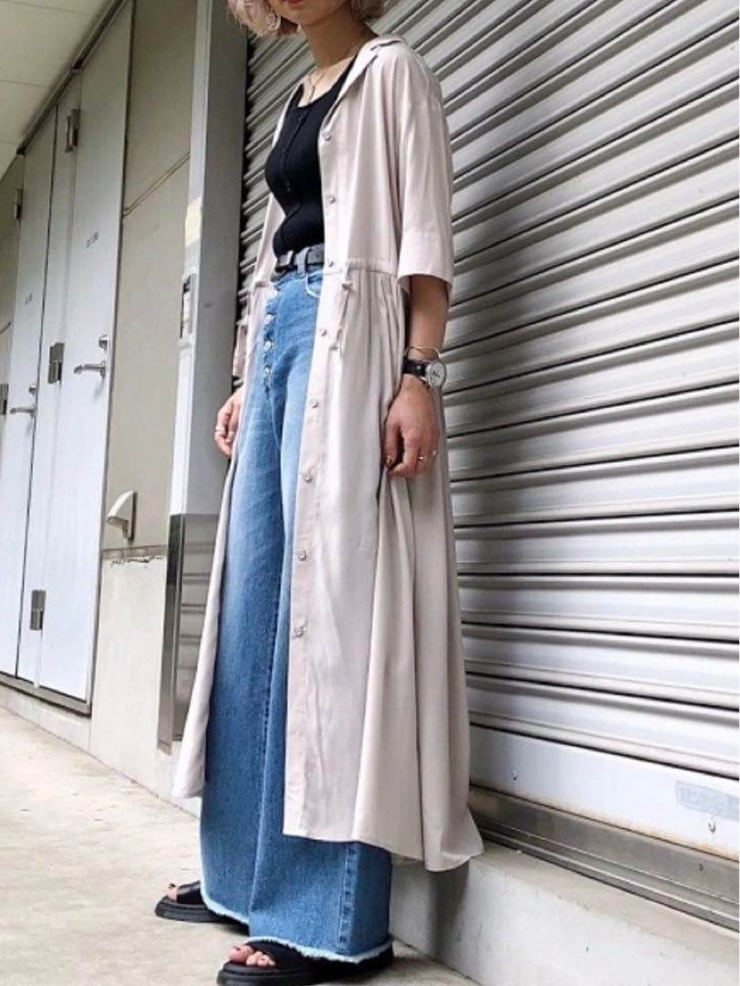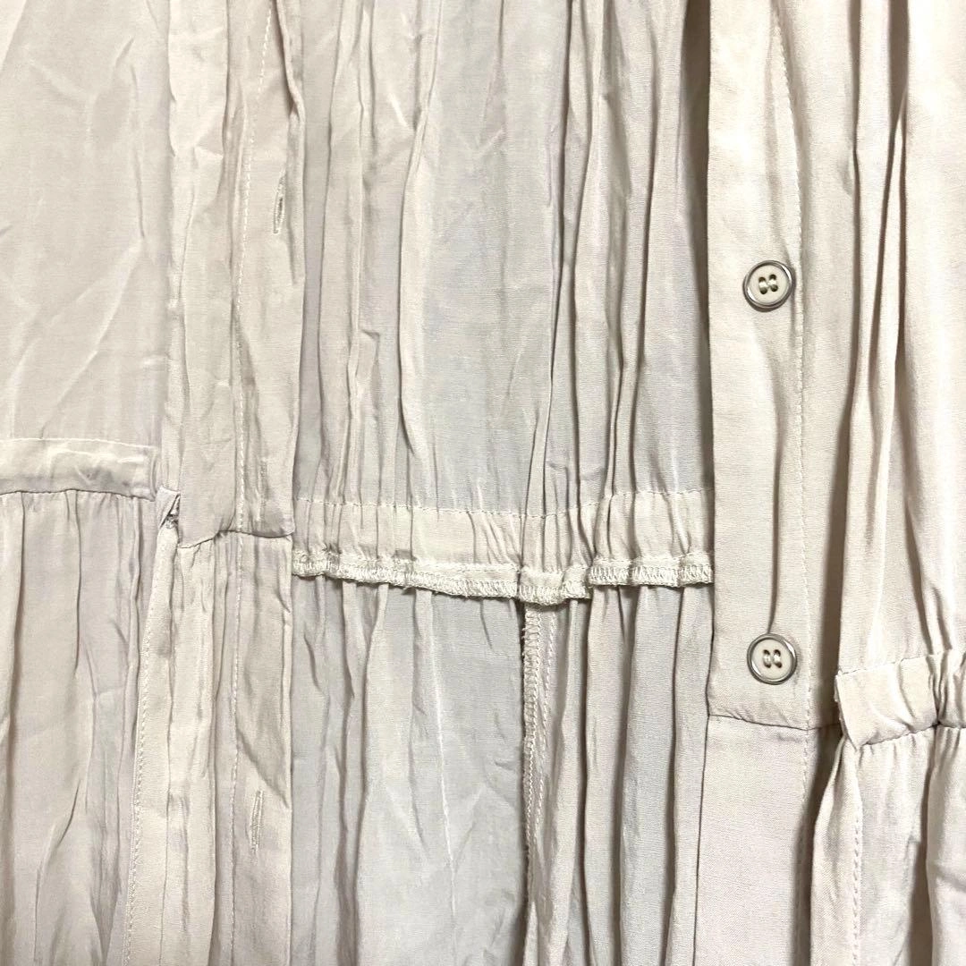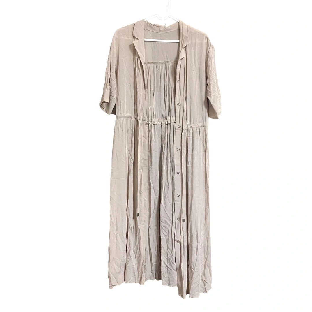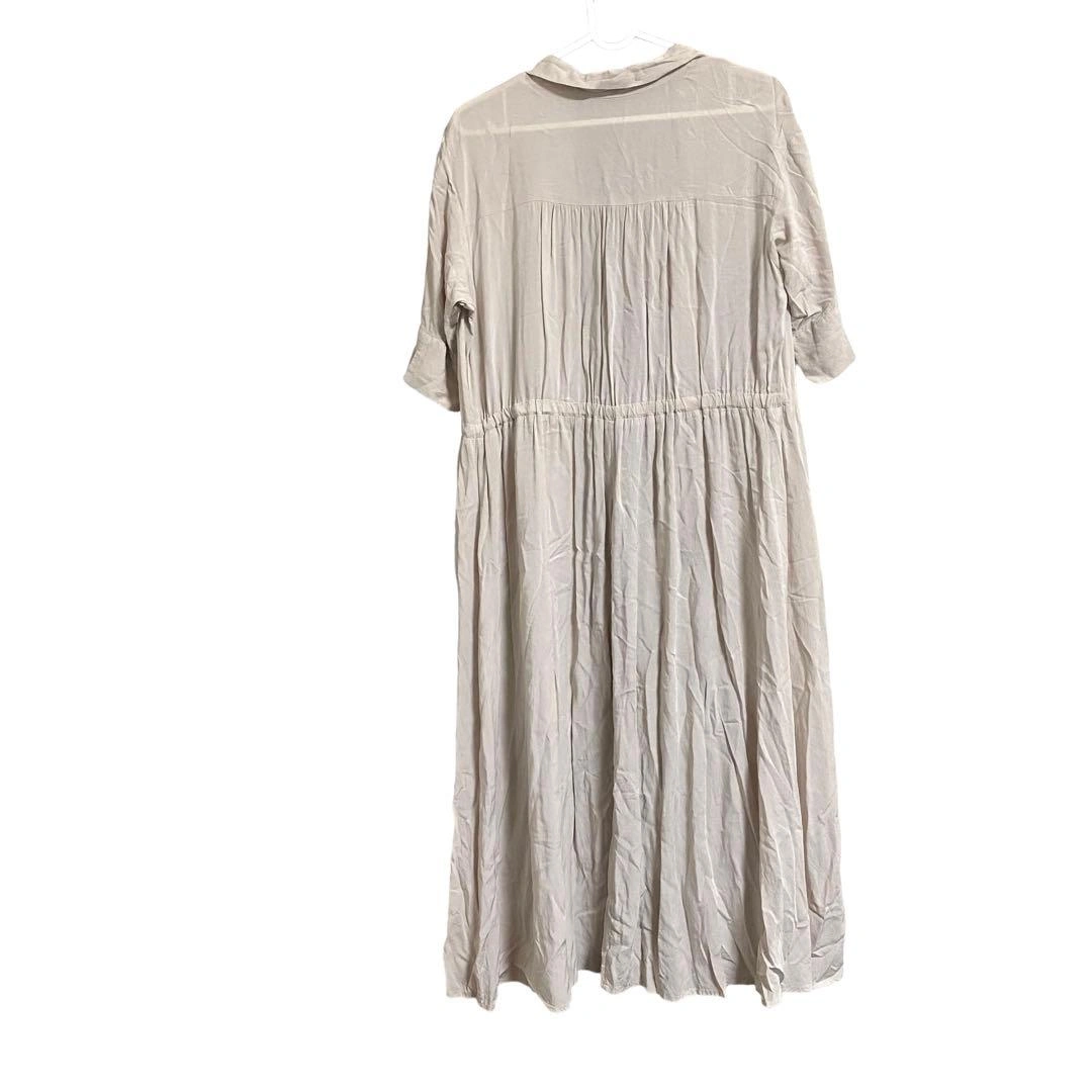 定価6,050円。 レーヨン素材を使用した開襟ワンピースです。イージーケア加工でシワになりにくく、お手入れが簡単です。 ウエストをブラウジングしてシルエットをアレンジしたり、羽織としてもお使いいただけます。 サイズ 肩幅▶︎49cm 身幅▶︎47cm 着丈▶︎110cm カラー···ベージュ、ライトグレー 柄・デザイン···無地 袖丈···半袖 季節感···春、夏、秋 数回着用し、保管していました。シワがありますが、洗濯アイロンで問題ありません。特に後ろ側はシャーリングっぽくなっているので、シワに見えやすいです。 カラーはベージュ強めのライトグレーです。 ご希望の方はお気軽にご連絡ください。