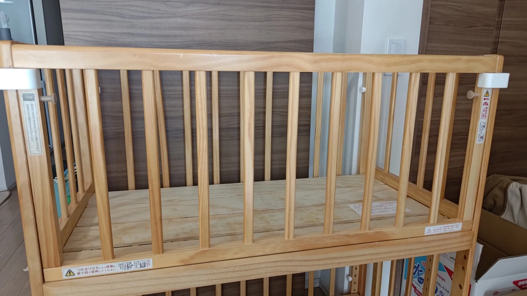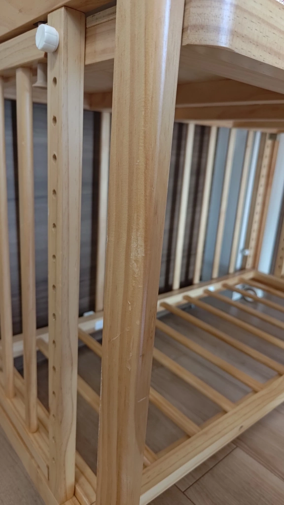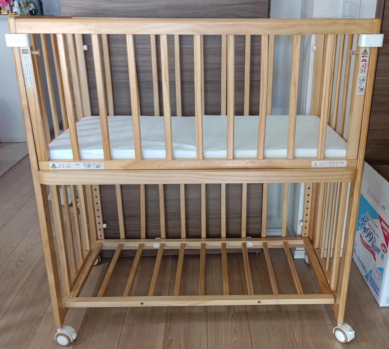 2018年に新品を購入して2人の赤ちゃんが使用した特殊サイズのミニベビーベッドです。 【商品名】大和屋 そいねーる+ムーブ 【購入時価格】約24,000円 【サイズ】縦:100cm、横:95cm程度、奥行き:51cm程度 【傷などの状態】赤ちゃんが噛んだり、開閉扉の開け閉め、大人用ベッドとの擦れなどの通常使用による小さい傷がたくさんあります。 【付属品】取扱説明書や固定用ベルトなど揃っています。 一般的なミニベビーベッドよりも更に小さい特殊サイズのミニベビーベッドなので圧迫感が少なく、あまり広くない寝室やリビングでの使用に向いています! 大人のベッドにベルトで固定して添い寝ベッドとしても使うことができます。 キャスター付きなので夜は寝室、昼間はリビングに持って行くなどの使い方もしやすいです。 ベッド下は収納としてオムツなどもたくさん置けます。(側面が開くので添い寝ベッドにしていても使えます) 【以下の品、ご希望あれば無料でお付けします】 ①元々の付属マットレス 1人目使用後に適当な保管をしてしまっていたためダニなどの心配があるかもしれませんがそれでもよければ。 ②写真のマットレス 2人目の時(2024年)に自分でベッドに合わせてカットしたものです。そのためカバーが適当に手縫いされてますが、シーツかければ気にならないと思います。汚れはないです。 ③専用のベッドガード 洗濯済みではありますが、ヨダレによる変色が残ってしまっています。 ④パイル素材の防水シーツ2枚 2018年に西松屋で購入。洗濯済みですが、毛玉など使用感はあります。 ⑤西川製の掛ふとん 洗濯済みでシミなどはないですが2018年購入のものです。 【希望取引場所】JR南武線 中野島駅から徒歩5分程度の場所 こちらまで取りに来てくださる方のみお譲りします。解体した状態でお渡しします。 ドタキャンせず責任を持って対応していただける方、中古品のためサイズや状態などが目安であることをご了承いただける方のみお問い合わせください。 お値下げも応相談です(常識範囲で)。よろしくお願いいたします。