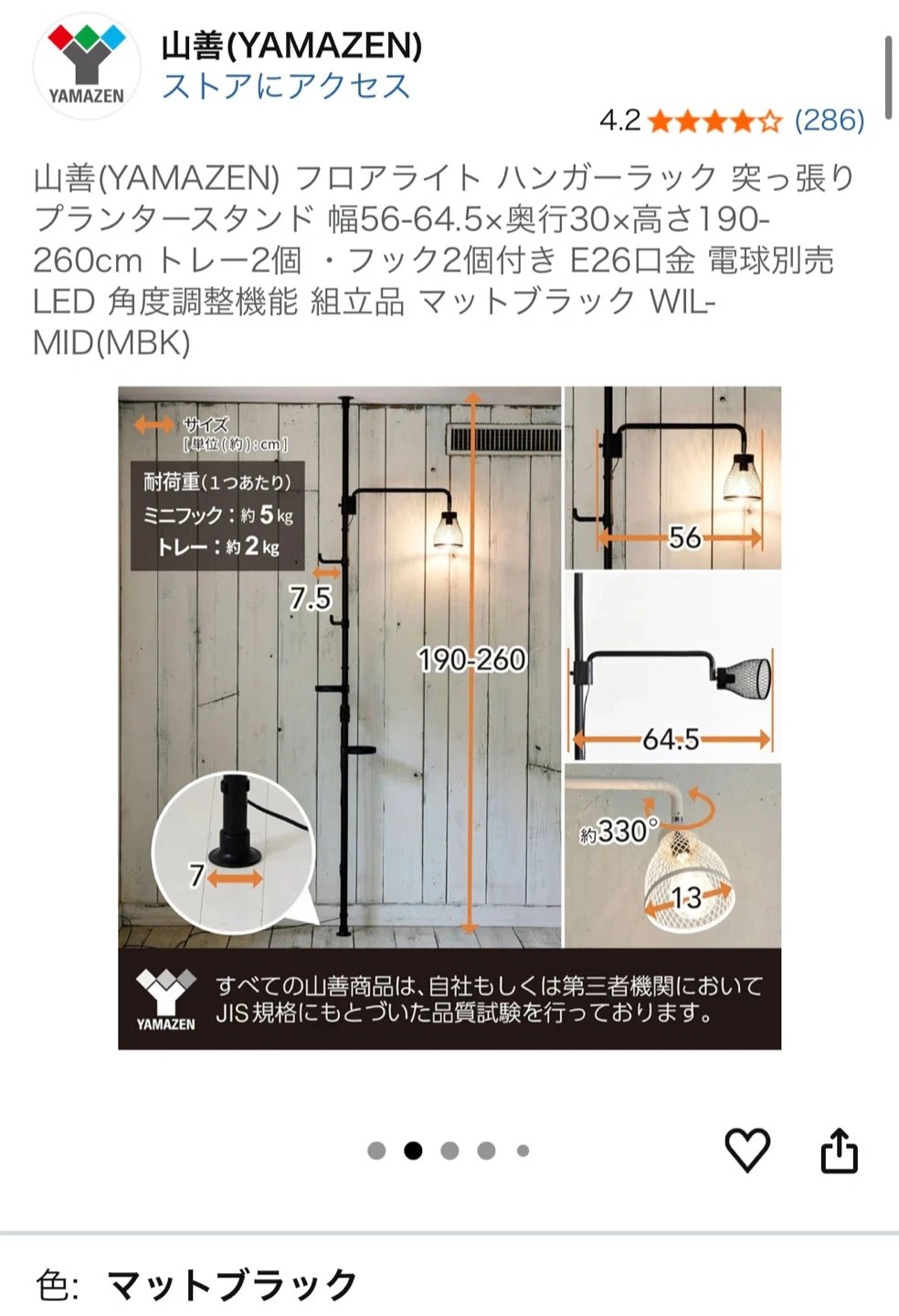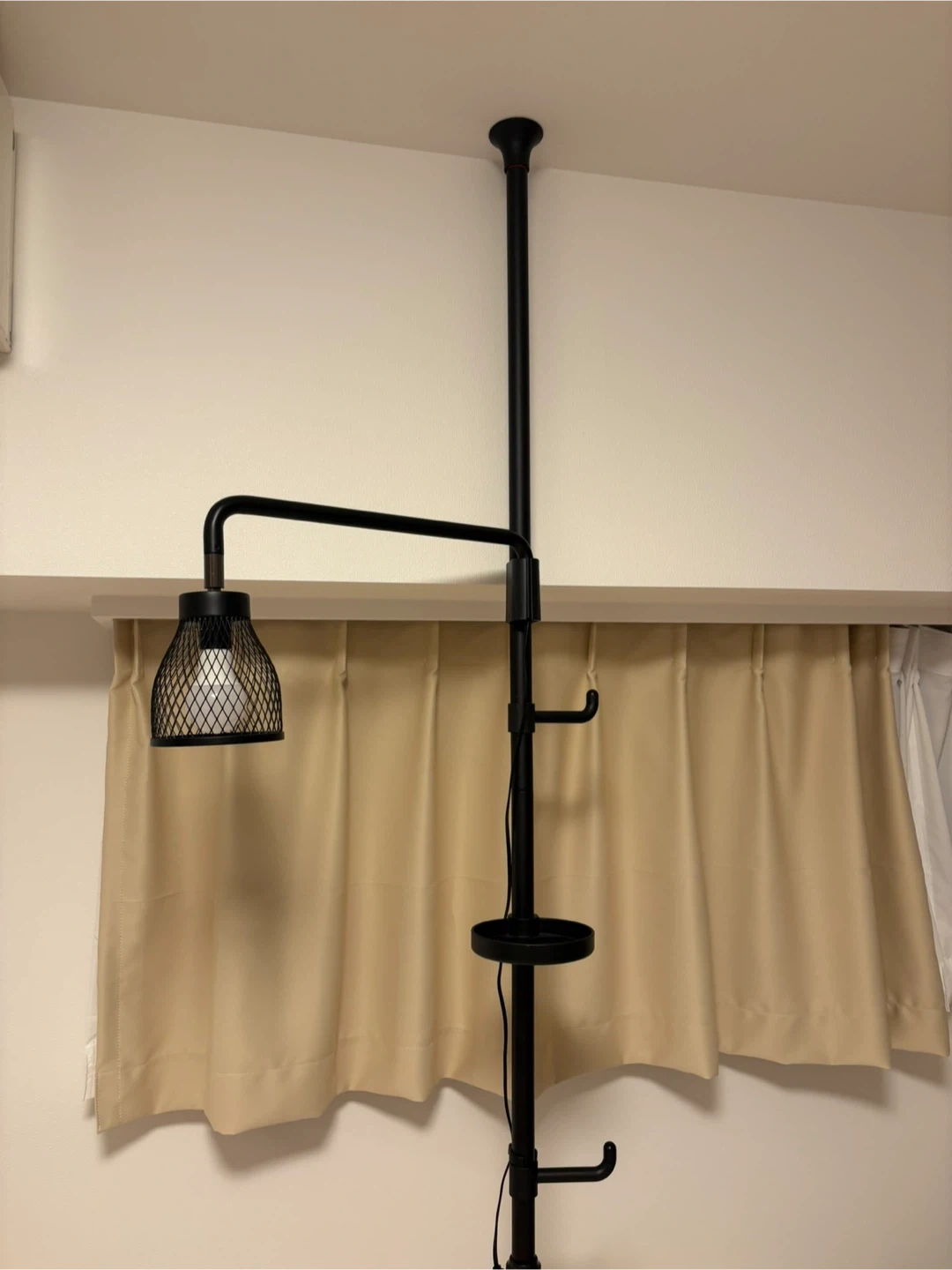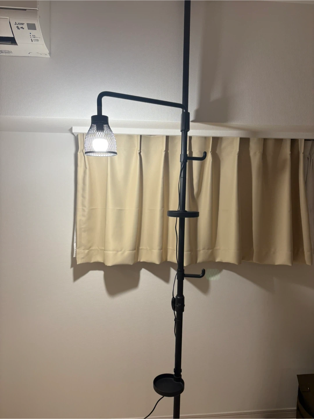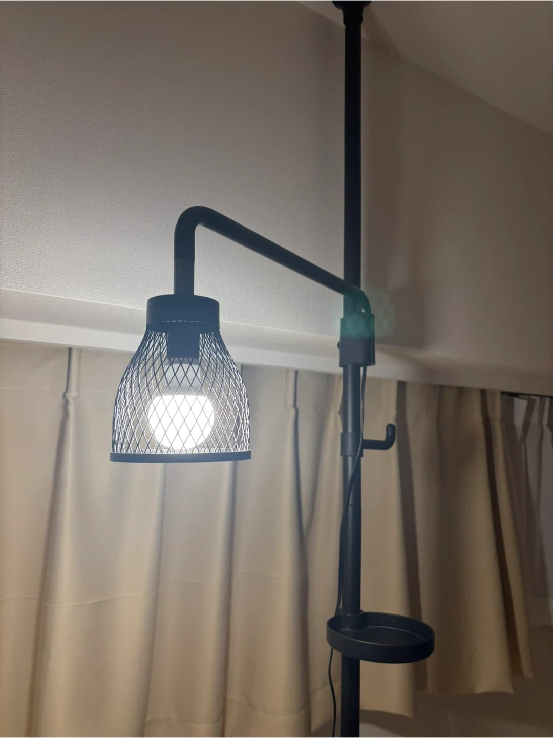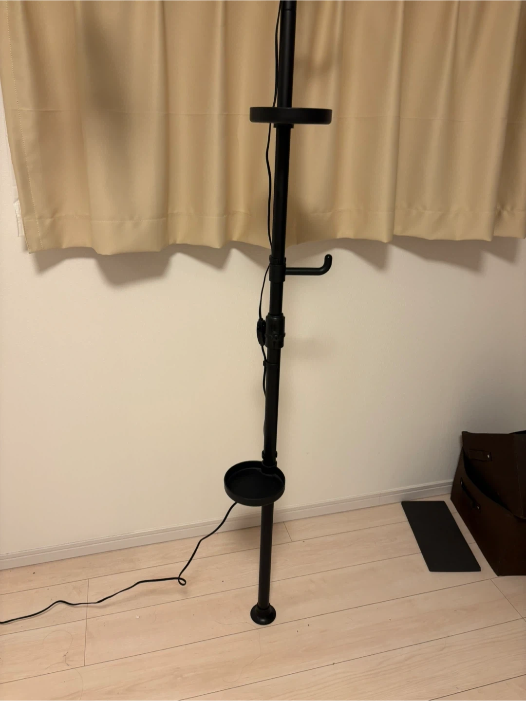 ✨山善(YAMAZEN)つっぱり式フロアスタンドライト✨ お部屋の雰囲気づくりに◎ 省スペースで使える便利なライトです! 【商品特徴】 ・天井と床で突っ張って設置するタイプのスタンドライト ・安定感があり、省スペースでどこにでも置きやすいデザイン ・メッシュシェードでオシャレ&柔らかい光 ・小物を置けるトレイ付き(2段) ・フックも付いていて、カバンやヘッドホンなどを掛けられます ・LED電球付き(そのまま使用可能) 【買い値】 14,000円 【状態】 ・購入して1年半程経ちますが、外傷はほとんどないです! ・動作確認済み、ライト点灯します ・目立つ傷や汚れなし、全体的にキレイな状態 ・ペット・喫煙なしの環境で使用 【サイズ感】 ・高さ:天井突っ張り式のため調整可能 ・カラー:ブラック 【お渡しについて】 ・東京 都大田区の自宅付近まで取りに来ていただける方を優先します ※中古品のため多少の傷、汚れはご了承下さい