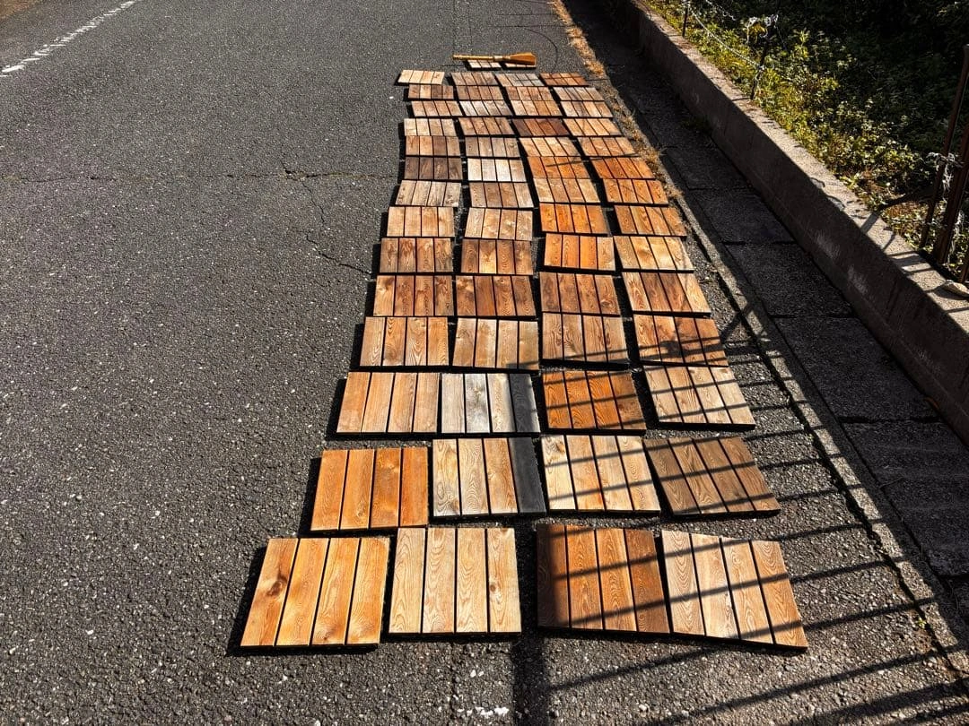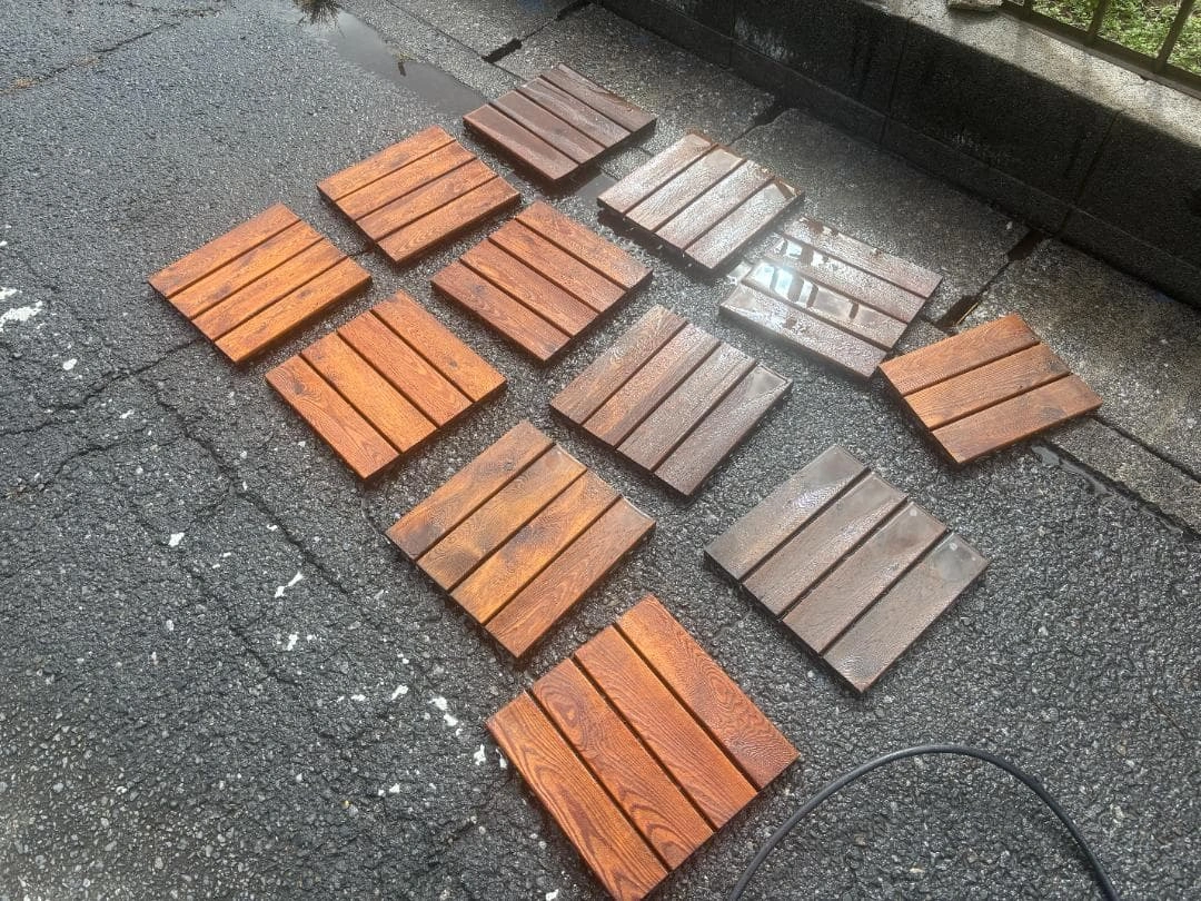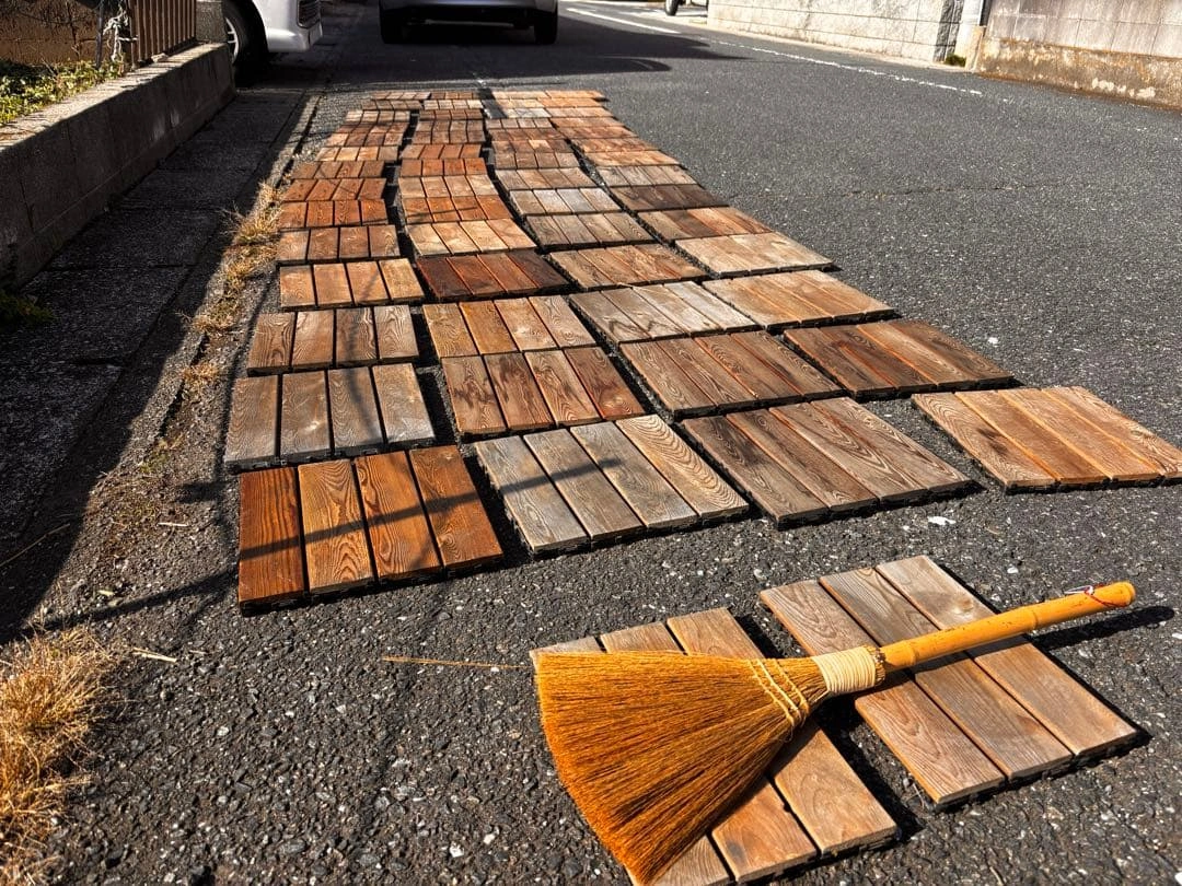 倉庫が圧迫してきたので早めに処分したく思います!! 木目デザインが特徴のブラウン系タイルです。 屋外・屋内どちらにも使用でき、ベランダやデッキなどに最適です。 デザイン:木目調タイル カラー:ブラウン系 サイズ:1枚あたり 約30cm × 30cm 数量:56枚セット+端数2枚 用途:屋外・屋内のデッキ・フロアなど 現在、屋外に設置していたため、経年劣化やささくれなどの使用感があります。 中古品としてご理解のうえご検討ください。