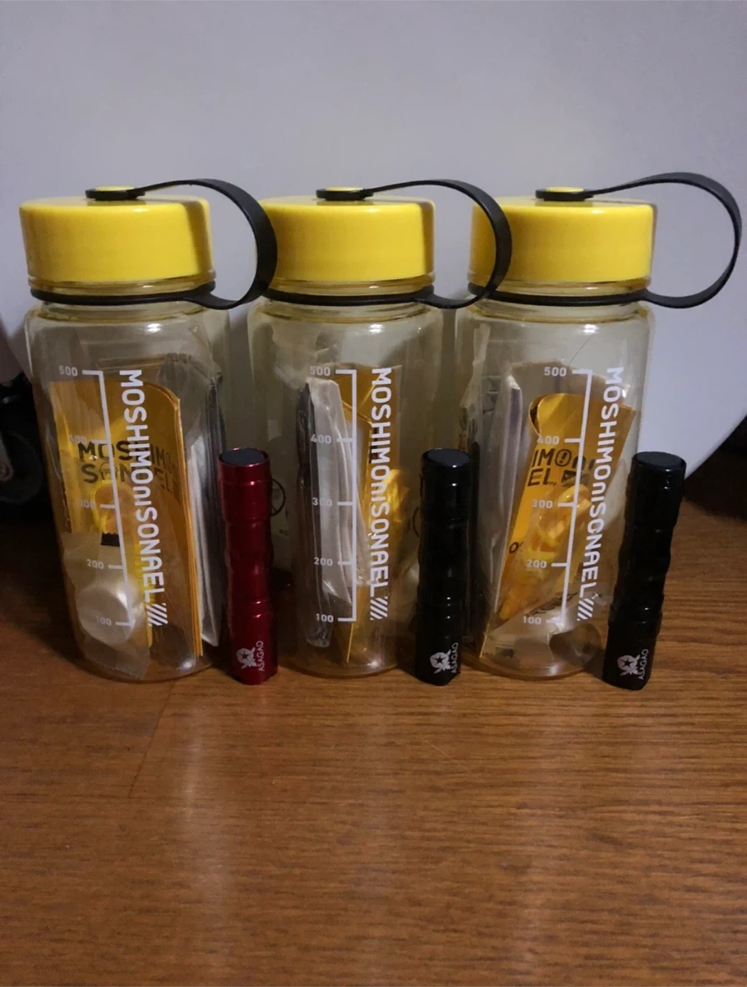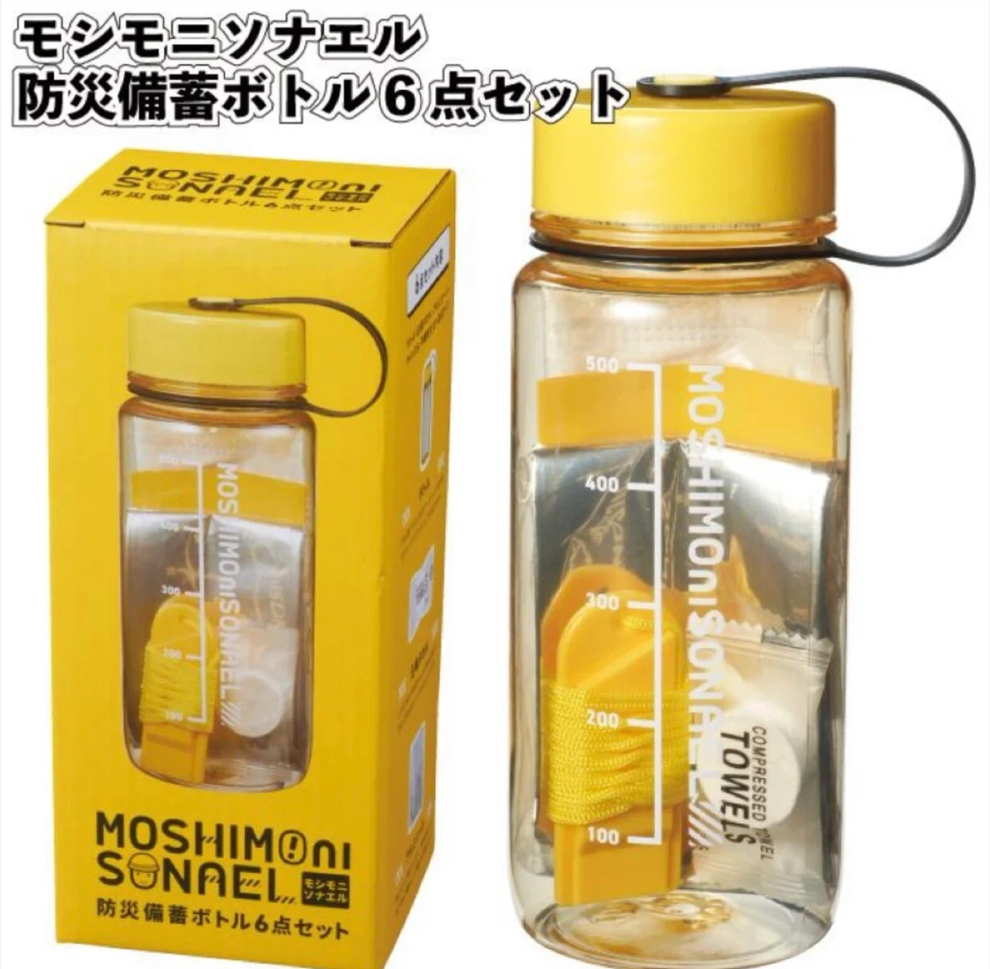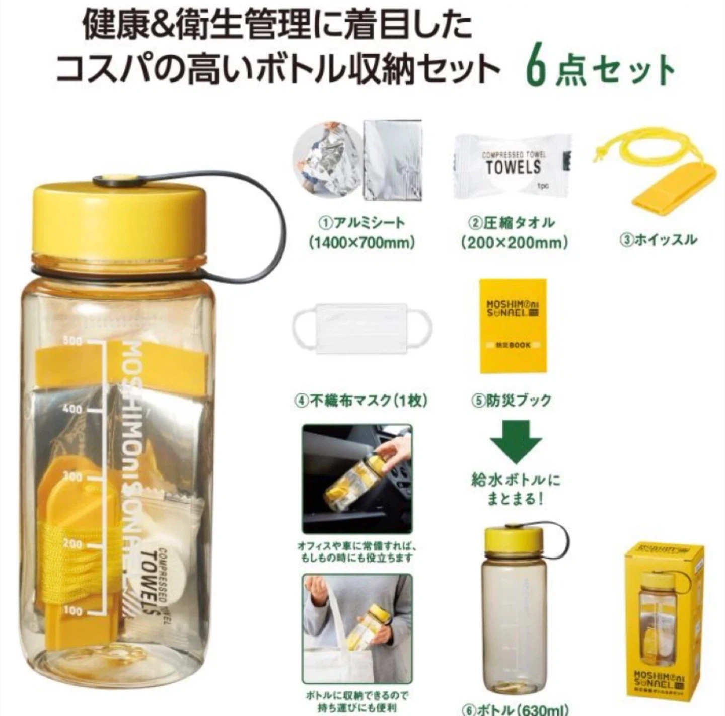 モシモニソナエルの防災備蓄ボトル6点セット×3個 +🎁ミニライト付属 【情報】 ブランド:モシモニソナエル セット内容: ボトル 容量:630ml(ボトル) 色:クリア、イエロー アルミシート1400×1700mm 圧縮タオル200×200mm 不織布マスク ホイッスル 防災ブック +🎁ミニライト(電池付) 【状態】 未使用品 ⚠️外箱はありません 新古品であることご了承ください