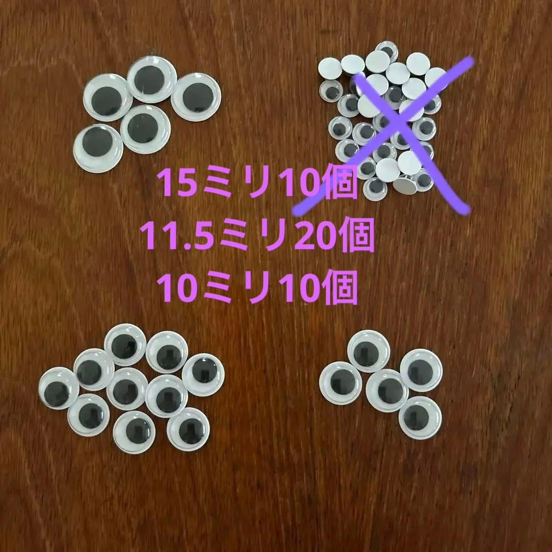 動く目玉セットです。 個数は↓になります! (写真は商品の参考) 15ミリ 10個 11.5ミリ 20個 10ミリ 10個 新品未使用分です。 素人採寸、自宅保管にご理解ある方のみ宜しくお願い致します。 #手芸パーツ #目玉 用途···デコレーションパーツ 用途···人形 販売方法···セット売り/まとめ売り 種類···ぬいぐるみ ご希望の方はお気軽にご連絡ください。