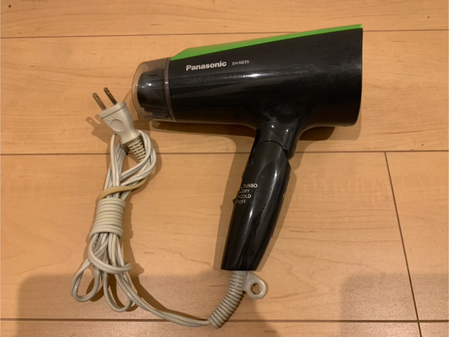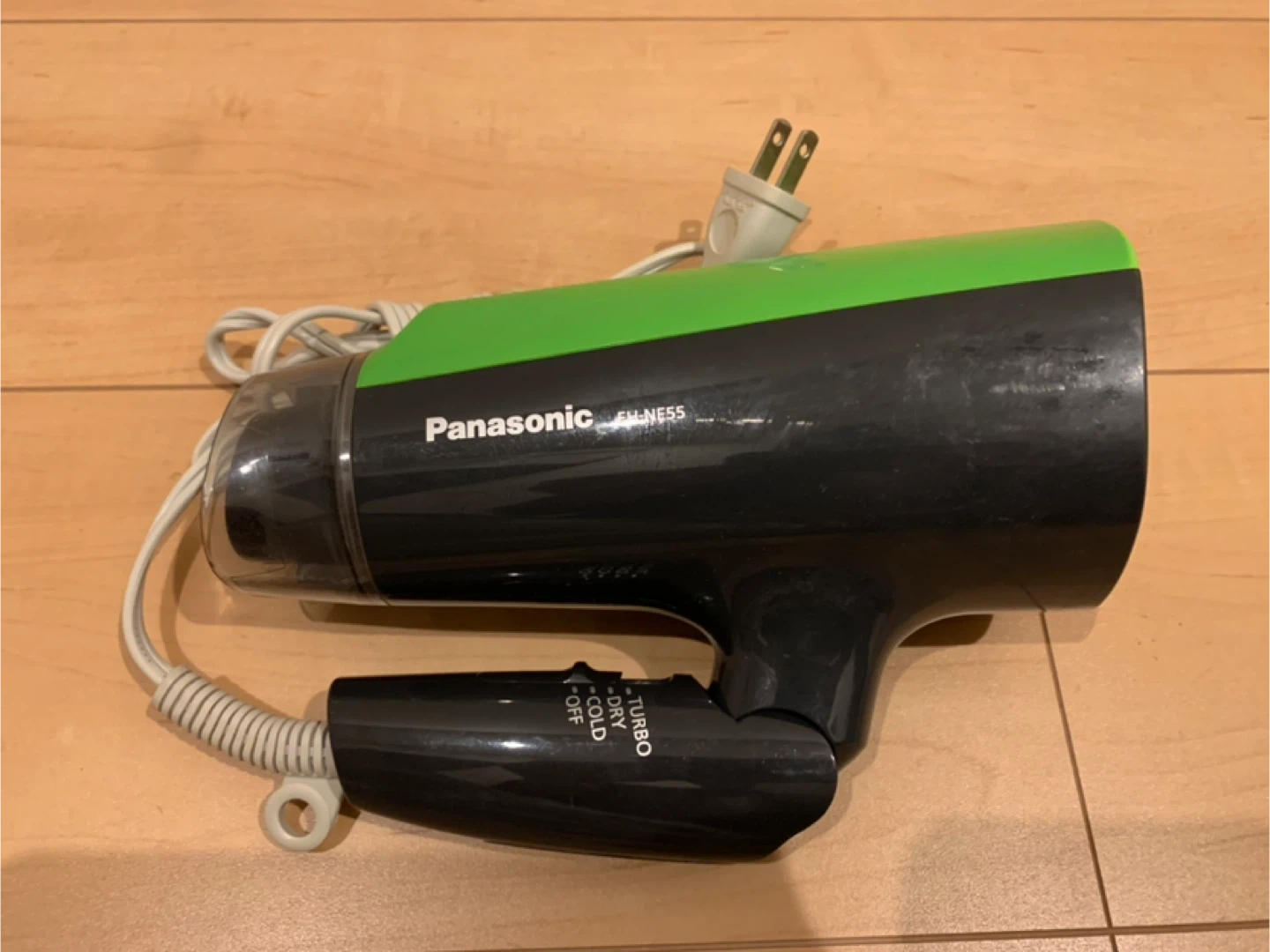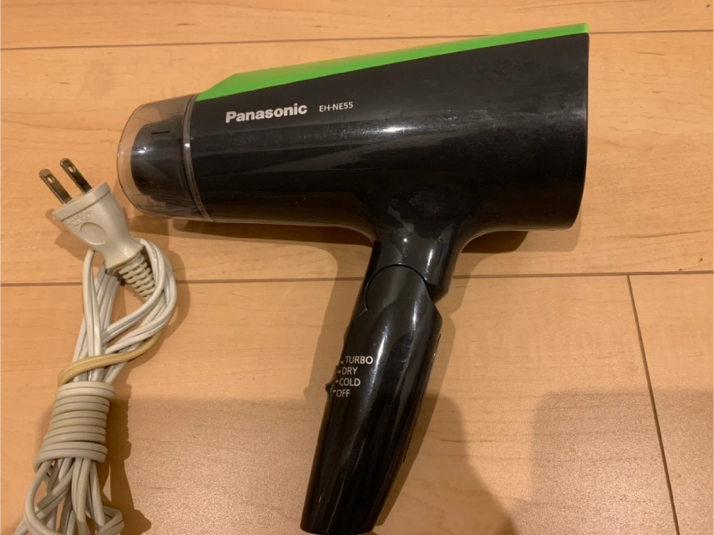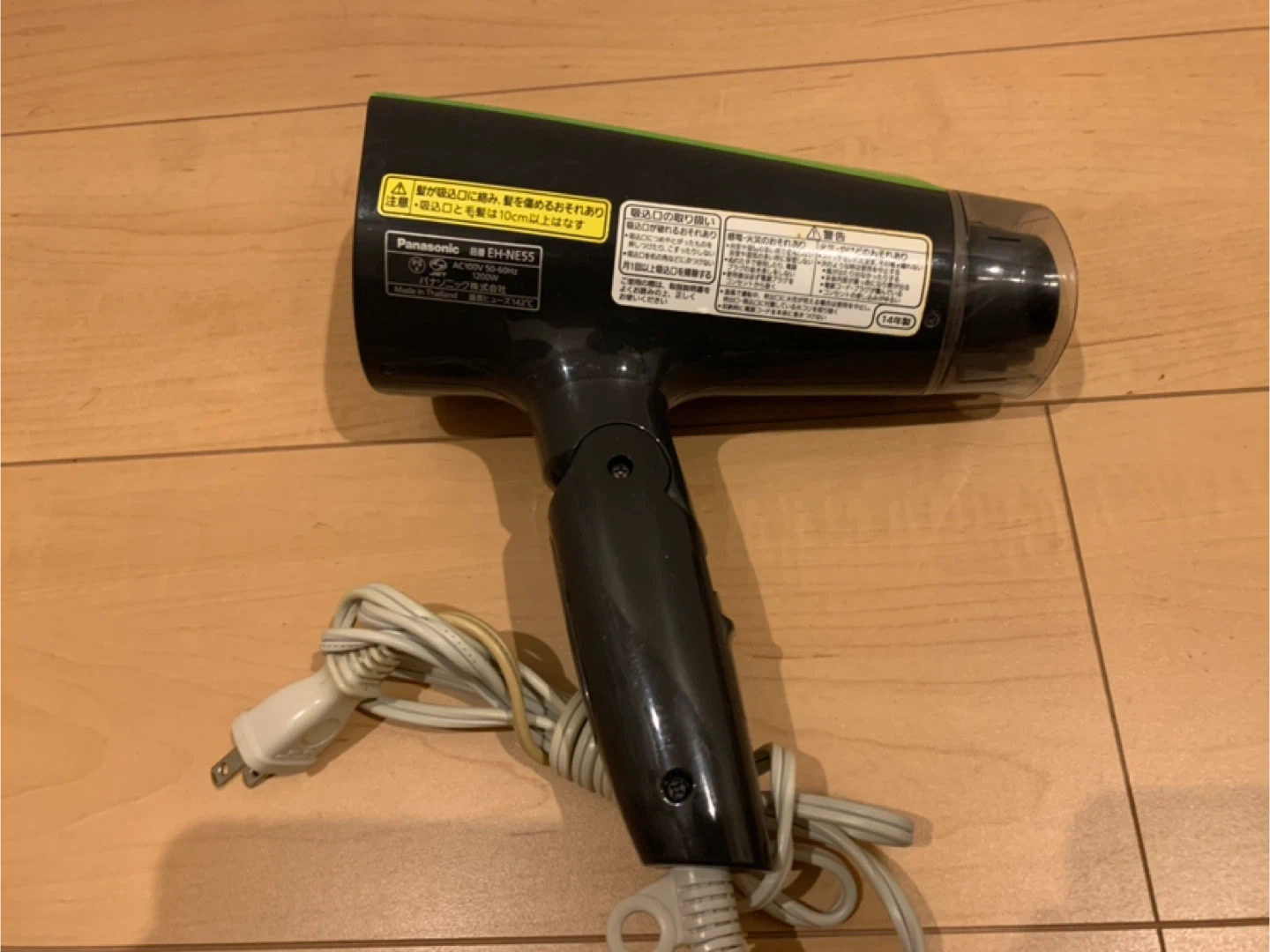 ドライヤー パナソニック EH-NE55 パナソニックのヘアドライヤーです 【情報】 ブランド:パナソニック 型番:EH-NE55 色:ブラック、グリーン 【状態】 使用感あり 中古品であることご了承ください 【公式ページより】 1.8立方メートル/分※1の大風量でパワフル乾燥 速乾ノズルでスピーディ乾燥 マイナスイオン※2を熱から守る外付けイオン吹出口 【スペック】 電源方式 AC100V 50/60Hz マイナスイオン ○ 消費電力 1200W(ターボ時) 折りたたみ式 ○ 温風温度 約80℃(ターボ時)/約100℃(ドライ時)(室温30℃の時) 風量 1.8m立方メートル/分(ターボ時) 速乾ノズル ○ 電源コード長さ 約1.6m 本体寸法 高さ21.7×幅20.8×奥行9.2cm 本体質量(重量) 約510g 生産国 タイ製