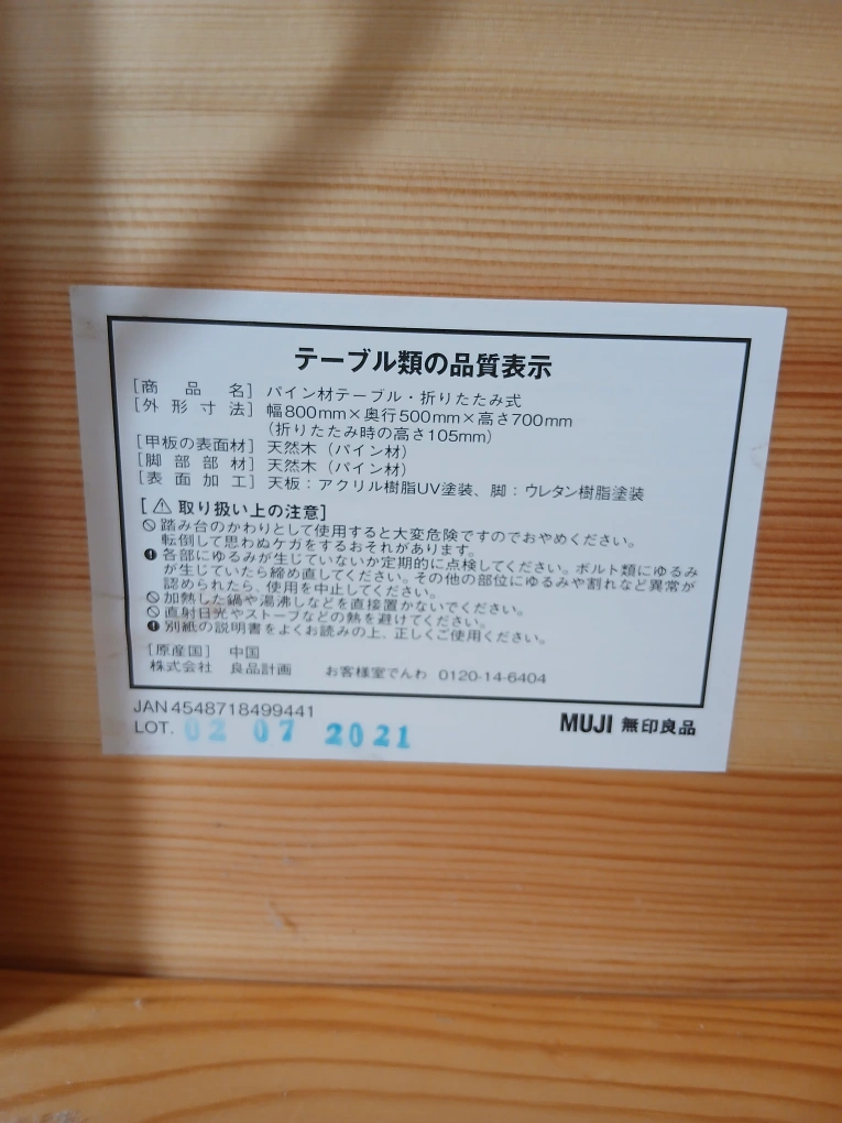 無印良品の折りたたみ式テーブルです 【情報】 ブランド:ムジ(無印良品) 商品名:パイン材テーブル・折りたたみ式 サイズ:幅800mm x 奥行500mm x 高さ700mm(折りたたみ時高さ105mm) 素材: • 甲板の表面材:天然木(パイン材) • 脚部:天然木(パイン材) 表面加工: • 天板:アクリル樹脂UV塗装 • 脚:ウレタン樹脂塗装 製造年月日:2021年7月 中古品であることご了承ください