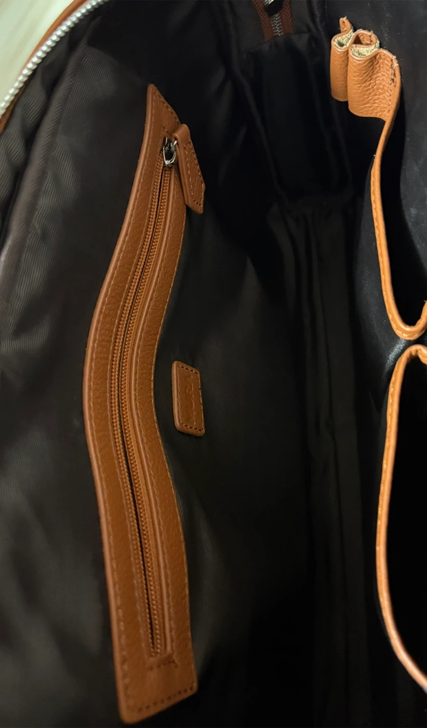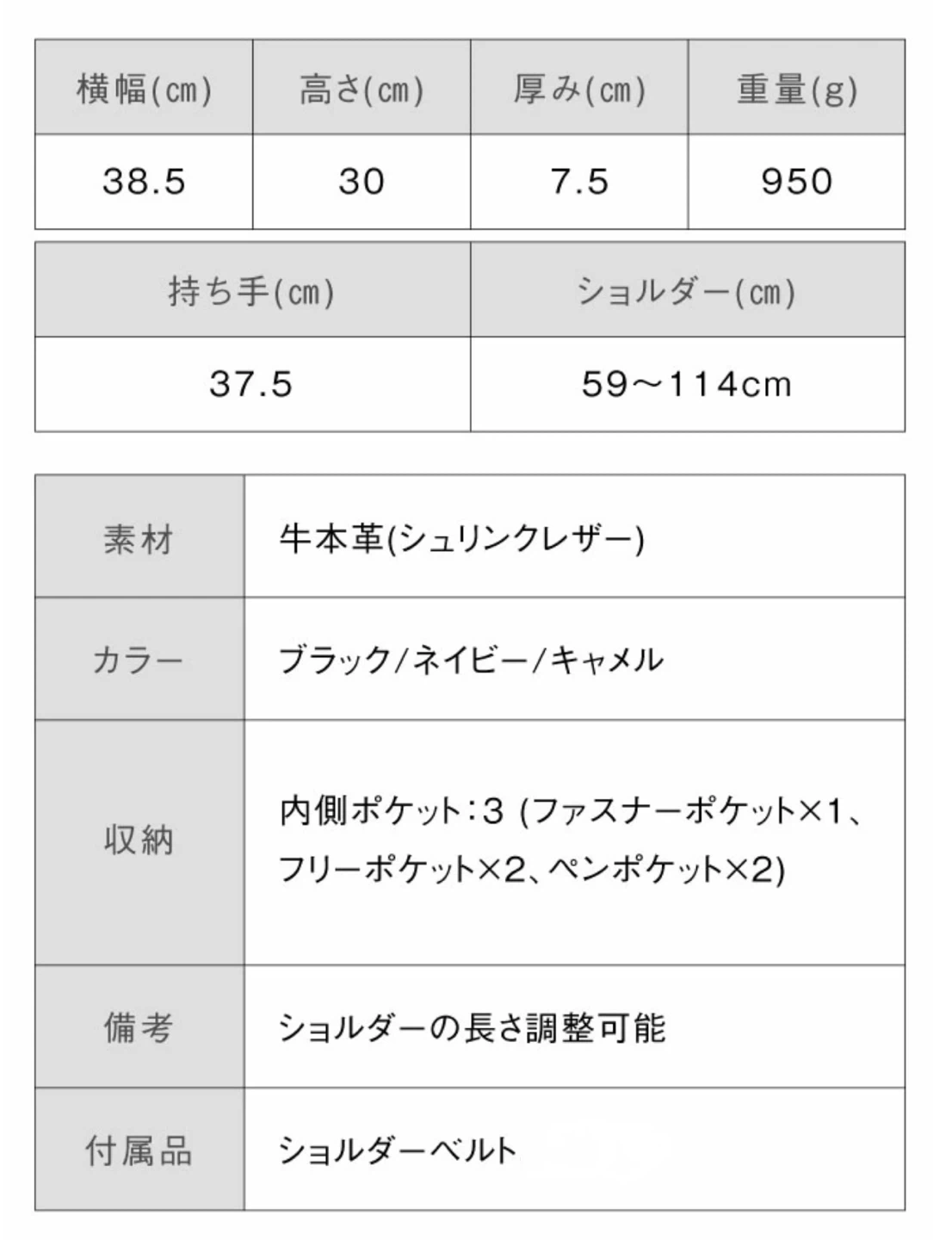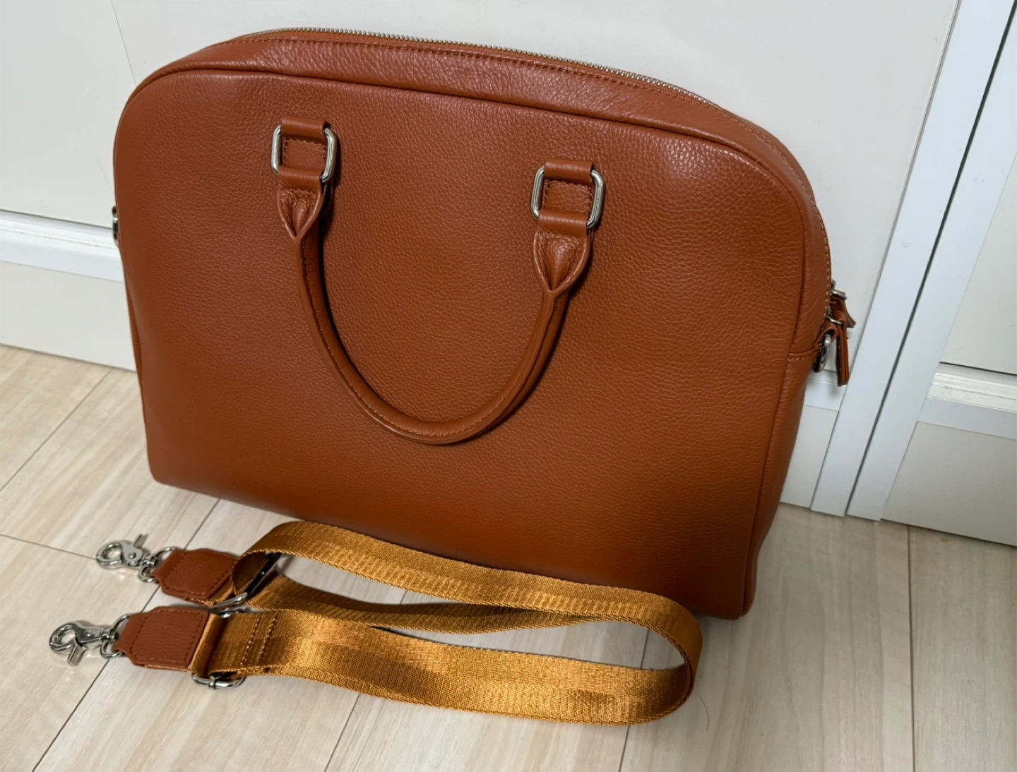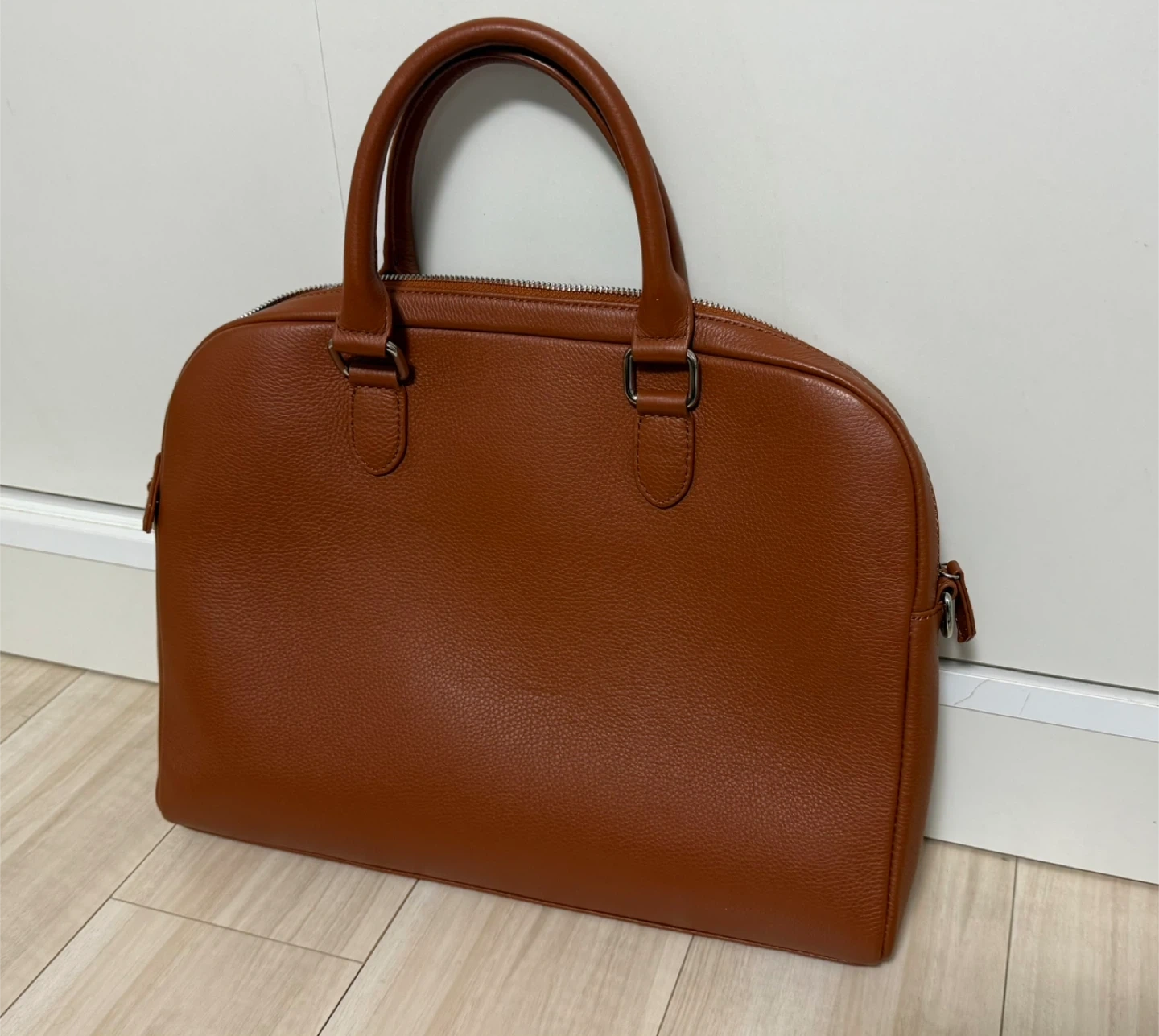 ムラのレザーハンドバッグです。 【情報】 ブランド:ムラ 素材:牛本革(シュリンクレザー) カラー:キャメル サイズ: 横幅:38.5cm 高さ:30cm 厚み:7.5cm 持ち手:37.5cm ショルダー:59~114cm 【状態】 使用感少なめ 【付属品】 ショルダーベルト 2024年に購入。経年による金属部分の少しの擦れはありますが数回しか使用していませんで、皮のヘタレも少なくとてもきれいな状態です。 購入時価格は15000円ほどだったかと思います。