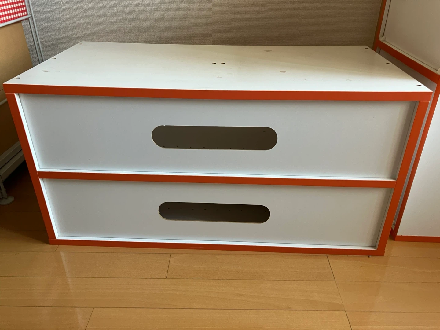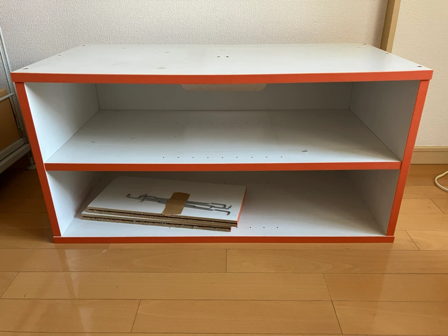 オレンジと白の2段カラーボックスです。 ・色:オレンジ、白 ・2段 ・使用感あり ・一部にシミあり 横長のカラーボックスです。 テレビ台に使用していました。 長く使用して来たので、汚れ傷等あります。 また、中古品であることご了承いただきます様お願いします。