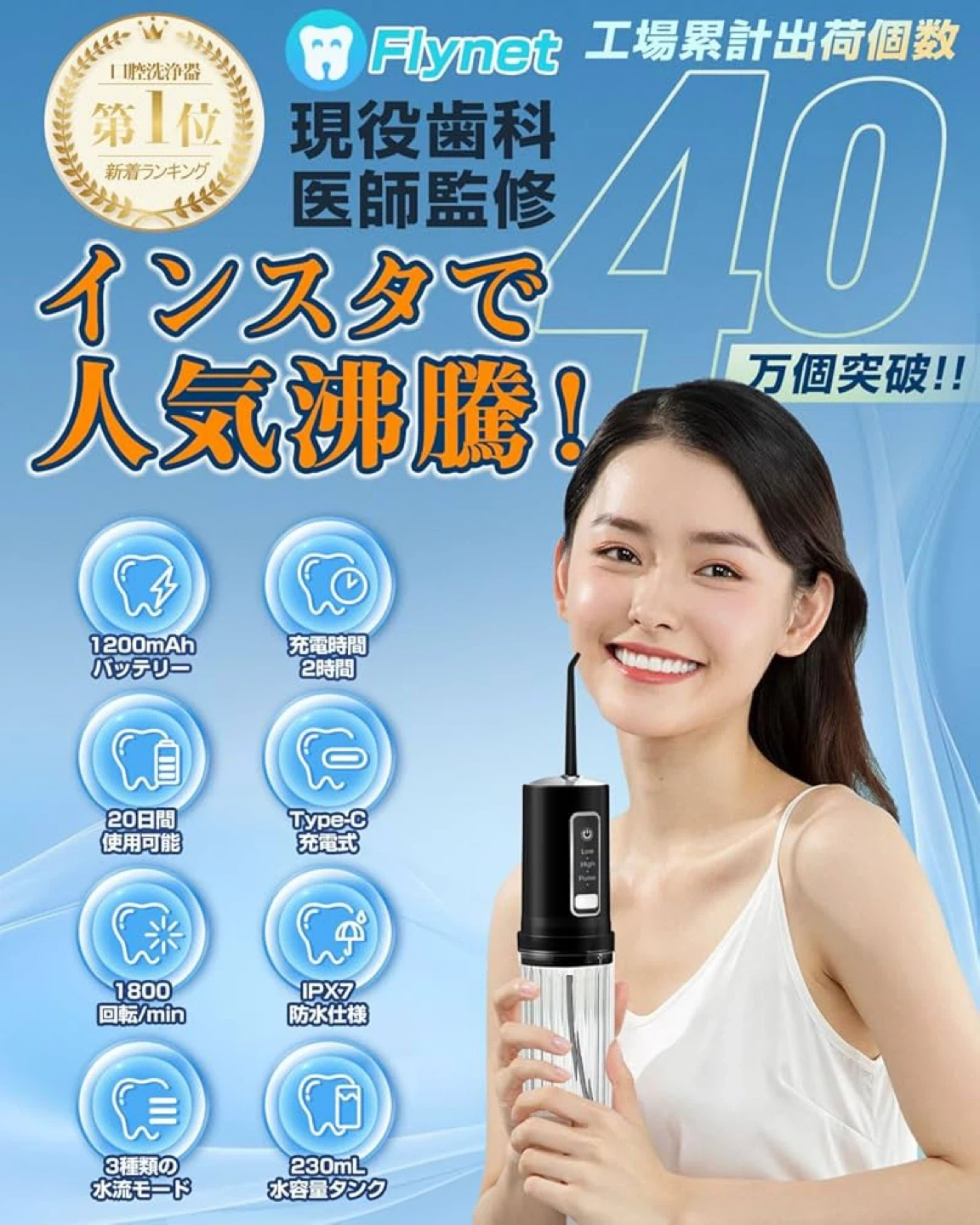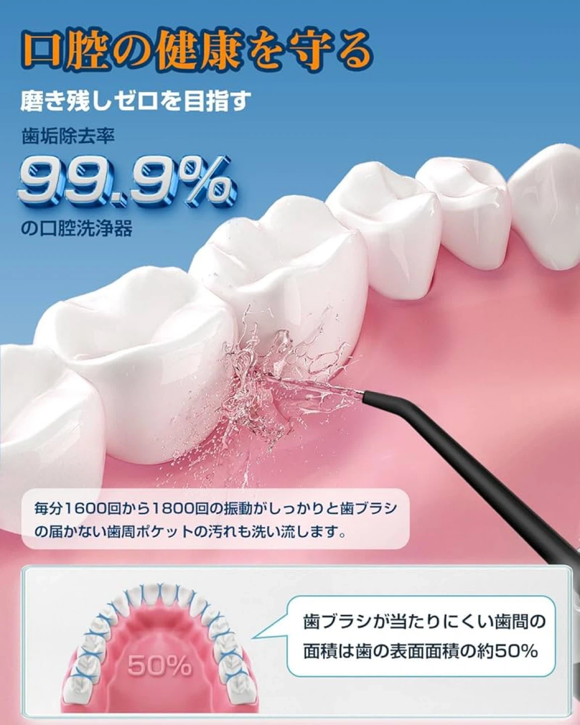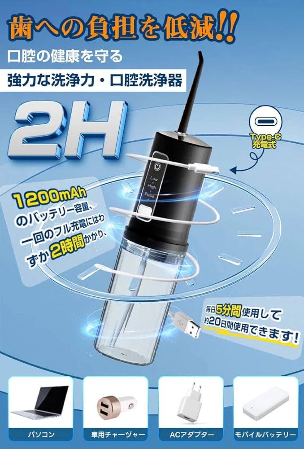 ・未使用(新品ですが検品のため開封してます) ・24時間以内返信 ・おまとめ割あり ・急な削除あり!お早目に! ⚠️複数購入希望の場合はコメントください^_^ 【人気急上昇!最新改良版口腔洗浄器】 歯のクリーニング需要が高まる中、最新アップグレード版が登場!ノズルは折れにくい強化仕様、水圧は初心者に優しい低水圧から、経験者も満足できる高水圧まで幅広く対応。 【強力洗浄&360度回転ノズル】 最新パルス水流技術を採用し、毎分1200〜1400回の振動で歯間汚れを徹底除去。360度回転ノズルで届きにくい部分も隅々まで洗浄。最大99.99%の食残渣を取り除き、爽快な口内環境へ。 【3モード+メモリー機能】 Low/High/Pulseの3種類の水流モードを搭載。ワンボタンで切替でき、前回設定を記憶するメモリー機能付き。初心者はLow、徹底洗浄はHigh、歯ぐきケアはPulseがおすすめ。 【最新水圧技術で徹底清掃】 従来品の20〜105PSIに比べ、当製品は60〜120PSIの強力水圧を実現。歯ブラシでは届かない汚れや食べかすを効果的に除去し、口内を清潔に保ち、口腔トラブルの予防にも最適。 【持ち運び便利&家族で使える】 本体は軽量240g、コンパクトサイズで旅行にも便利。2種類×4本ノズル付きで家族で共有可能。中央のノズル収納スロットと専用収納袋付きで整理も簡単。 【IPX7防水&大容量タンク】 入浴中でも使える防水仕様。230mlの大容量タンクで一度の給水でしっかり洗浄可能。底部の蓋付きでストローも清潔に保管できます。 【快適設計&安全機能】 人間工学に基づく持ちやすいデザイン。安全ロック機能で誤作動を防ぎ、お子様の使用も安心。ノイズリダクション設計で夜間使用も静か。 【Type-C急速充電】 1200mAhバッテリー搭載で、約2時間の充電で20日間使用可能。毎日のオーラルケアを快適にサポートします。 $$1780 g591