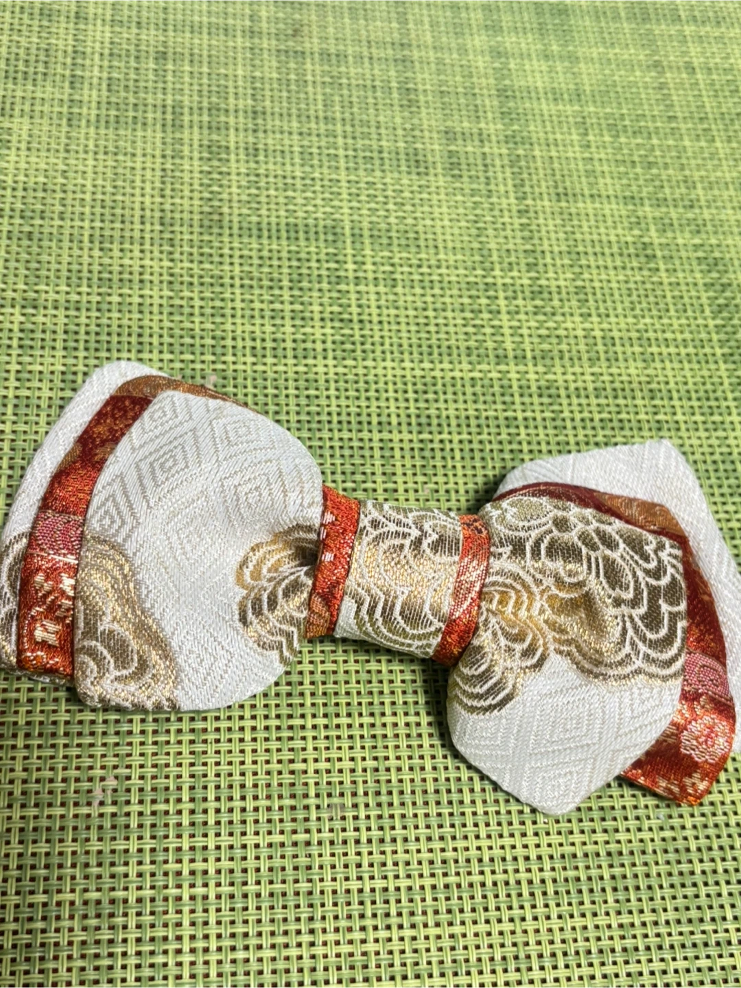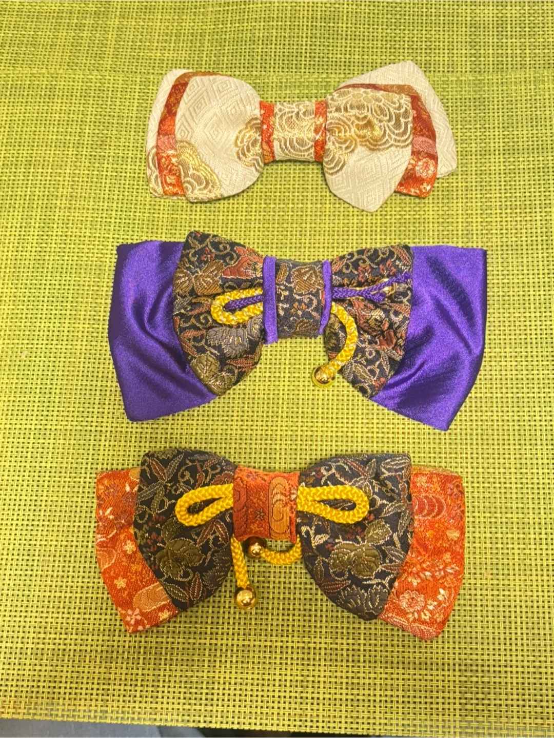手作りの和装用リボンです。 着付けをしておりまして、帯の端切れで着物に合うように手作りしました。 もう着物を着る事はないので、使って頂けるとうれしいです🥰🙏🏻 3点まとめての取引ですが、 どれか一つという事でしたらご連絡下さい。 「大きさ」 オレンジ:約16cm、 紫:約17cm、 白:15cm リボンの羽部分は3点とも約8cmです。 手作り中古品であることをご了承ください。
