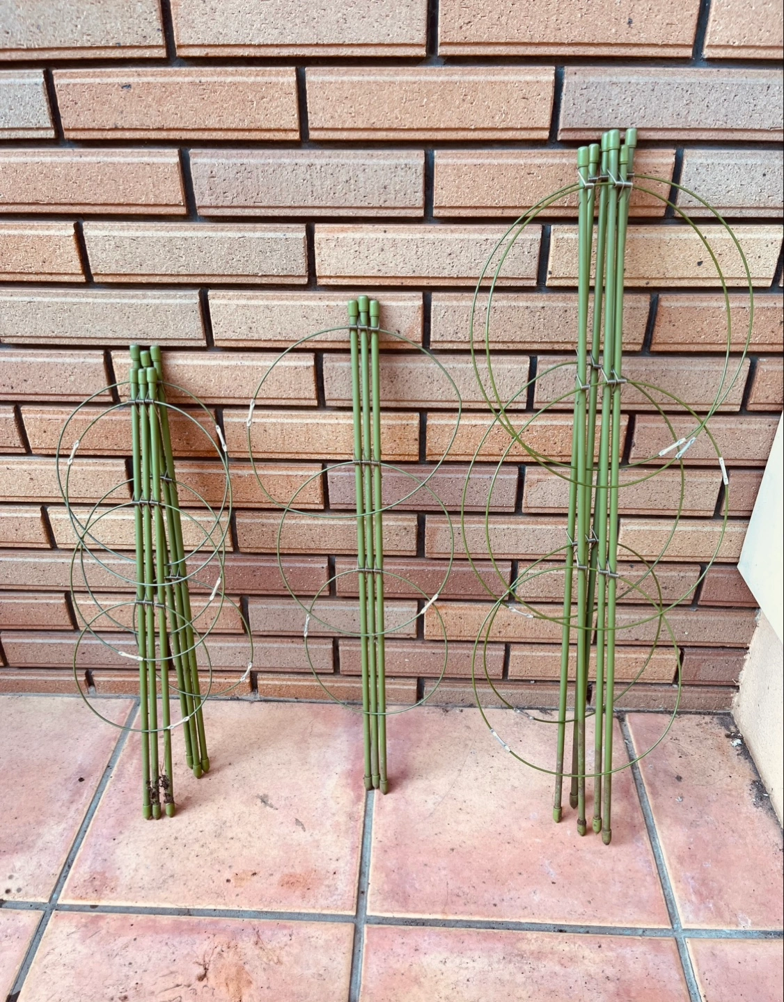 お読みくださってありがとうございます! 園芸用のリング型支柱計5個です。サイズは下記に記載します。まと めてのお渡しとさせていただけますと幸いです。 サイズ(自分でメジャーで測ったため目安になります): 高さ54cm 1番上の大きな丸の直径20cm ×2個 高さ60cm 1番上の大きな丸の直径25cm ×1個 高さ75cm 1番上の大きな丸の直径28cm ×2個 引っ越しに伴い出品します。いずれもかなり長期間庭で保管していましたので多少土汚れやリングの歪みがございます。 他にも長い1本タイプの支柱やプランターも合わせて出品しています。続くかわからないけど家庭菜園をやってみたいという方の初期投資軽減にもぴったりかと思います。ノークレーム・ノーリターンでお願いいたします。ぜひご検討いただければ幸いです。