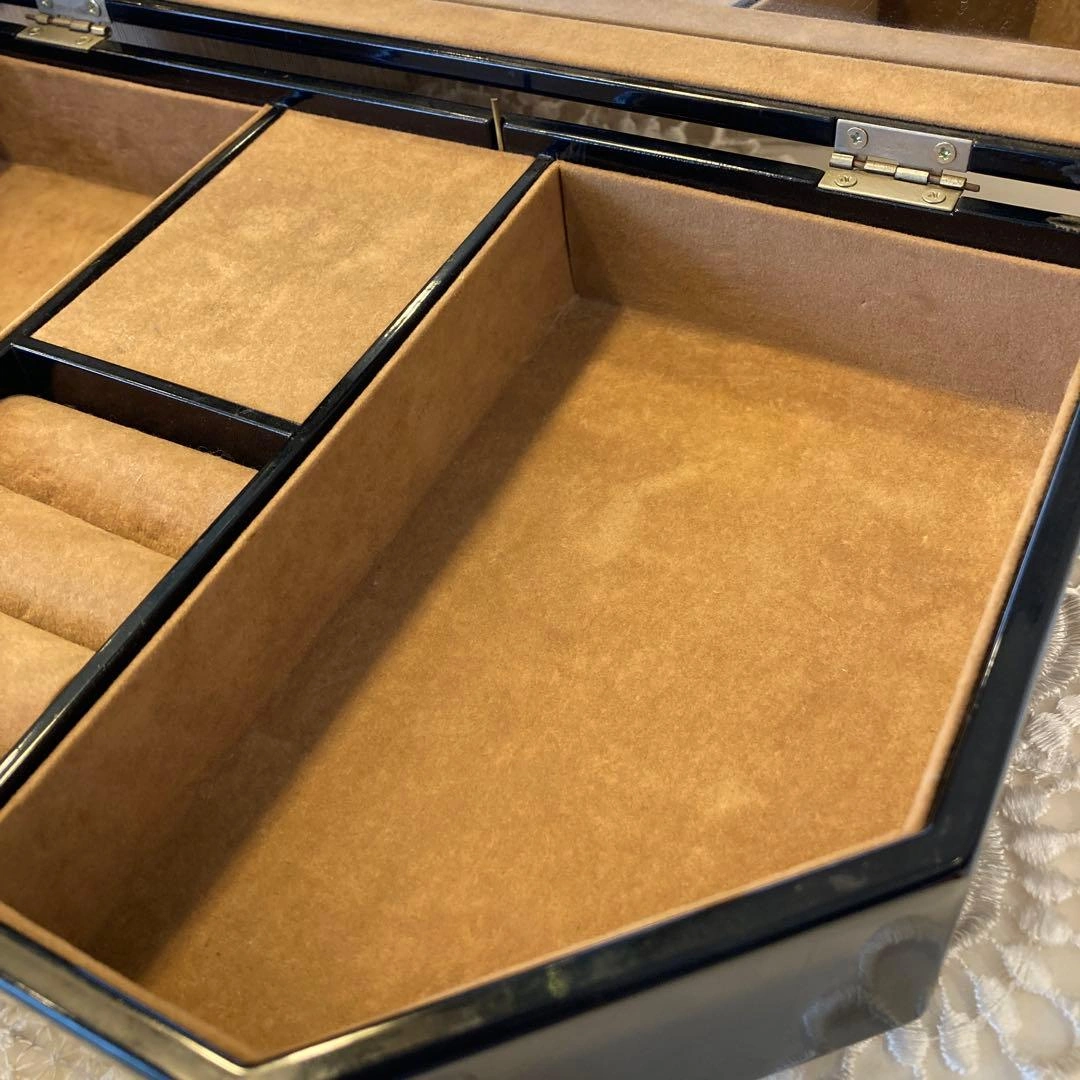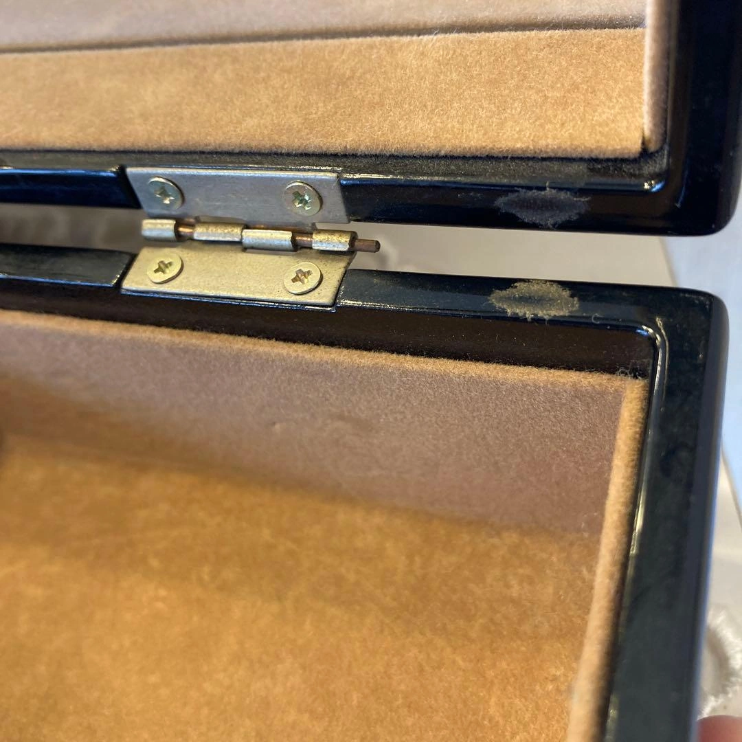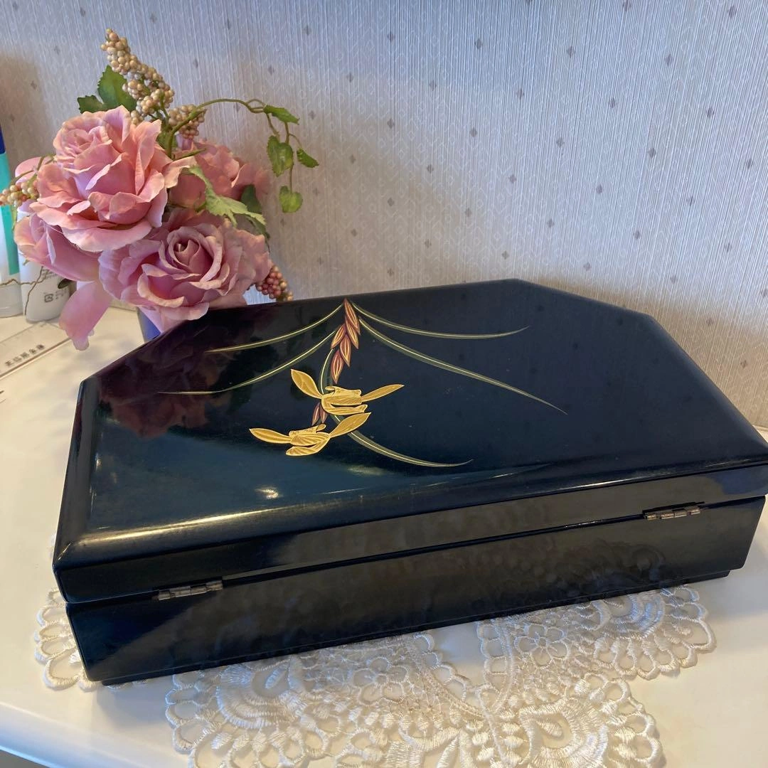黒塗り オルゴール付き宝石箱です♪ 横29縦17.5高さ8.5センチ 裏側のネジを回すと優しい音色で音楽が流れます。 外国の方へ喜ばれると思います。 目立つ傷はありませんが小傷はあります。 写真をご覧くださいませ。 ご希望の方はお気軽にご連絡ください。