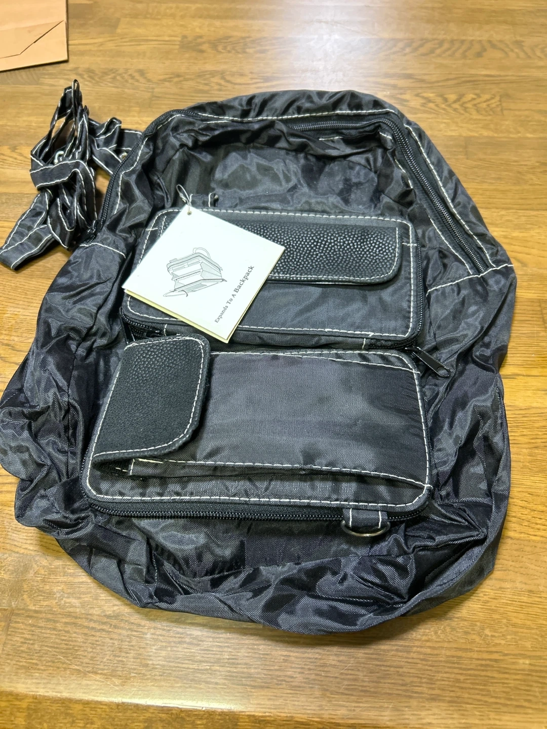 黒色の多機能バックパックです。 ・色:黒 ・素材:ナイロン系 スマホケース(大きいスマホは入りません) お財布ポーチ 携帯用リュック 長期自宅保管品ですが未使用です。 色々と使い道があって便利そうですよ。 ただ写真には写らなかったのですが リュックにすると脇にカビ?が出ています。 とても古いお品なので気づかないダメージがあるかもしれません。お安く出品させて頂きますね。ご理解の上ご購入ください。