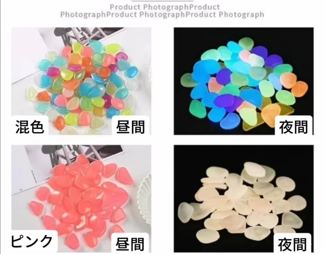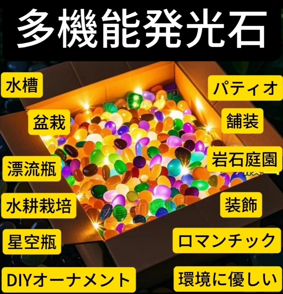 こちらは暗闇で光る石 カラフル 600個セットになります。 【商品内容】 カラー:ランダム7色(12~16枚目写真参照) サイズ:約1〜2cm/個 数量:600個/袋 重量:約315g 素材:高品質ケイ酸塩、樹脂 カスタム:100枚以上の小分けとまとめ購入に対応いたします。希望個数をコメントください、専用ページを作ります。 【商品説明】 これらの石は太陽光、ブラックライト、蛍光灯、LEDなどの光を蓄え、暗闇の中で美しく光を放つことができます。 電池や電気は不要で、環境にも優しいアイテムです。 これらの夜光石は暗闇の場所で発光し、北欧インテリアや金魚鉢、水槽、トイレ、お庭、ガーデニング、花瓶などのアクセサリーとして大変人気です。 イルミネーションやデコレーション、結婚式やパーティーなどの演出にも最適です。 アクアリウムや盆栽、金魚鉢などの場所に飾るのはもちろん、DIY用としてもお使いいただけます。 さらに、ブレスレットやネックレスなどのハンドメイド作品の材料としても素敵に活用できます。 天然樹脂製の人工石であり、無害で無臭、安全な素材です。水洗いも可能でお手入れが簡単です。 【注意事項】 ・新品未使用品ですが、大量生産による細かな傷や、パッケージ内に樹脂欠片が混入している場合がございます。ご理解いただきますようお願い申し上げます。 砂や砂利、発光する小石として、歩道や庭などにも最適です。 また、玄関や踏み石、花瓶、ガーデンなど、様々な場所でお楽しみいただけます。そして、熱帯魚の水槽や植物のアクセントとしても活躍します。ぜひ、カラフルで魅力的な夜光石をお楽しみください。